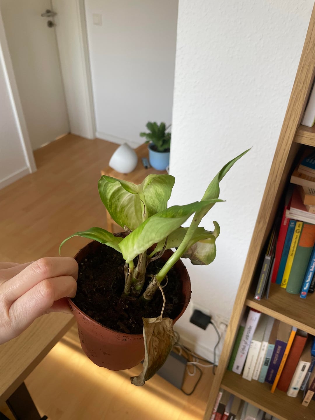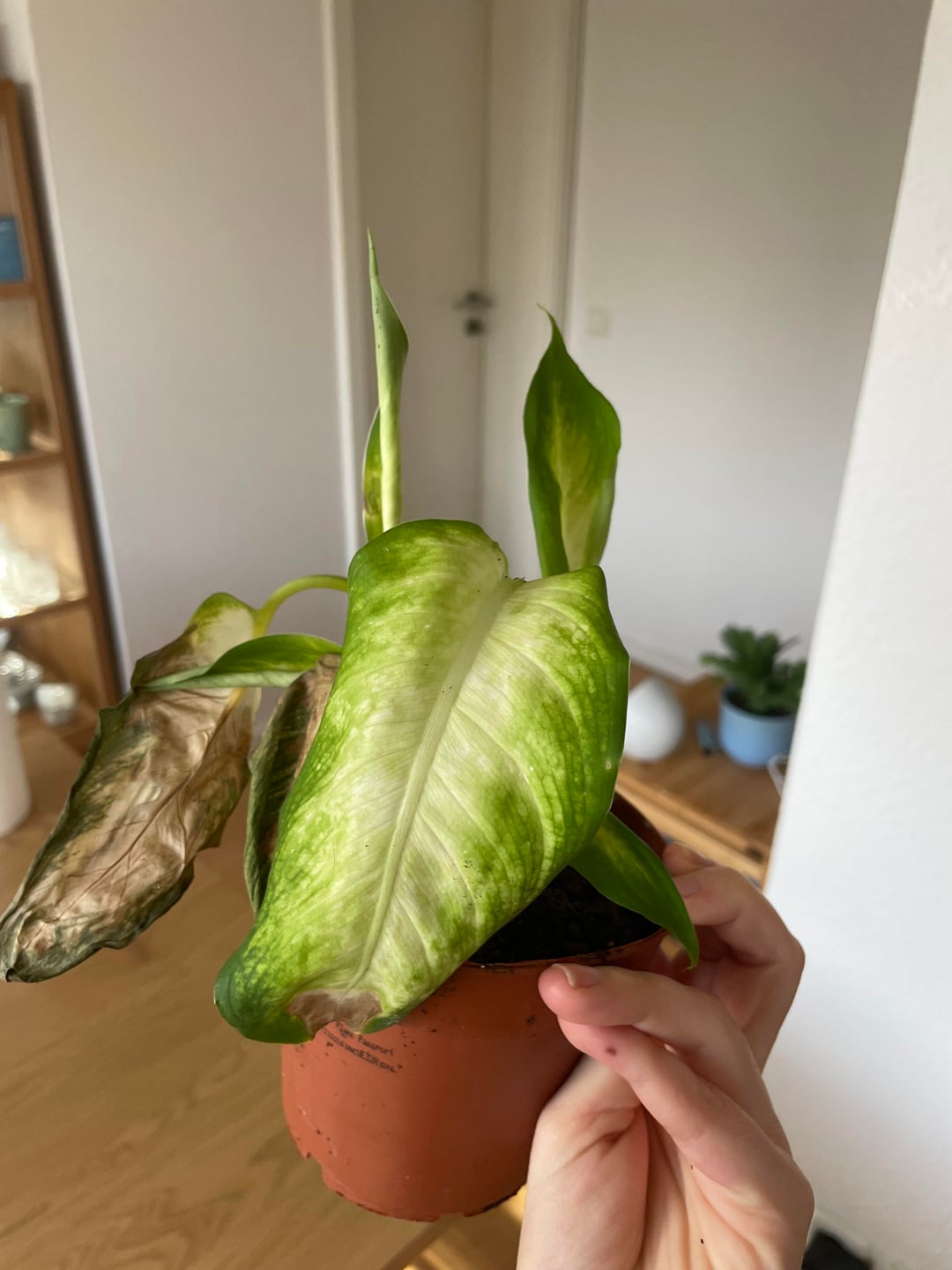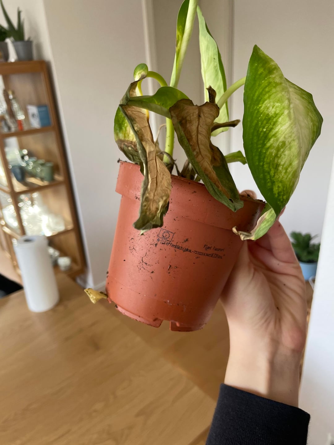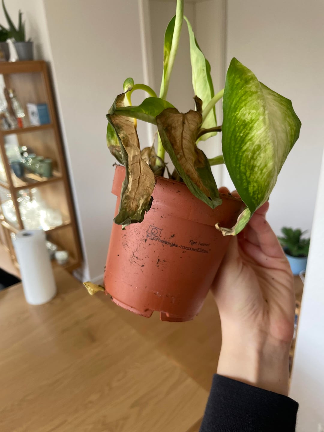 Als ich sie bekommen habe, stand sie im Vorraum direkt in der Nähe der Eingangstür. Es war Winter, sie hat also ziemlich sicher kalte Zugluft abbekommen. Außerdem war sie extrem nass. Der Topf war komplett durchfeuchtet. Ich vermute daher eine Mischung aus Kälteschock und eventuell Staunässe.