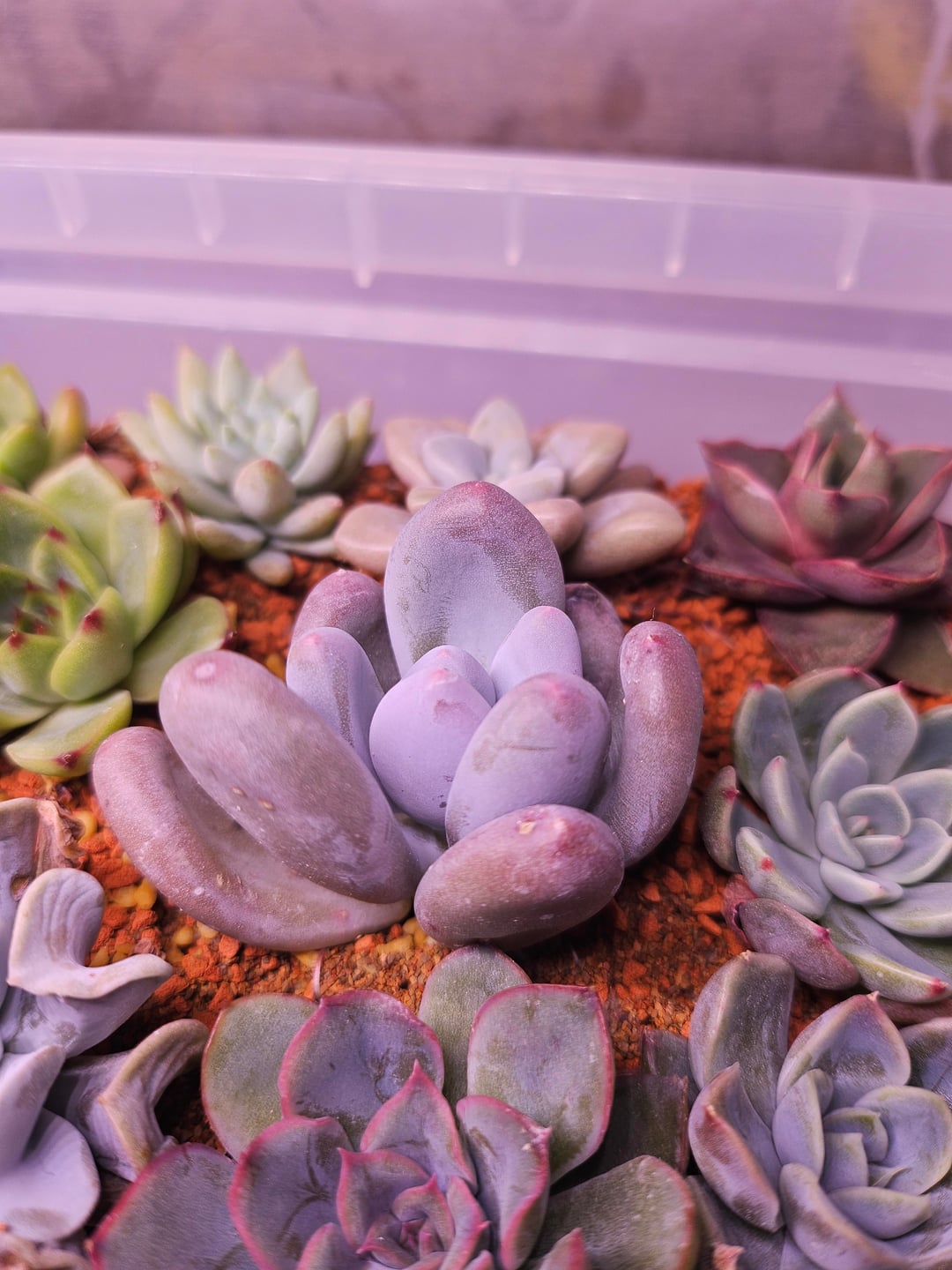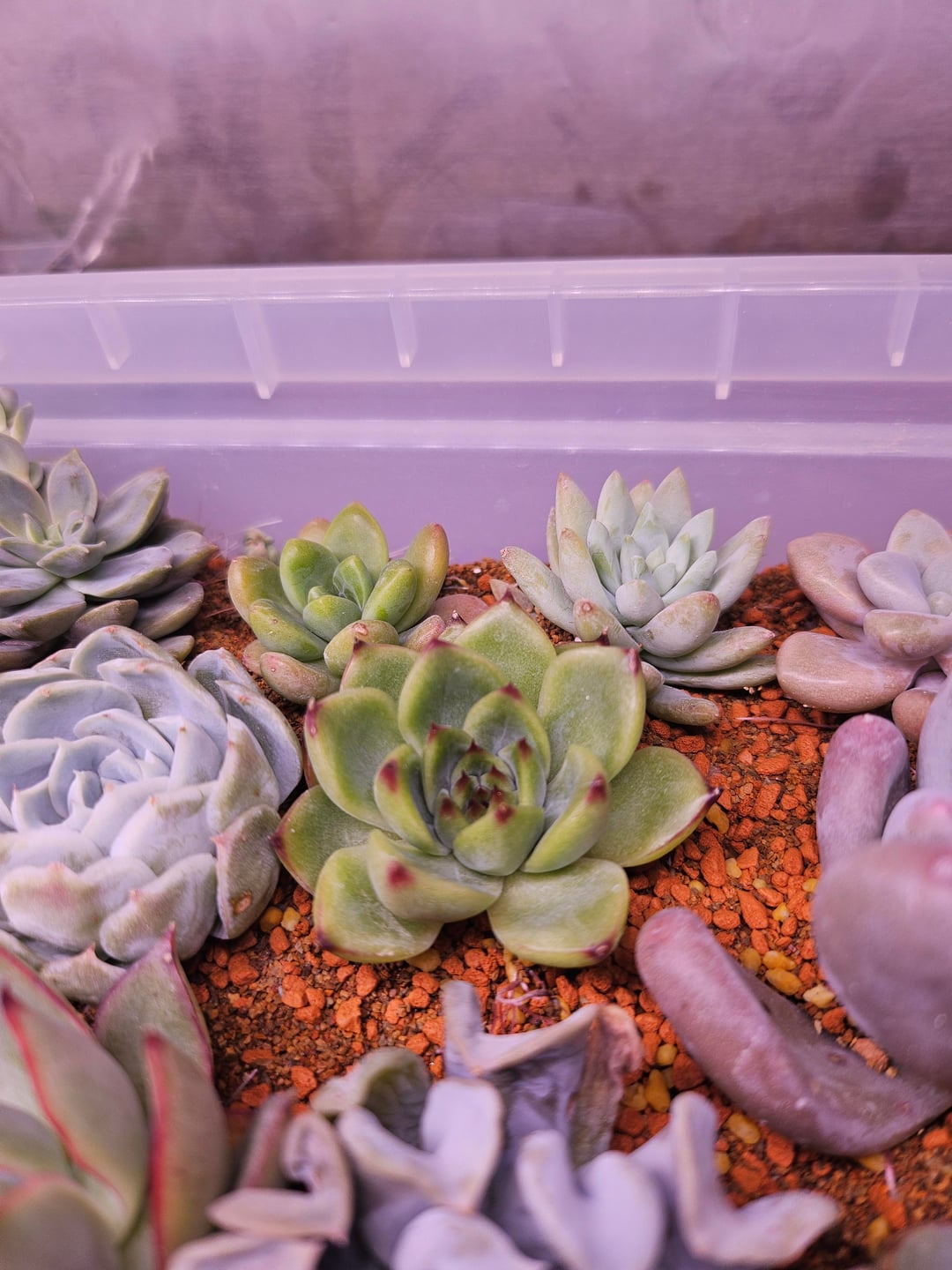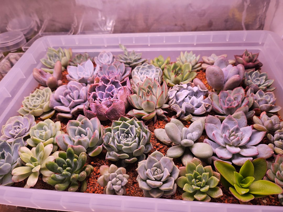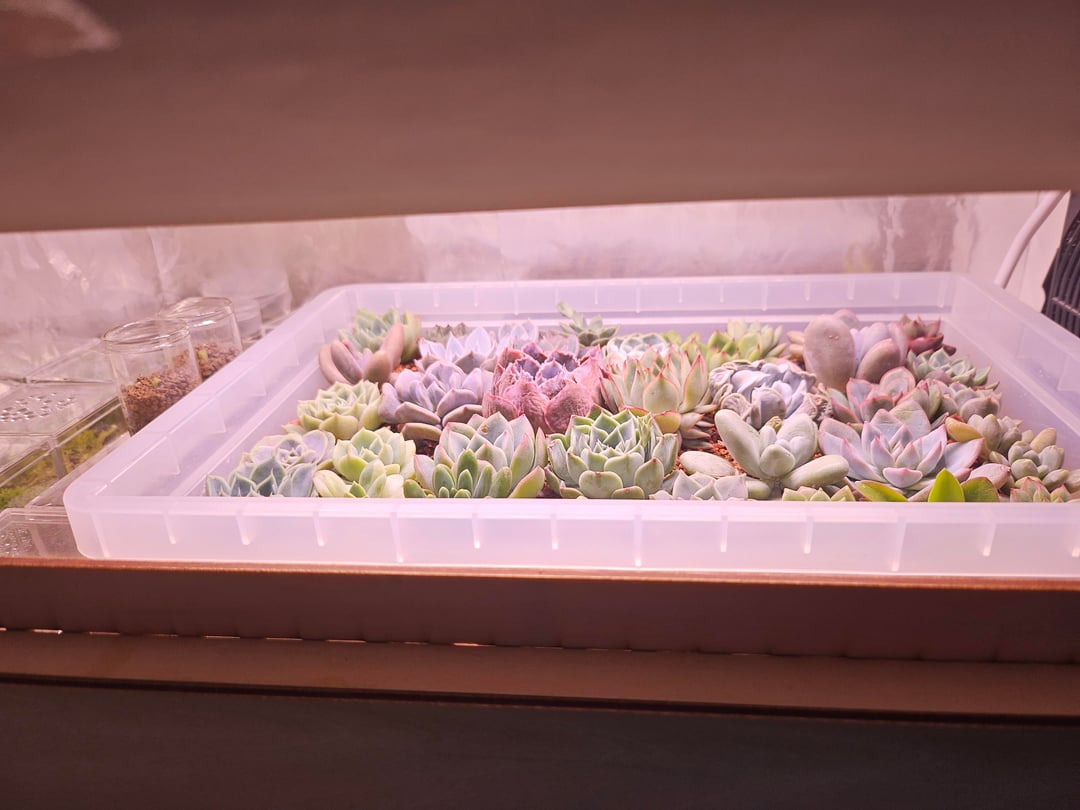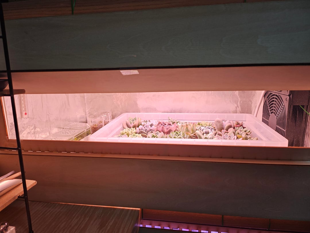 Normalerweise führen die Luftfeuchtigkeit im Freien und der tägliche Regen dazu, dass sie sofort verfaulen, und bei der oft prallen Sonne werden die Wurzeln bedampft. Deshalb muss ich es drinnen anbauen. Der Winter ist so deprimierend und düster, leblos und ich habe eine kleine Wachstumskammer eingerichtet, um die Sukkulenten zu züchten. Es gibt ein Licht, einen Ventilator und Reflektoren. Ich habe es so gestaltet, dass es perfekt in das Bücherregal passt und eine gute Belüftung bietet. Es gibt eine Sichtöffnung mit UV-Filterglas, da das Growlight etwas UV enthält. fast wie ein Raumschiffgefühl. Gerne können Sie auch Ihre Sukkulenten teilen!