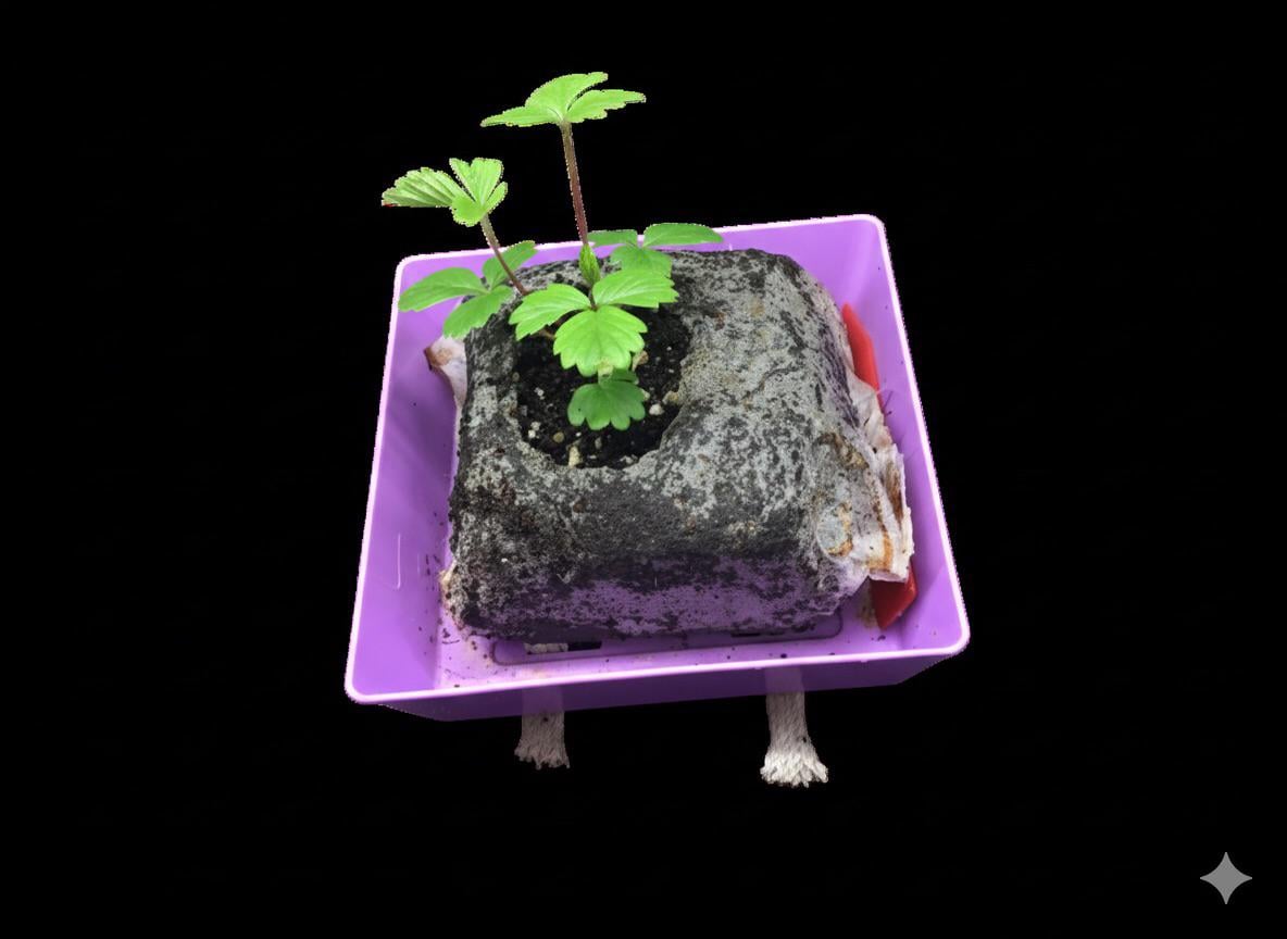 Ich teste eine neue Art, Alpenerdbeeren anzubauen. Die Pflanze ist Fragaria vesca ‘Waldsteinchen’. Es ist auch als „Mini Red“ bekannt, weil es kleiner als ein typischer Alpenfisch ist. Sie keimte und wuchs zunächst in einem Aerogarden und wurde kürzlich in einen 80-mm-Jiffy-Kokos-Growblock verpflanzt. Es ist in einer 5" x 5" Micro-Greens-Tablett mit zwei Baumwolldochten, die in die Löcher des Tabletts eingewebt sind. Wenn das kleine Tablett in ein größeres Tablett gestellt wird, ist es selbstbewässernd. Ein flaches 1020-Tablett bietet Platz für 8 dieser kleinen Tabletts.