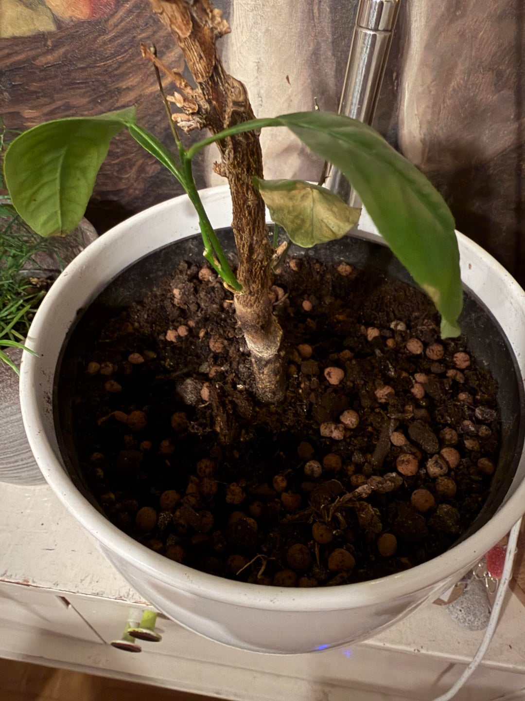 Ist er noch zu retten? Ich habe alles probiert: umtopfen, mehr Granulat in der Erde, Pflanzenlampe – nichts hilft… Er hat fast alle seine Blätter verloren, und jetzt sind die letzten alle drei schon mit braunen Stellen versehen.