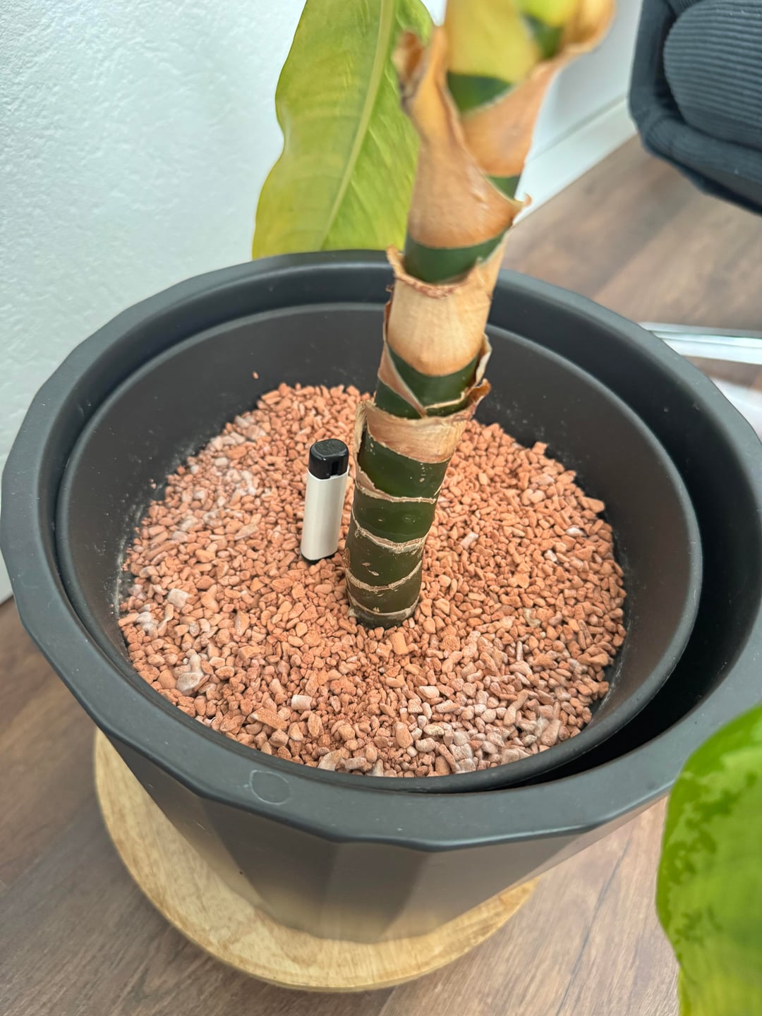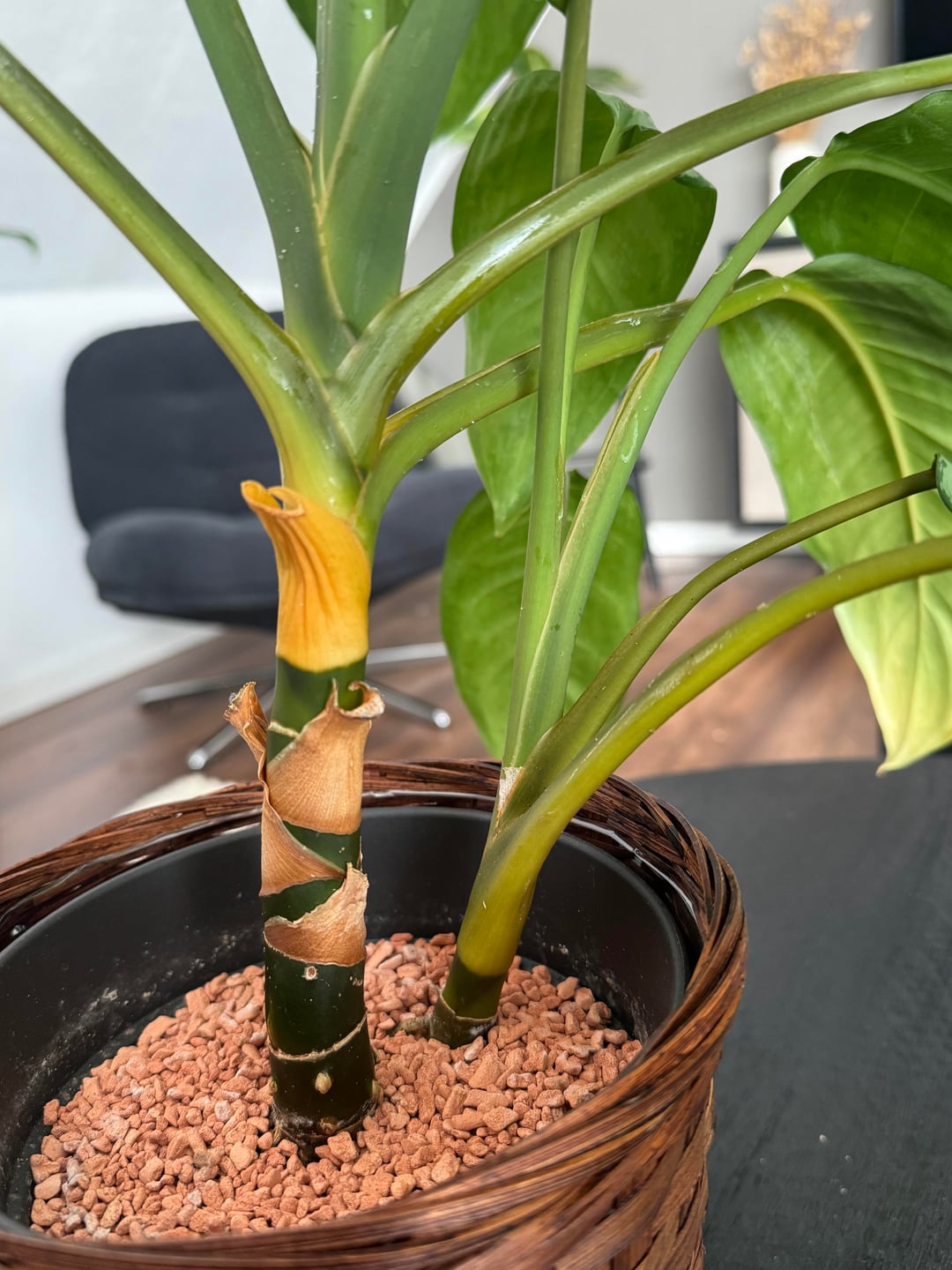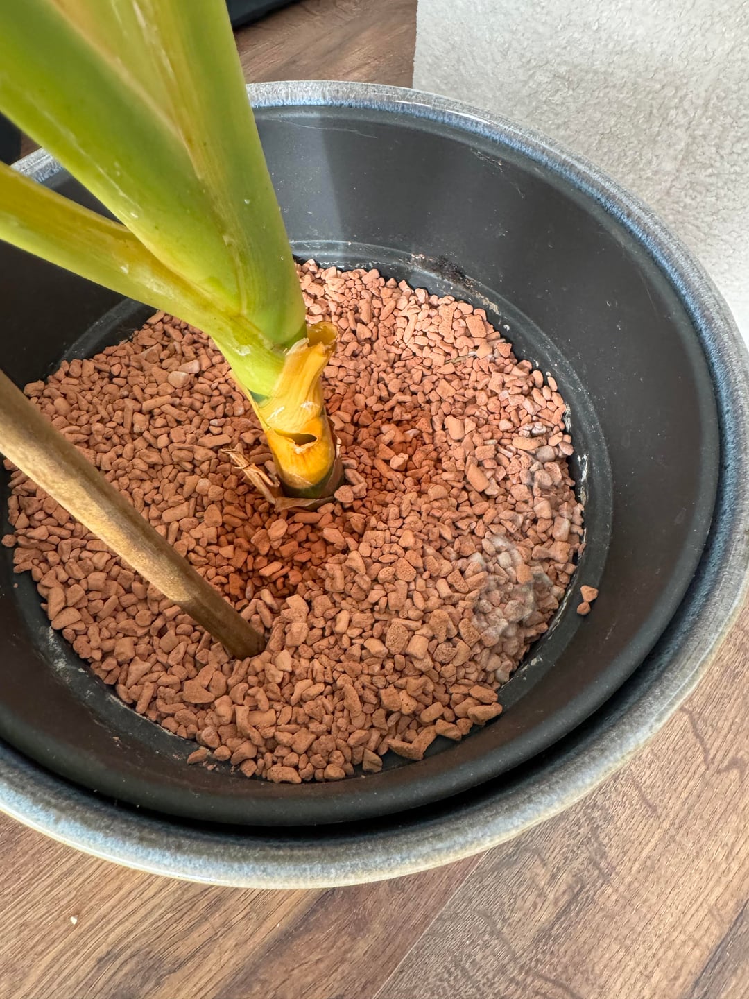 ich hab so vor mindestens einem haben Jahr in dieses Granulat umgepflanzt (erde hatte schimmel und trauermücken) ich gieße sie weniger als einmal die woche und sie steht weder in direkter sonne noch an der heizung