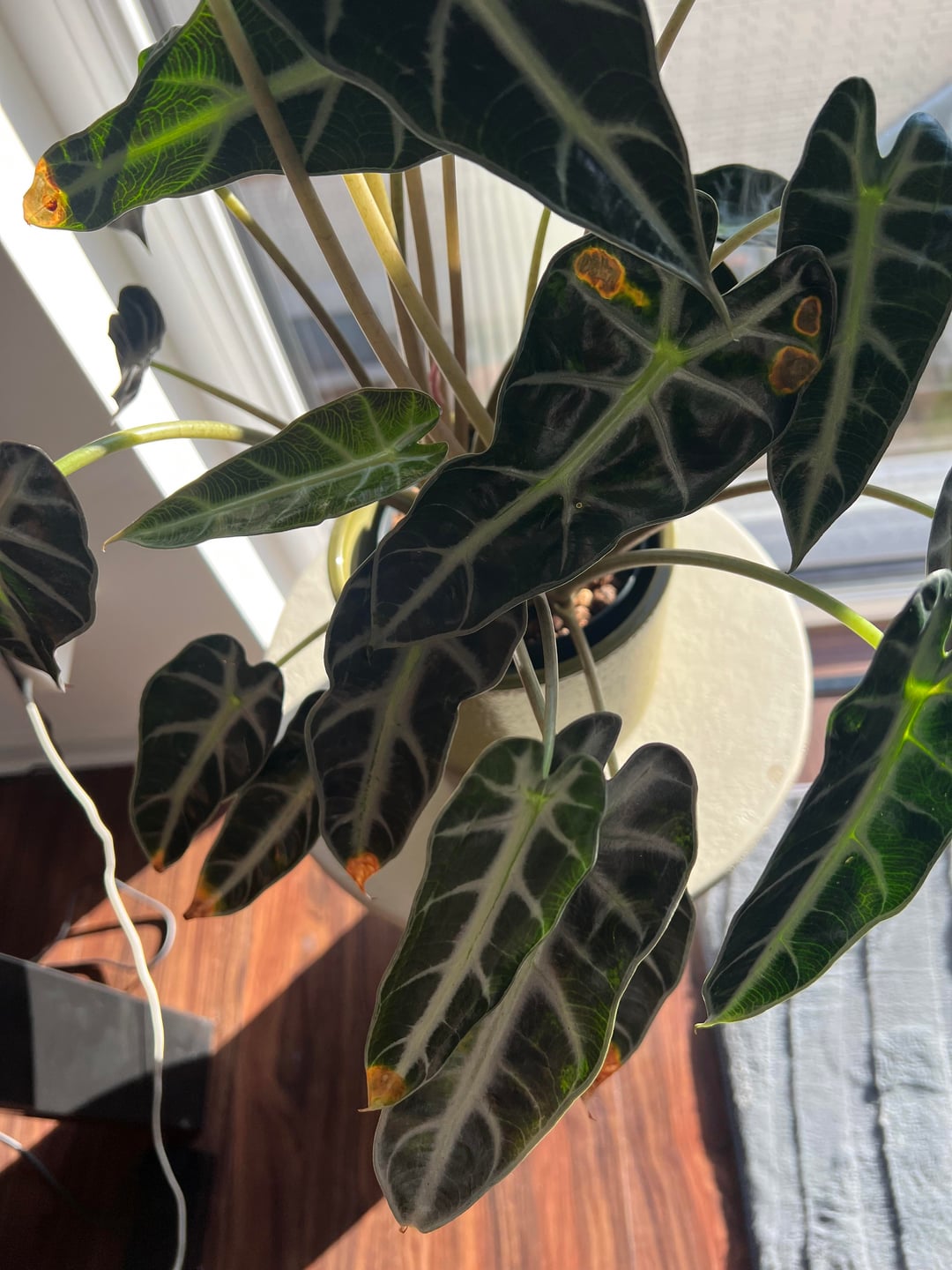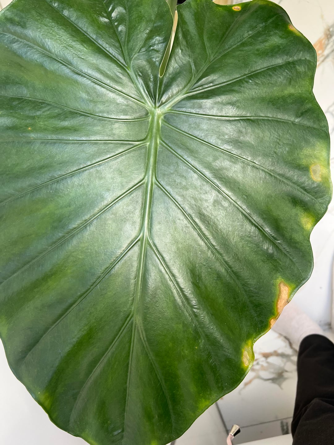 Beide Pflanzen haben über den Winter gelbe Flecken bekommen. Ich gieße sie einmal pro Woche, immer dann, wenn die Erde trocken erscheint. Dabei achte ich darauf, dass sie nie im Wasser stehen. Schädlinge sind nicht vorhanden.