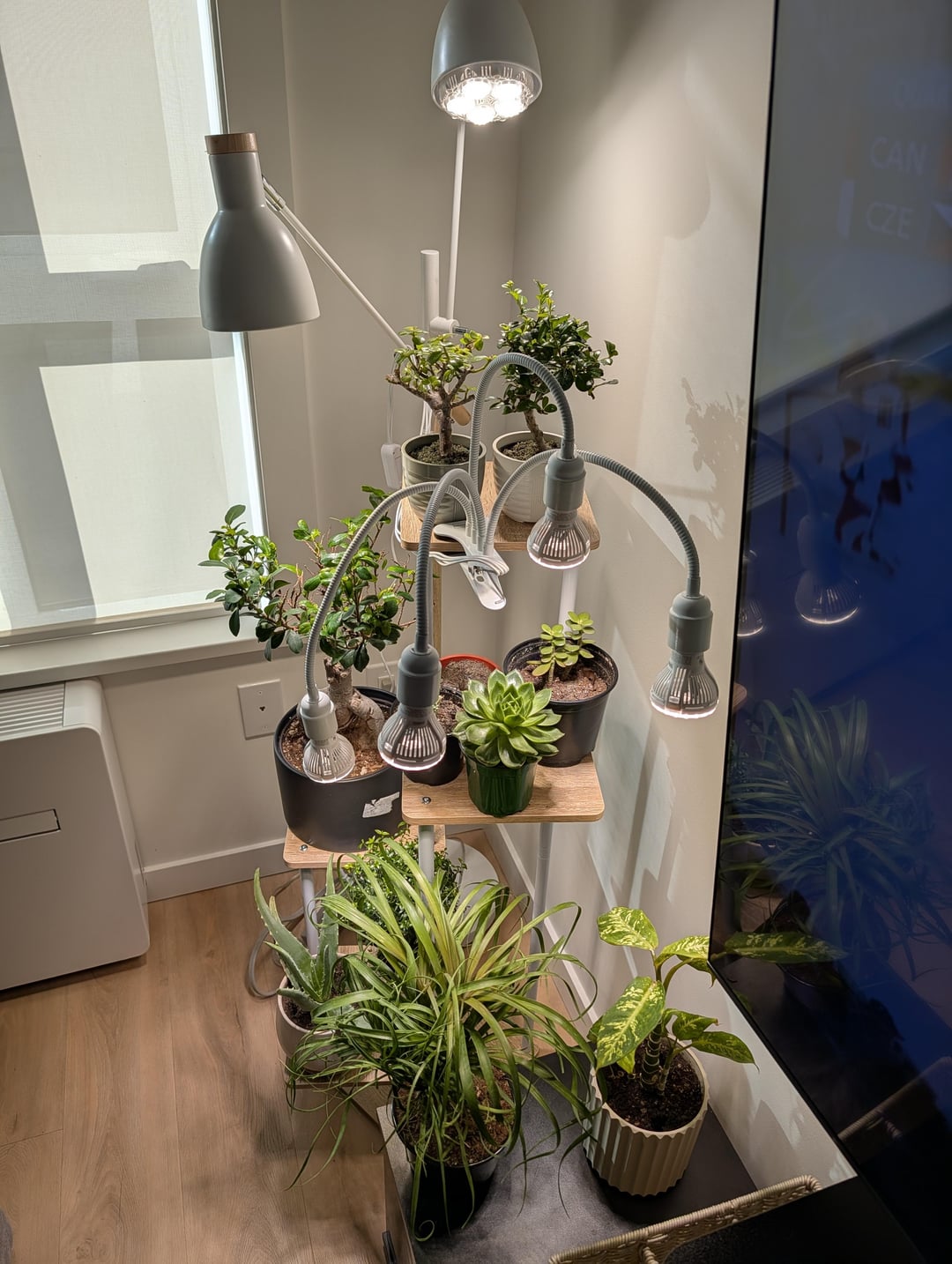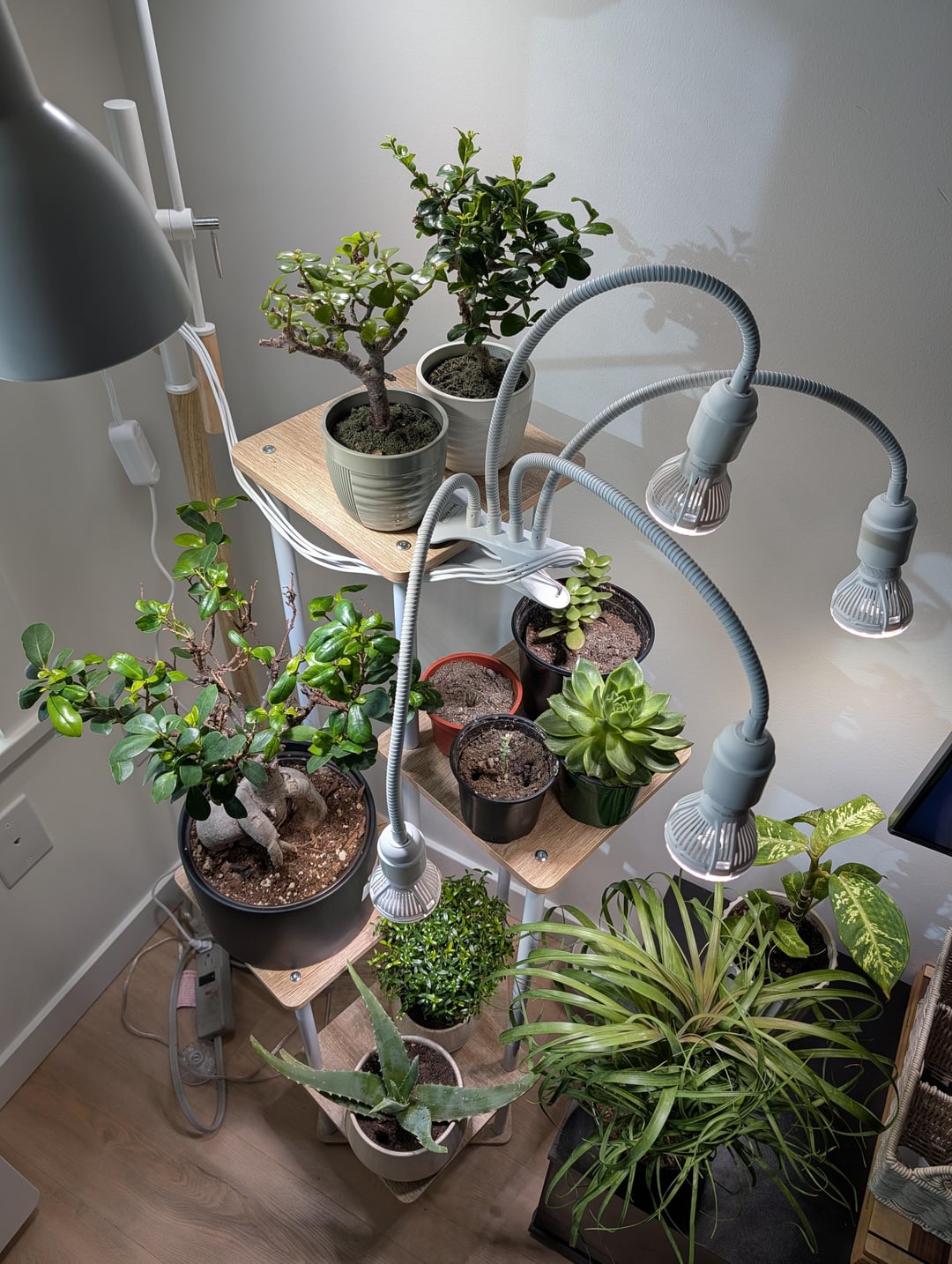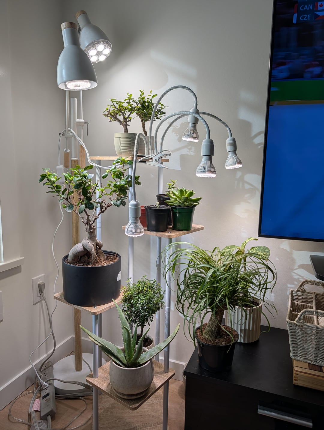 Das ist mein neues Licht-Setup seit heute. Es sind alles Sansi-Wachstumslampen. Ich habe 4 LEDs mit 10 W, 1 LED mit 24 W oben und 1 LED mit 32 W für den großen Ficus Ginseng. Die Lichter sind täglich ca. 13–14 Stunden an. Pflanzen von der oberen Plattform aus: Fukien-Teebonsai, Zwerg-Jadebonsai/Echeveria, 3 kleine Sukkulenten-Requisiten/Ficus Ginseng/Ponypalme, Dieffenbachia/Aloe Vera, Myrtenformschnitt.