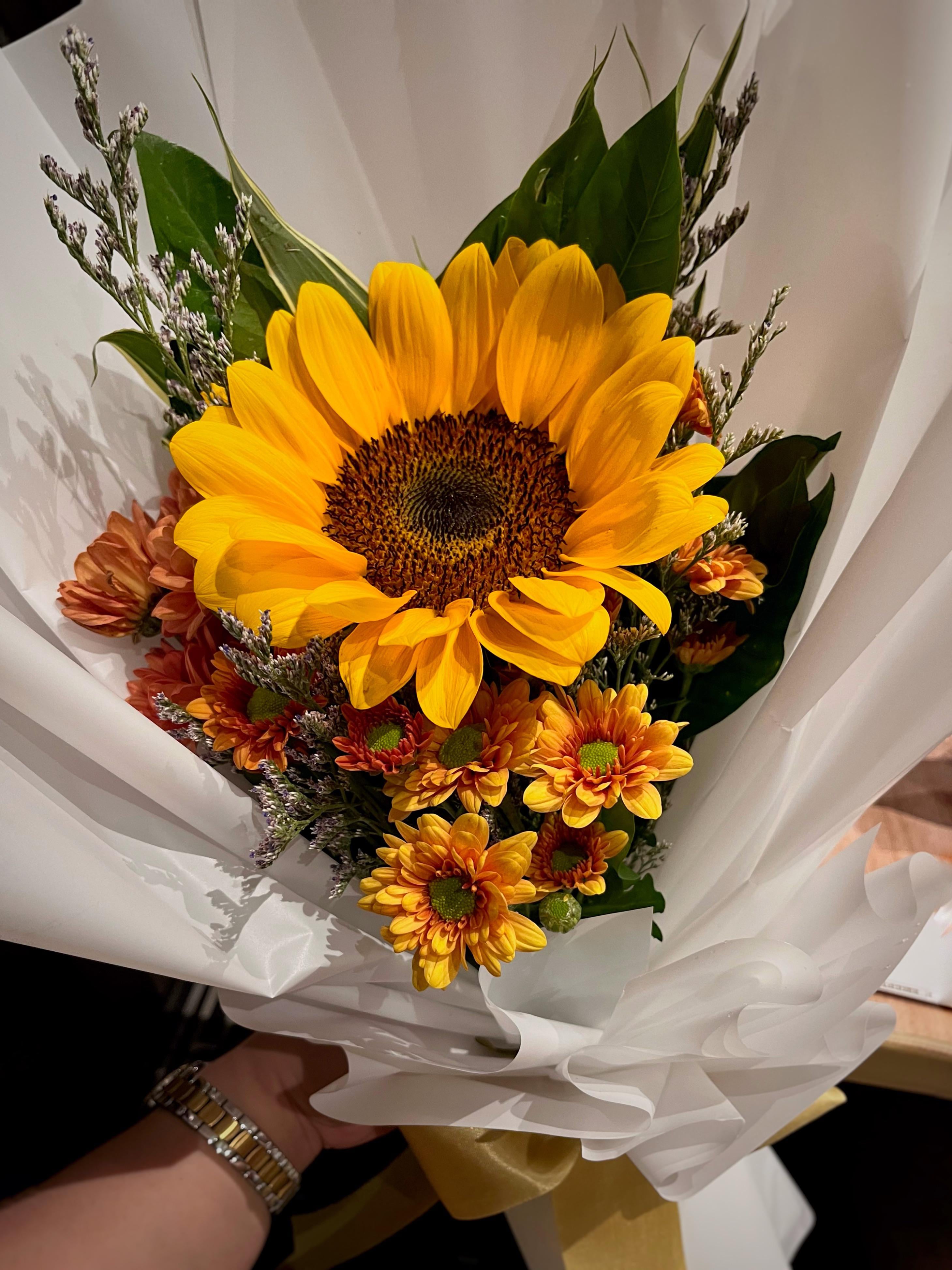 Zunächst gab es nur wenige Stängel vom Samstagsmarkt, weil sie erschwinglich waren. Dann ein vorbestelltes Blumenhäkeln, weil er meinte, sie würden wenigstens nicht verwelken und praktisch sein wollen. Und jetzt, am Valentinstag, kaufte er für mich einen frischen Strauß Sonnenblumen.