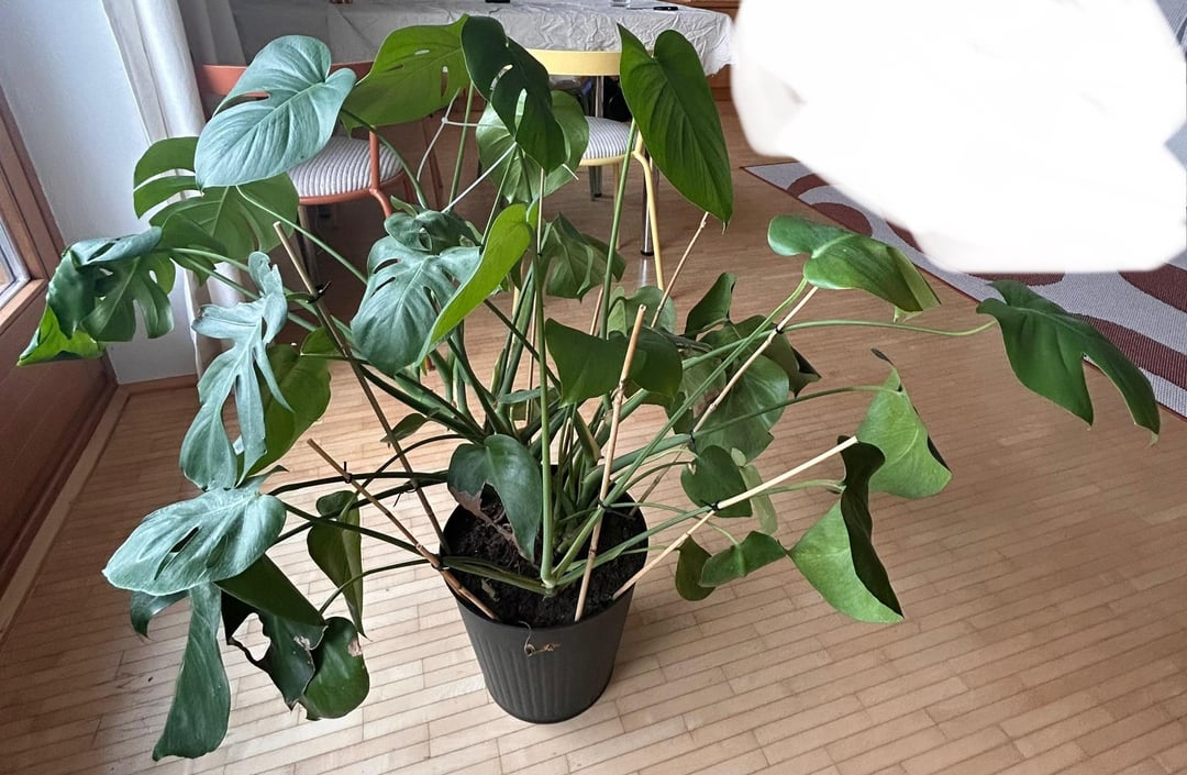 meine Monstera wächst in alle Richtungen, nur nicht schön. Blätter hier, Luftwurzel da, Chaos überall.