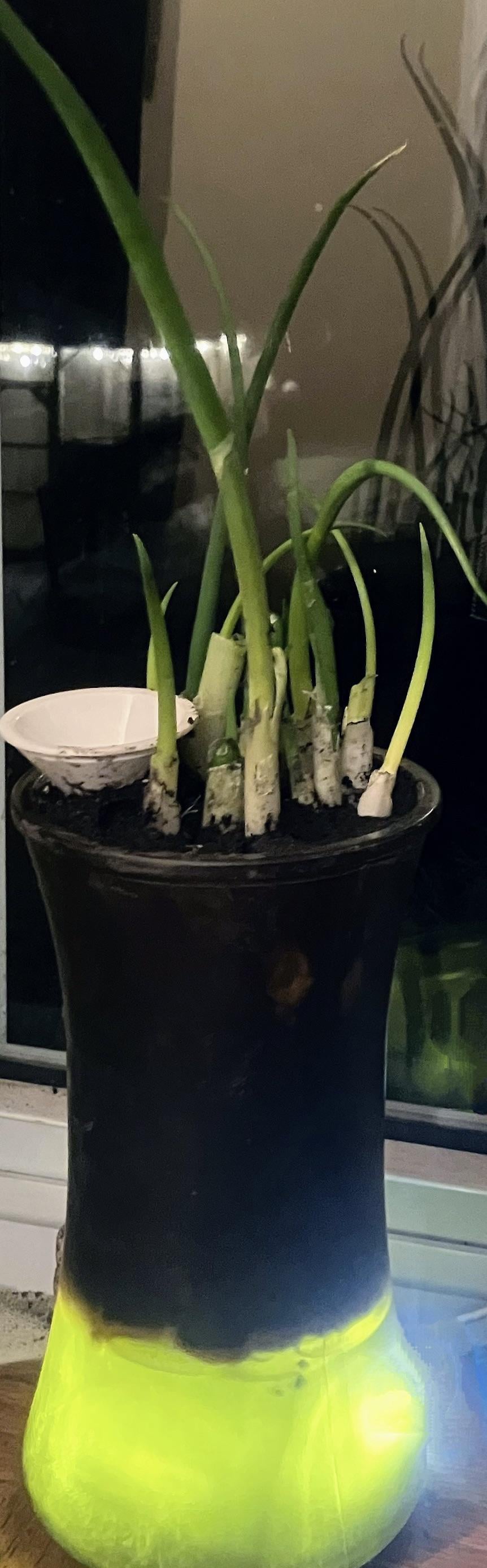 Ich habe es erst neulich gemacht und heute habe ich es mit insgesamt 14 Frühlingszwiebelpflanzen fertiggestellt. Was denkst du? Ich habe eine Taschenlampe benutzt, um das Wasserreservoir zu zeigen. Es handelt sich lediglich um gekaufte Frühlingszwiebeln