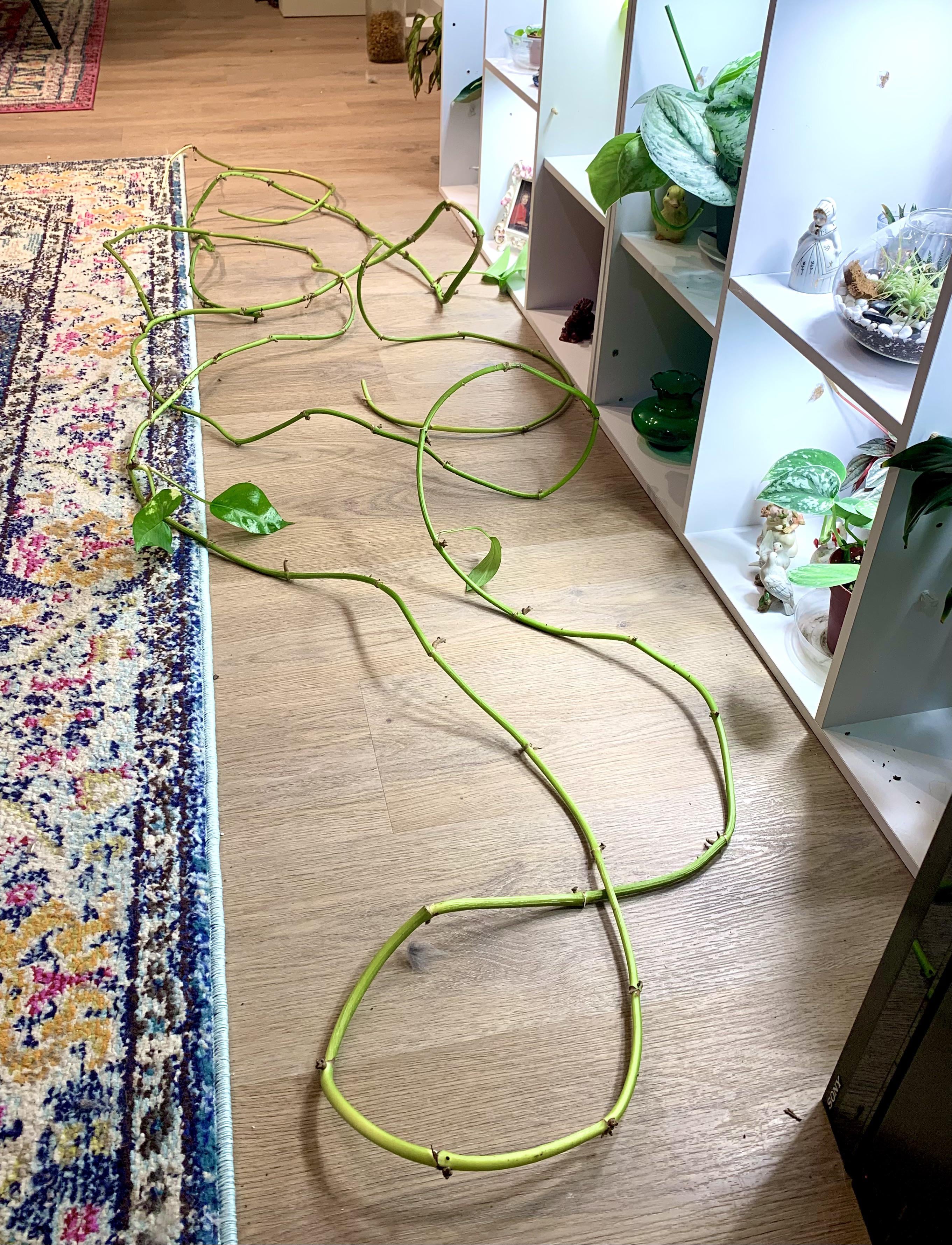 Ich wurde gebeten, … den stark vernachlässigten Pothos meiner Eltern aufzuräumen, den mein Vater offenbar seit Jahren zusammengerollt hat (aber nie gegen den Boden, um ihn zum Wurzeln zu ermutigen). Wie Sie sich vorstellen können, war sie ziemlich kahlköpfig und hatte mehr Füße als Blätter.