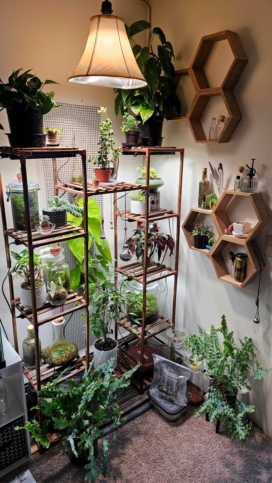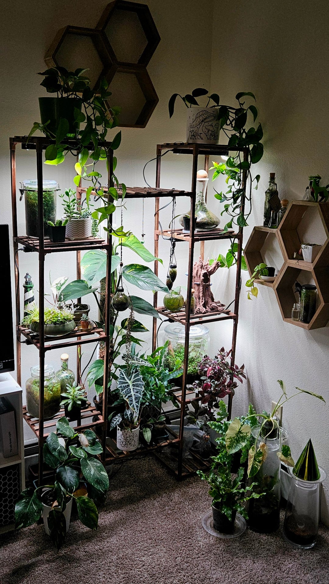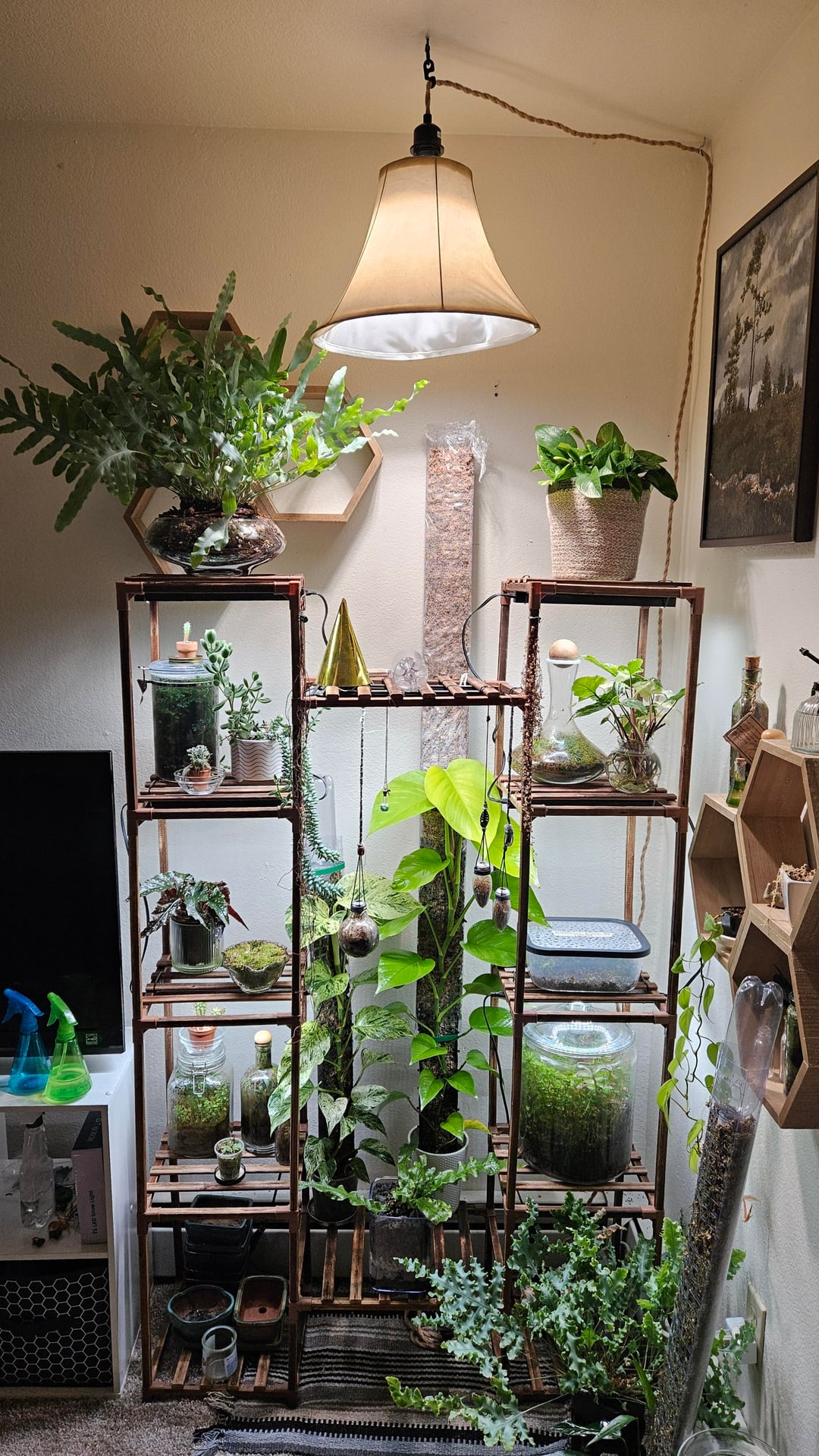 Es entwickelt sich ständig weiter, ehrlich gesagt. Manchmal ist es voller, manchmal spärlicher, während ich Dinge zurückschneide und vermehre. Einige Pflanzen werden in andere Gebiete verlegt. es ist alles ein Prozess. Es durchläuft Phasen des Hässlichen und Zustände des Üppigen und Schönen. 5 und 6 gehören immer noch zu meinen Lieblingsfotos, da alles so voll aussah, aber ich habe danach etwas verkleinert und Pflanzen entfernt, die für mich nicht gut wuchsen. Und dann habe ich alle meine hängenden Pothos zurückgeschnitten, da sie Schädlinge hatten und es einfacher war, sie in viele Stücke zu schneiden, als zu versuchen, jeden Winkel und jede Ritze zu reinigen, die sich um das ganze Regal schlängelte.