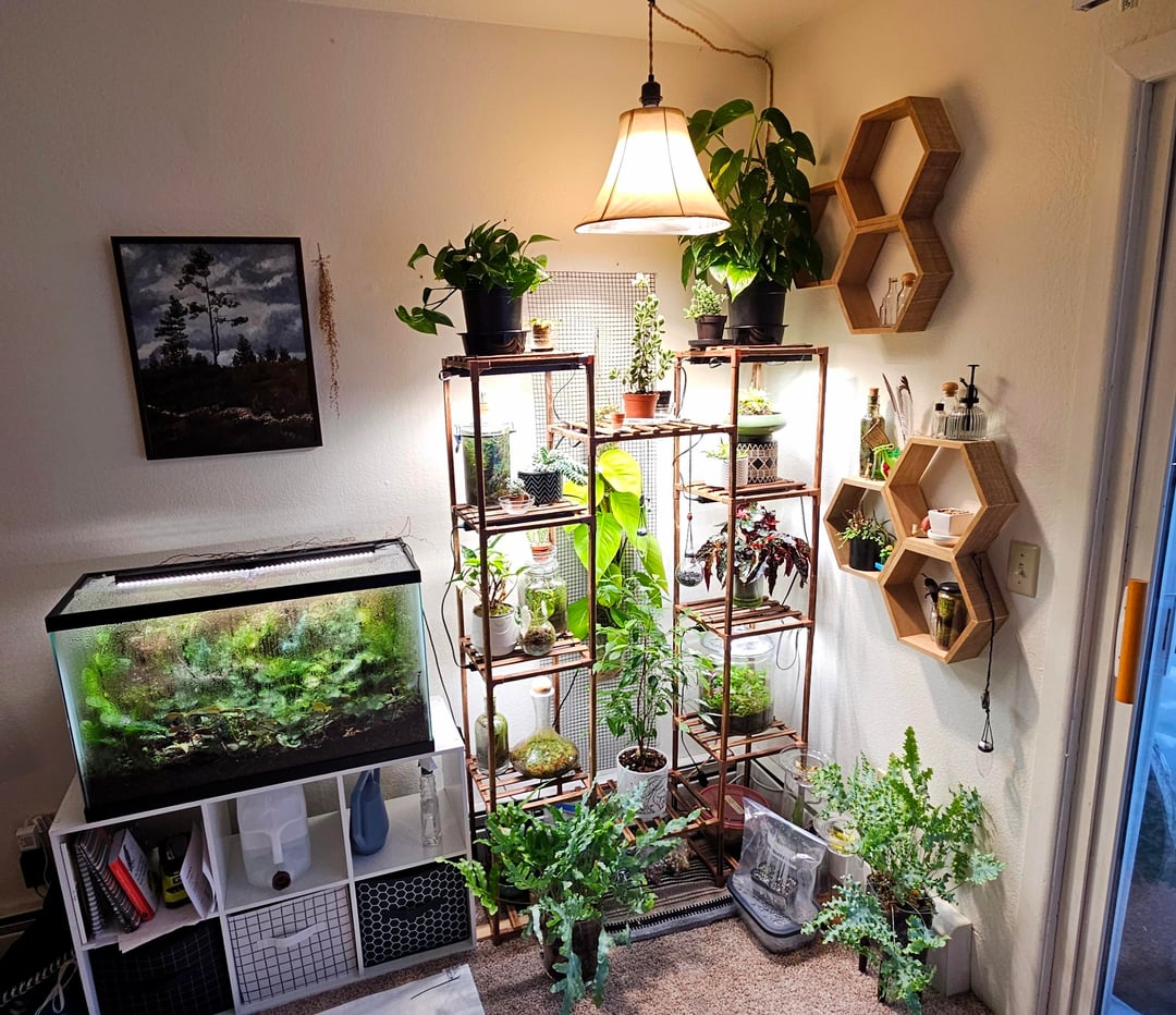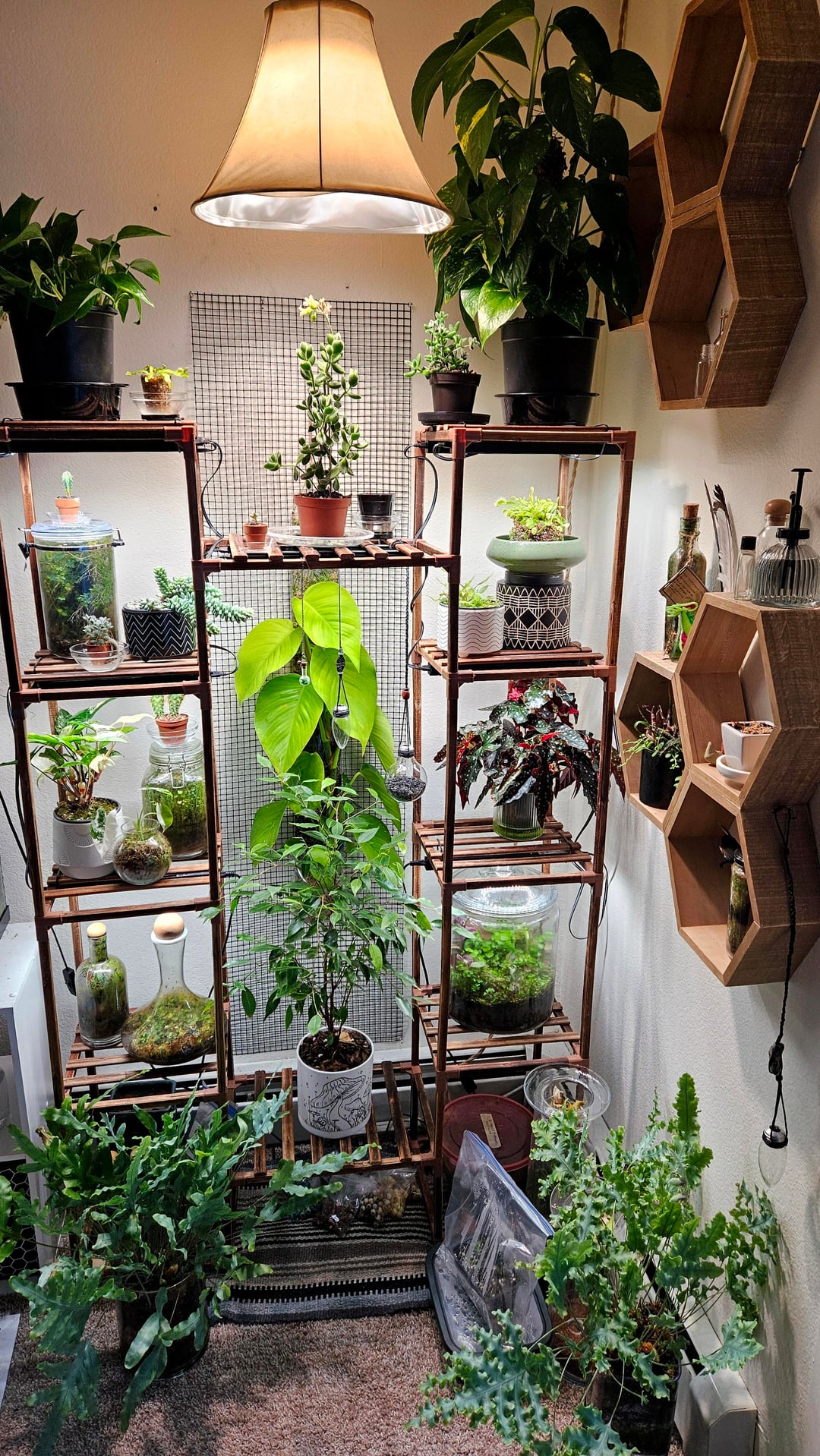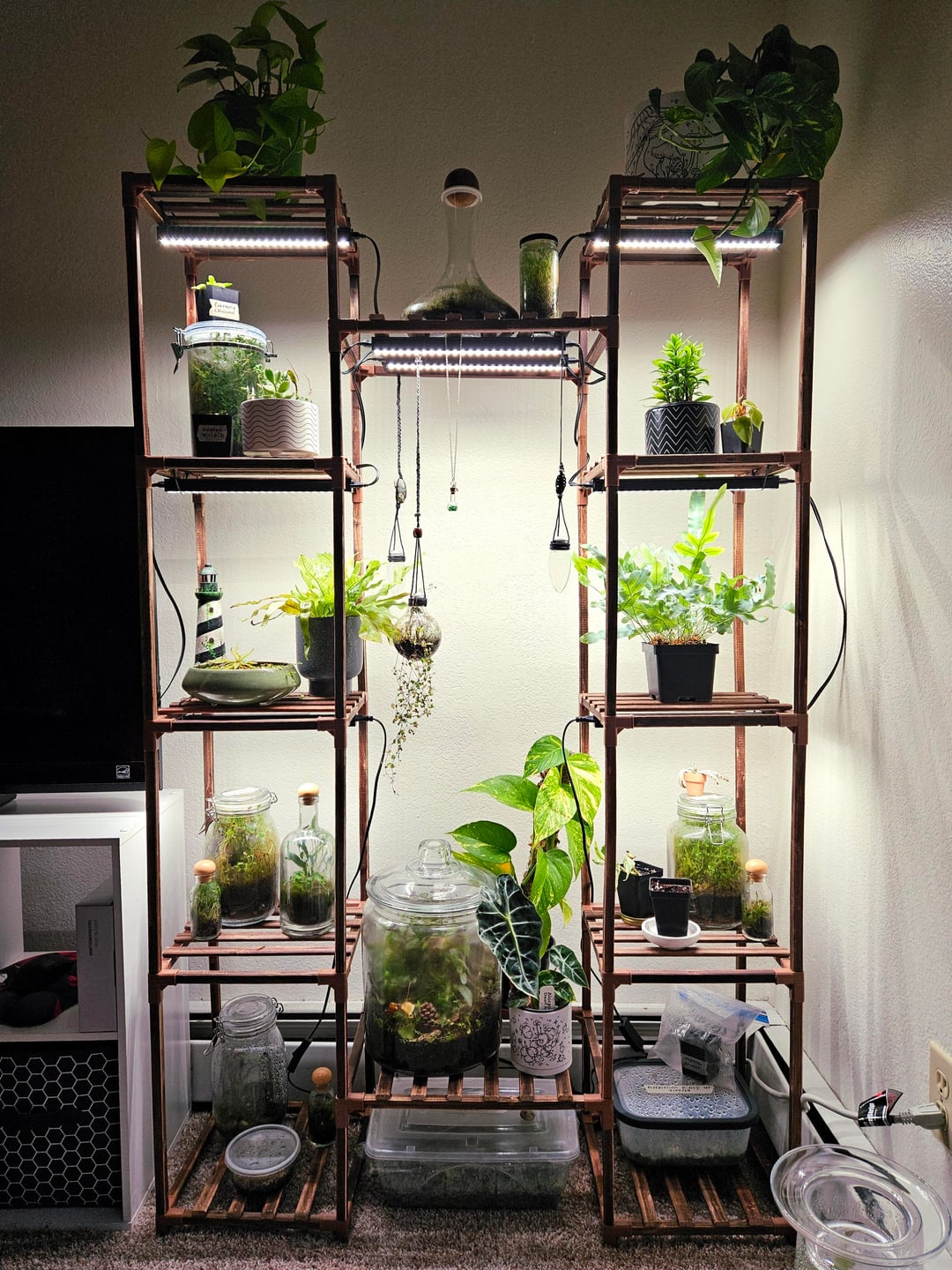 Es entwickelt sich ständig weiter, ehrlich gesagt. Manchmal ist es voller, manchmal spärlicher, während ich Dinge zurückschneide und vermehre. Einige Pflanzen werden in andere Gebiete verlegt. es ist alles ein Prozess. Es durchläuft Phasen des Hässlichen und Zustände des Üppigen und Schönen. 5 und 6 gehören immer noch zu meinen Lieblingsfotos, da alles so voll aussah, aber ich habe danach etwas verkleinert und Pflanzen entfernt, die für mich nicht gut wuchsen. Und dann habe ich alle meine hängenden Pothos zurückgeschnitten, da sie Schädlinge hatten und es einfacher war, sie in viele Stücke zu schneiden, als zu versuchen, jeden Winkel und jede Ritze zu reinigen, die sich um das ganze Regal schlängelte.