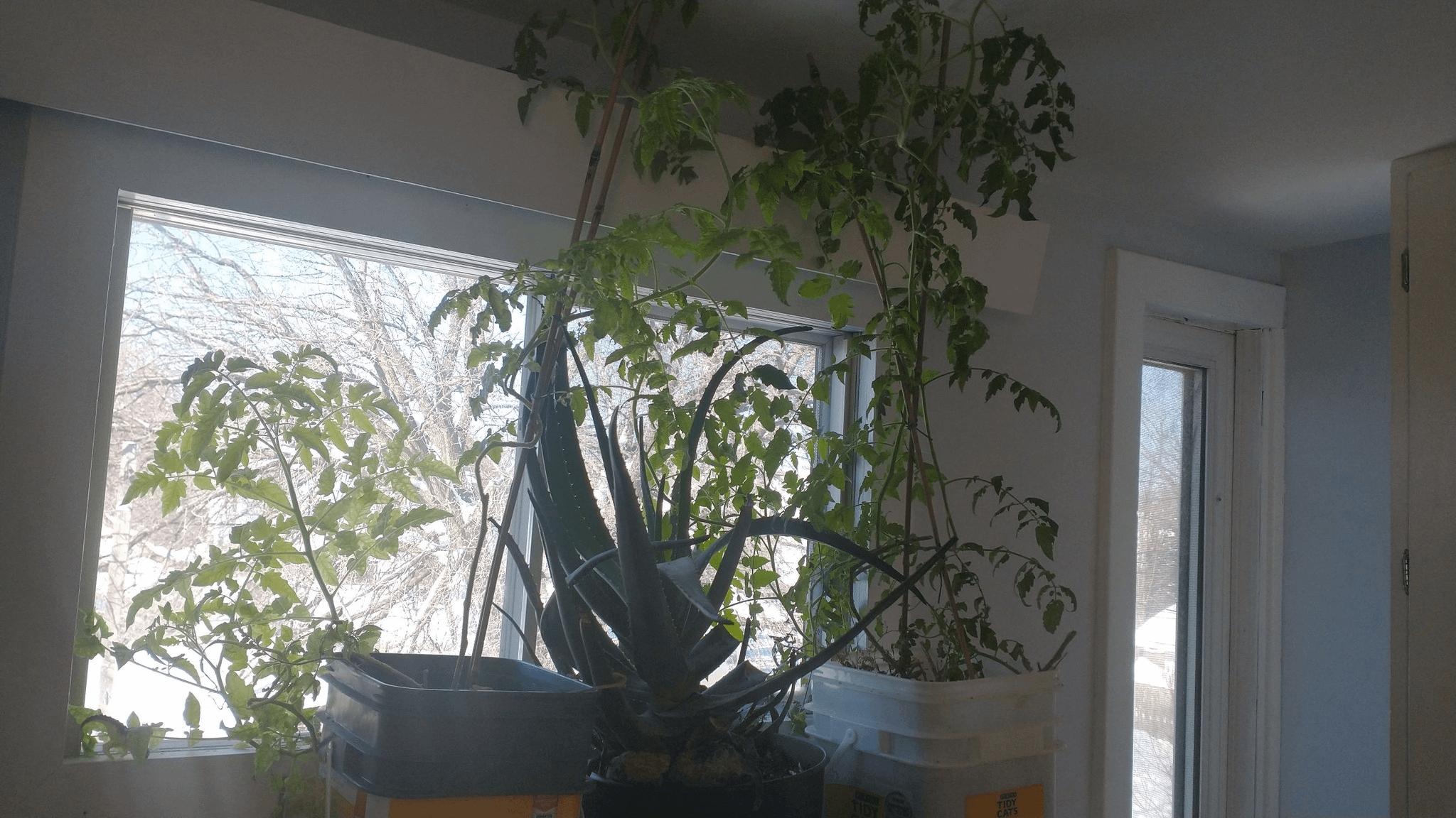 Ich habe meine Container-Kirschtomaten und gelben Pflaumentomaten Ende letzten Sommers ins Haus gebracht. Ich befinde mich in Zone 2B und alle meine Wachstumslampen sind bei mir ausgefallen, also sind sie wieder ausgefallen und sehr langbeinig geworden. Aber jetzt blühen sie wieder!