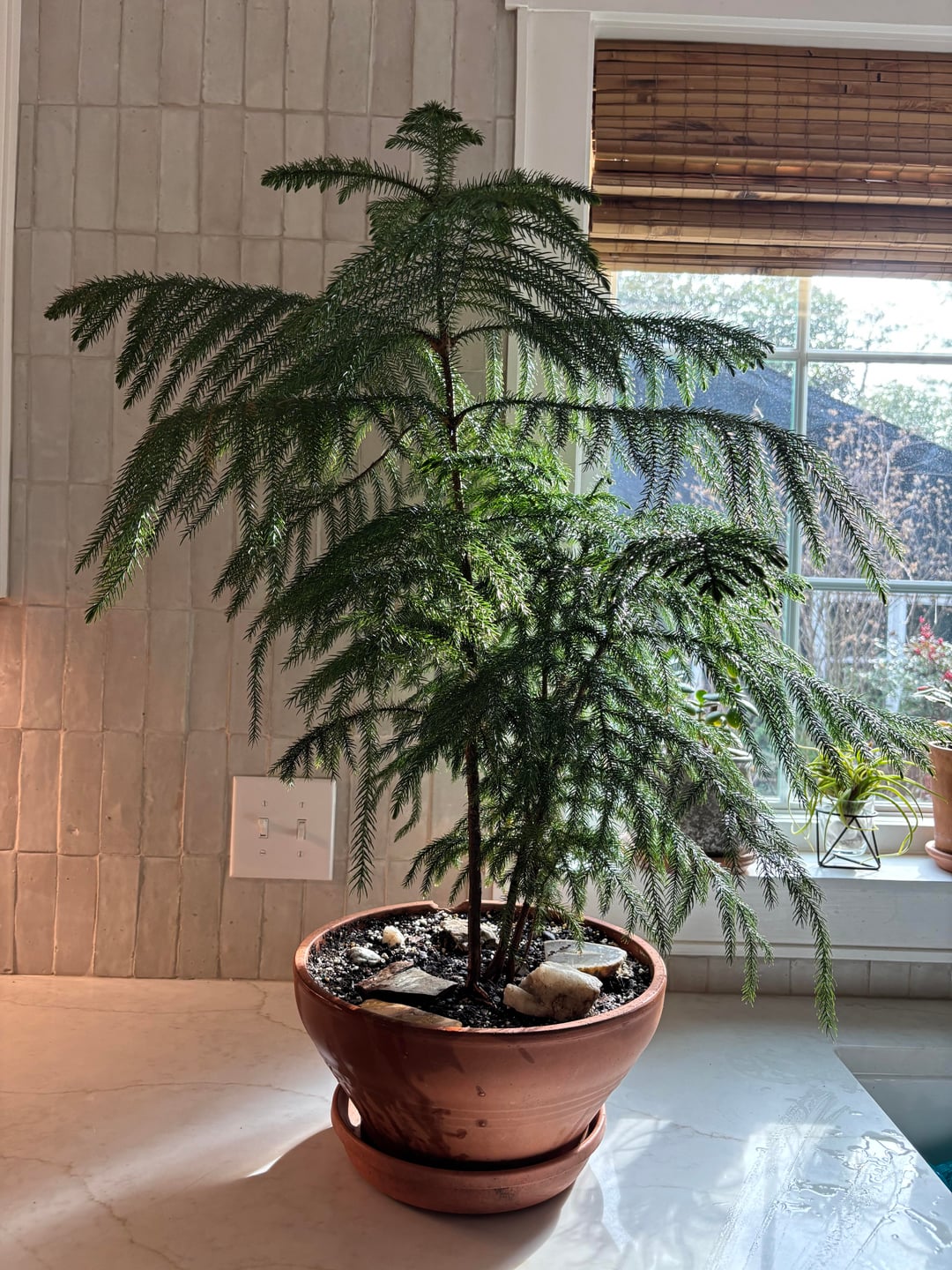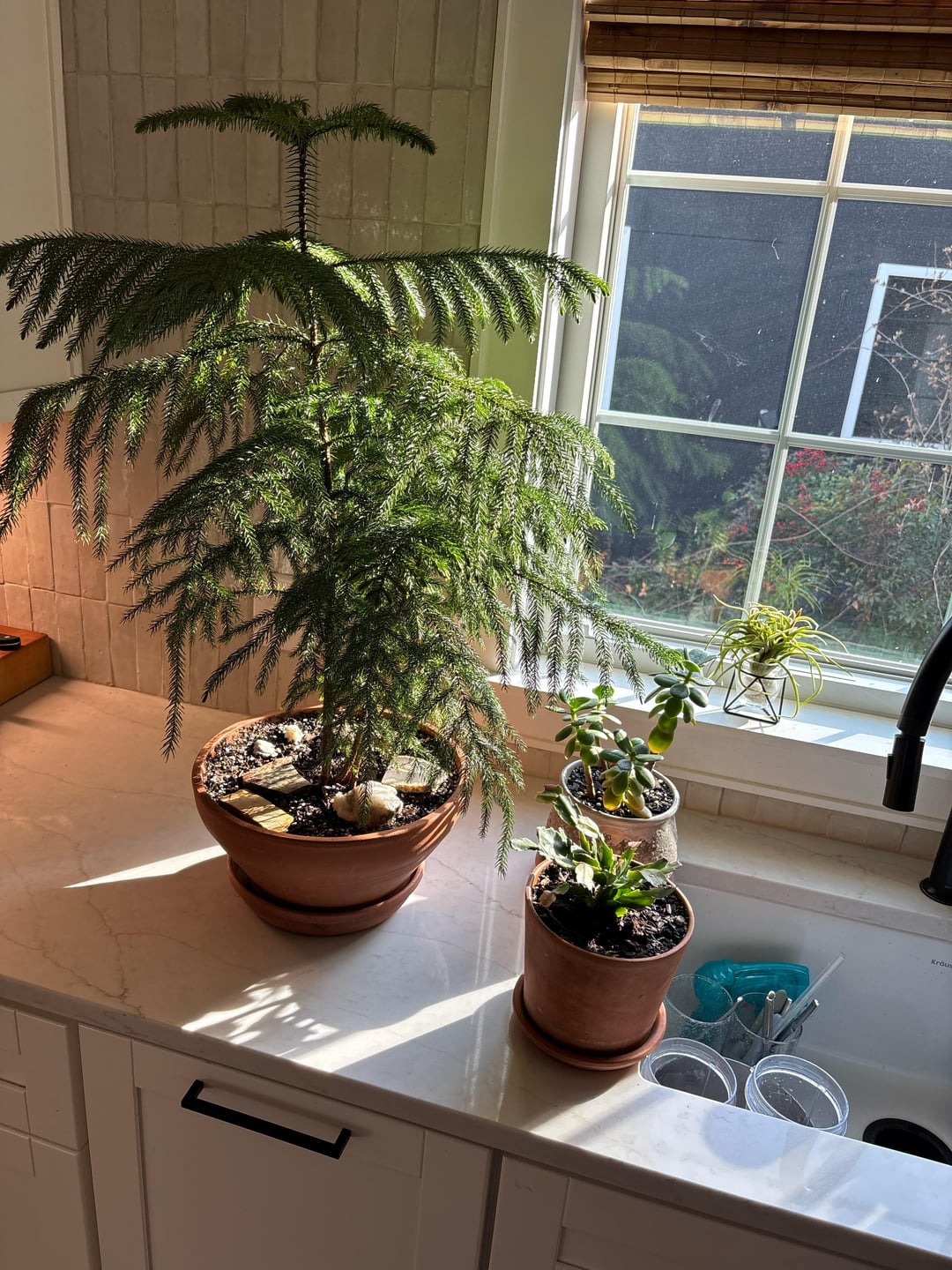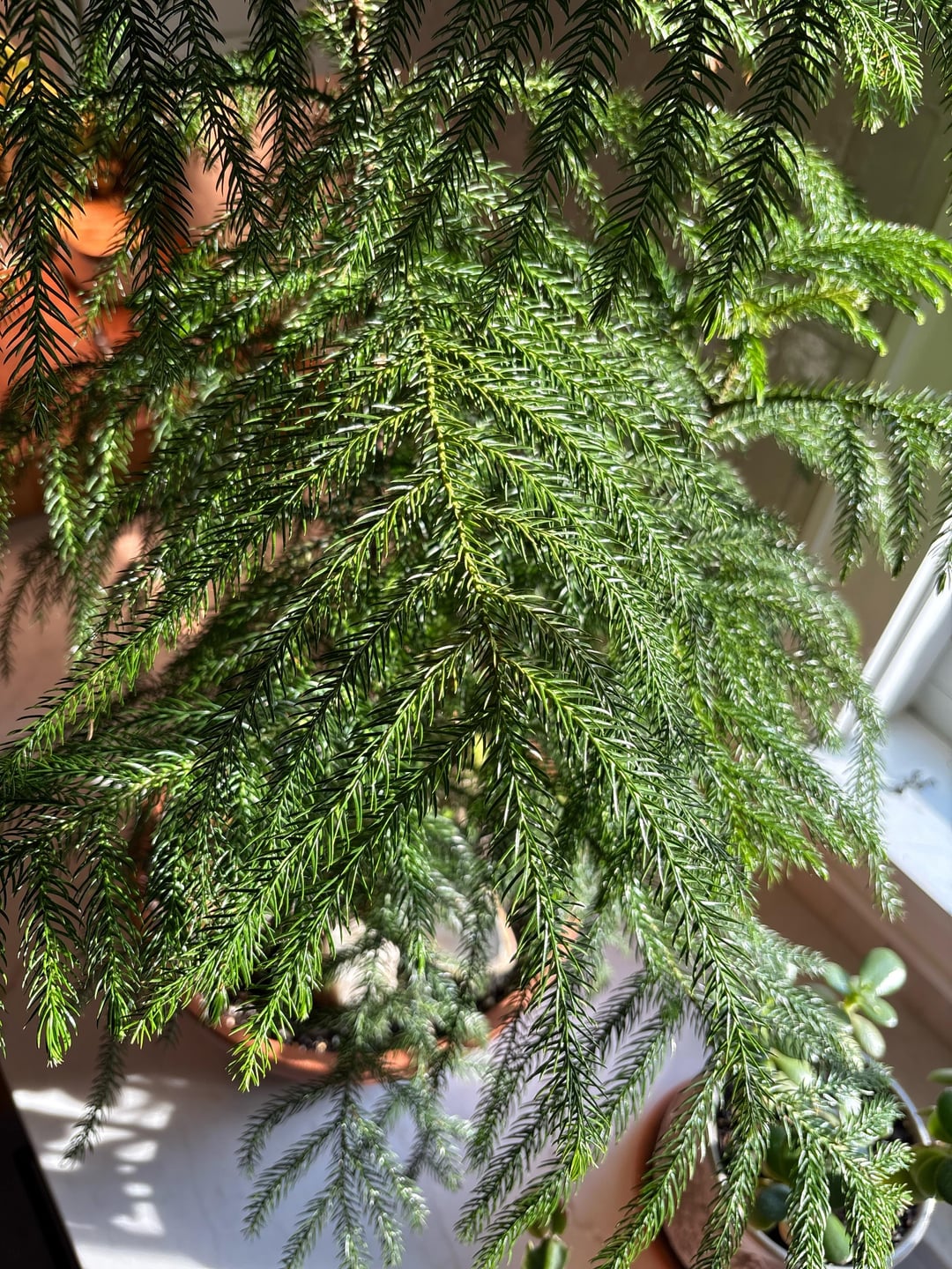 Meine Norfolk- (oder Cook-?) Kiefer (mit Bonusaufnahme meines Thanksgiving-Kaktus, meiner Jadepflanze und meiner Tilladsie).