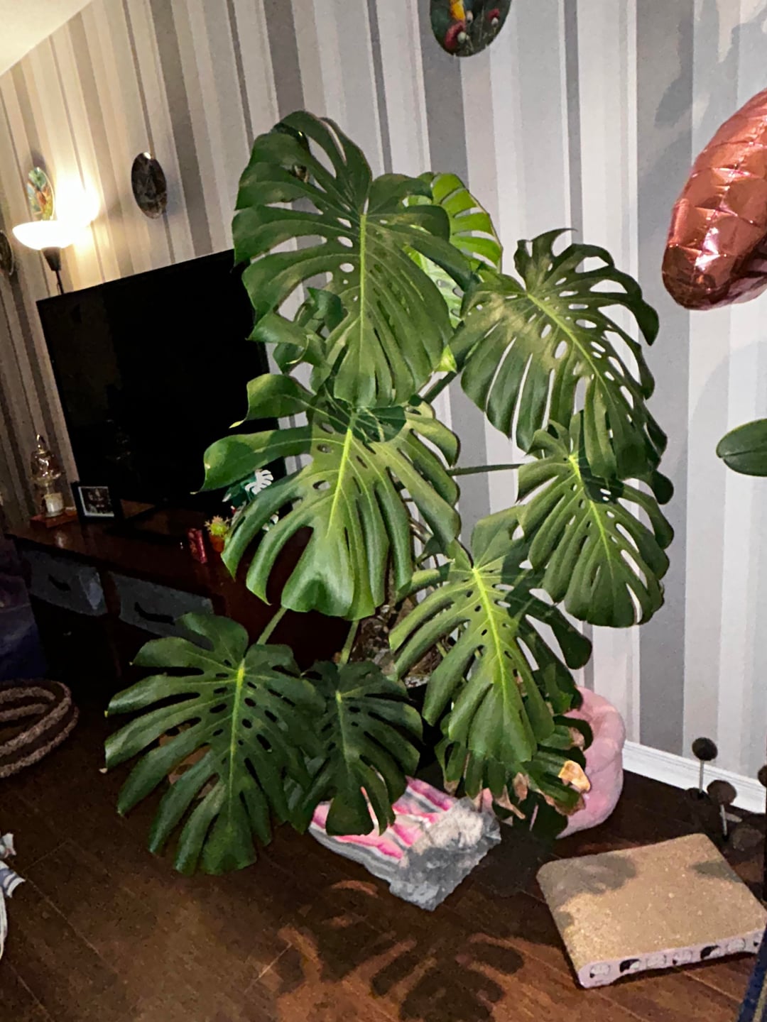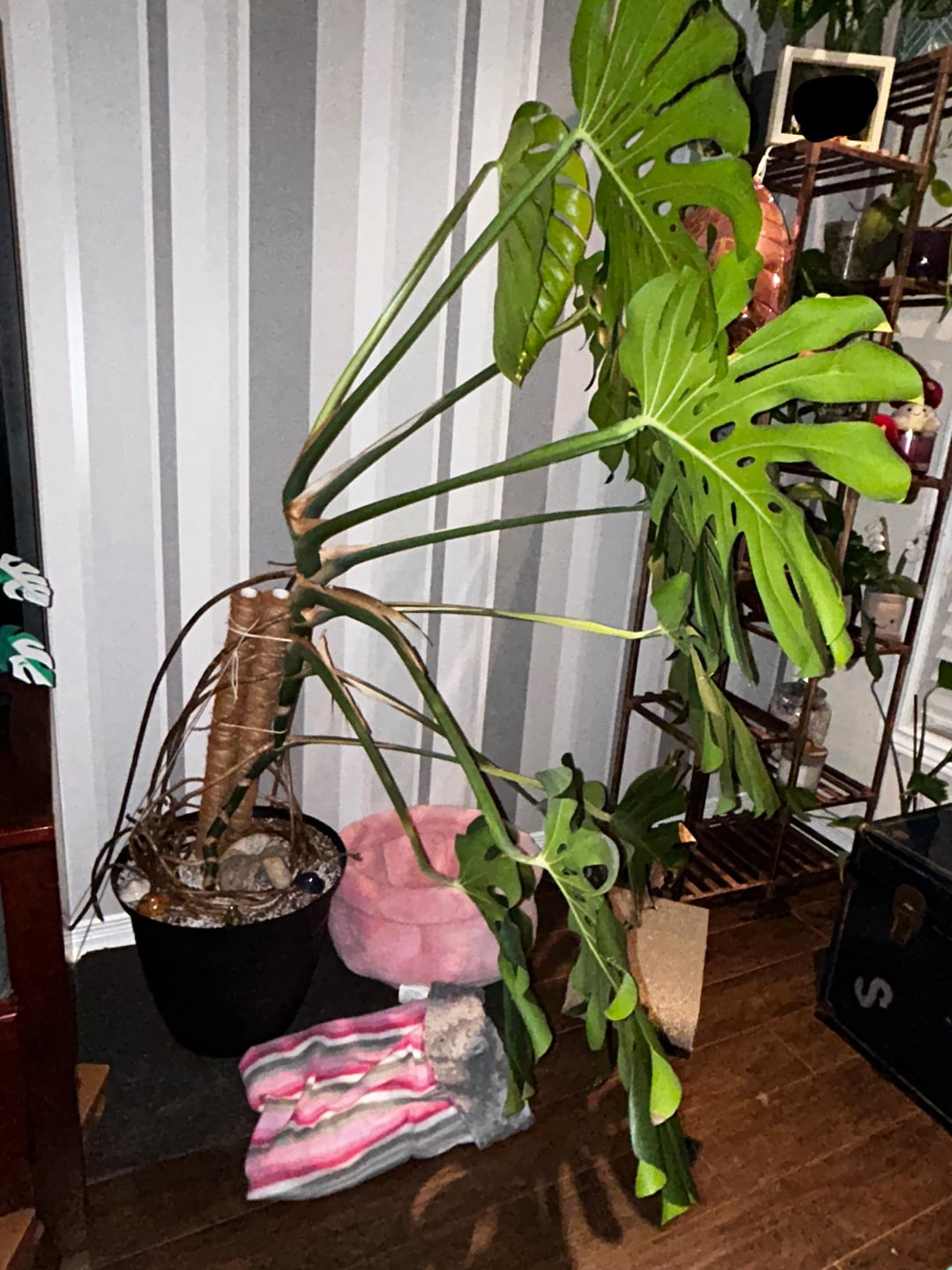 Hallo Freunde, bitte schickt Hilfe, lol. Ich habe dieses Monster, das mich buchstäblich aus dem Haus frisst. Sie ist verdammt groß geworden und ich weiß nicht, wie ich sie sonst besser unterstützen kann. Ich habe gerade diesen peinlich erbärmlichen Aufbau im Gange: vier Moosstangen und eine Schnur, die am Bein meiner TV-Konsole befestigt ist. Es funktioniert… irgendwie. Aber auf lange Sicht würde ich mir etwas Robusteres wünschen.