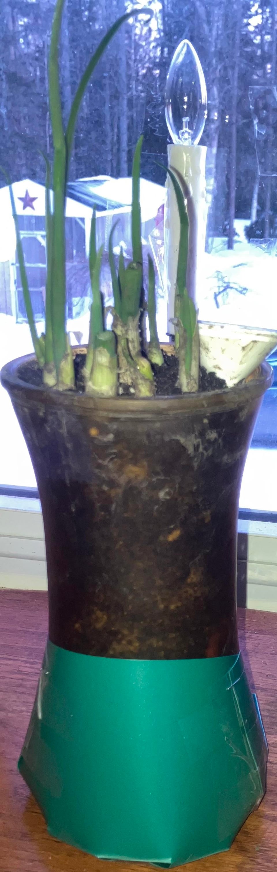 Es enthält einige winzige Glasperlen, die ich in die Erde gesteckt habe, und einen kleinen 1-Pfund-Sack Sand, den ich im Dollar-Laden gekauft habe. Ich habe den Sand vollständig in den Boden eingemischt, ich musste den Boden stark verbessern. Das grüne Plastikding ist Teil einer Plastikmappe, die ich so modifiziert habe, dass sie die Vorderseite und die Seiten des Wasserreservoirs umwickelt, um es vor der Sonne zu schützen. Was denkst du? 🤔 Ich versuche mein Bestes, um meine Frühlingszwiebeln gut vorzubereiten
