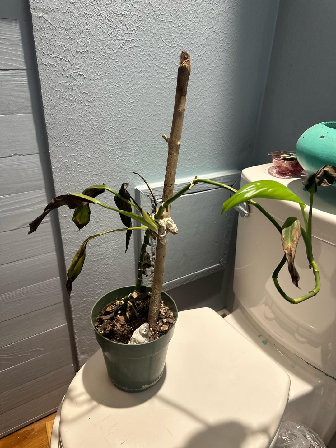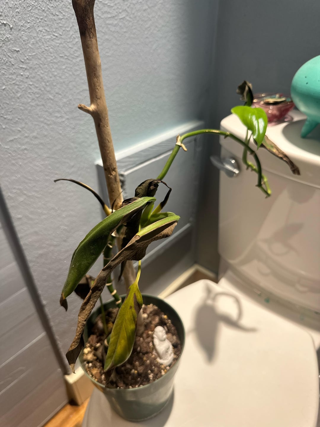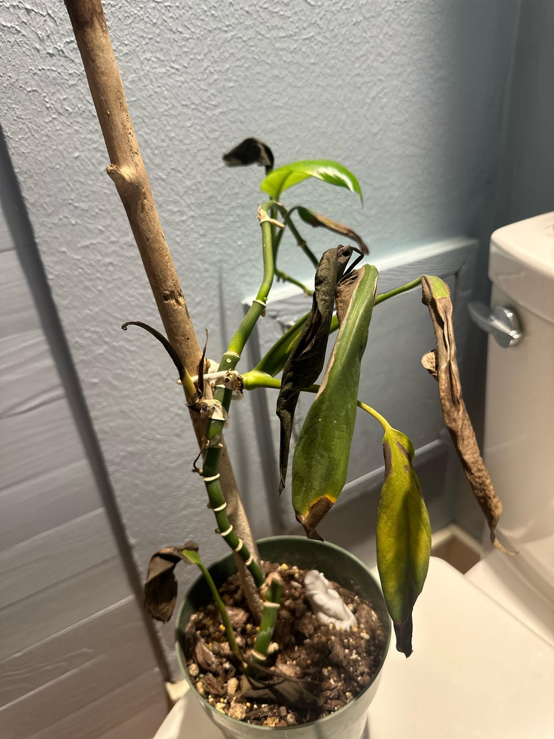 Zunächst einmal weiß ich nicht, um welche Pflanze es sich handelt. Zweitens war ich bereit aufzugeben, habe es aber ins Badezimmer verlegt, wo es helles indirektes Licht und mehr Luftfeuchtigkeit gibt, und dort Wachstum zulassen! Ich weiß nicht, wie ich mich in Zukunft darum kümmern soll oder ob es zu gestresst ist, um weiterzumachen. Jeder Rat ist wunderbar! Ich schätze dich!