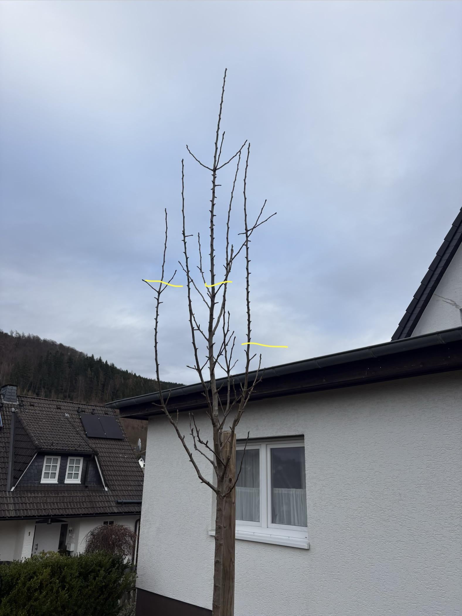 Ist unser Birnenbaum zu hoch geschossen ? Nach durchsicht von Posts und Videos, würde ich ihn an den markierten schneiden. Ist das einigermaßen richtig? Oder habt ihr noch Ideen? Beste Dank für eure Hilfe Von: fredo6666