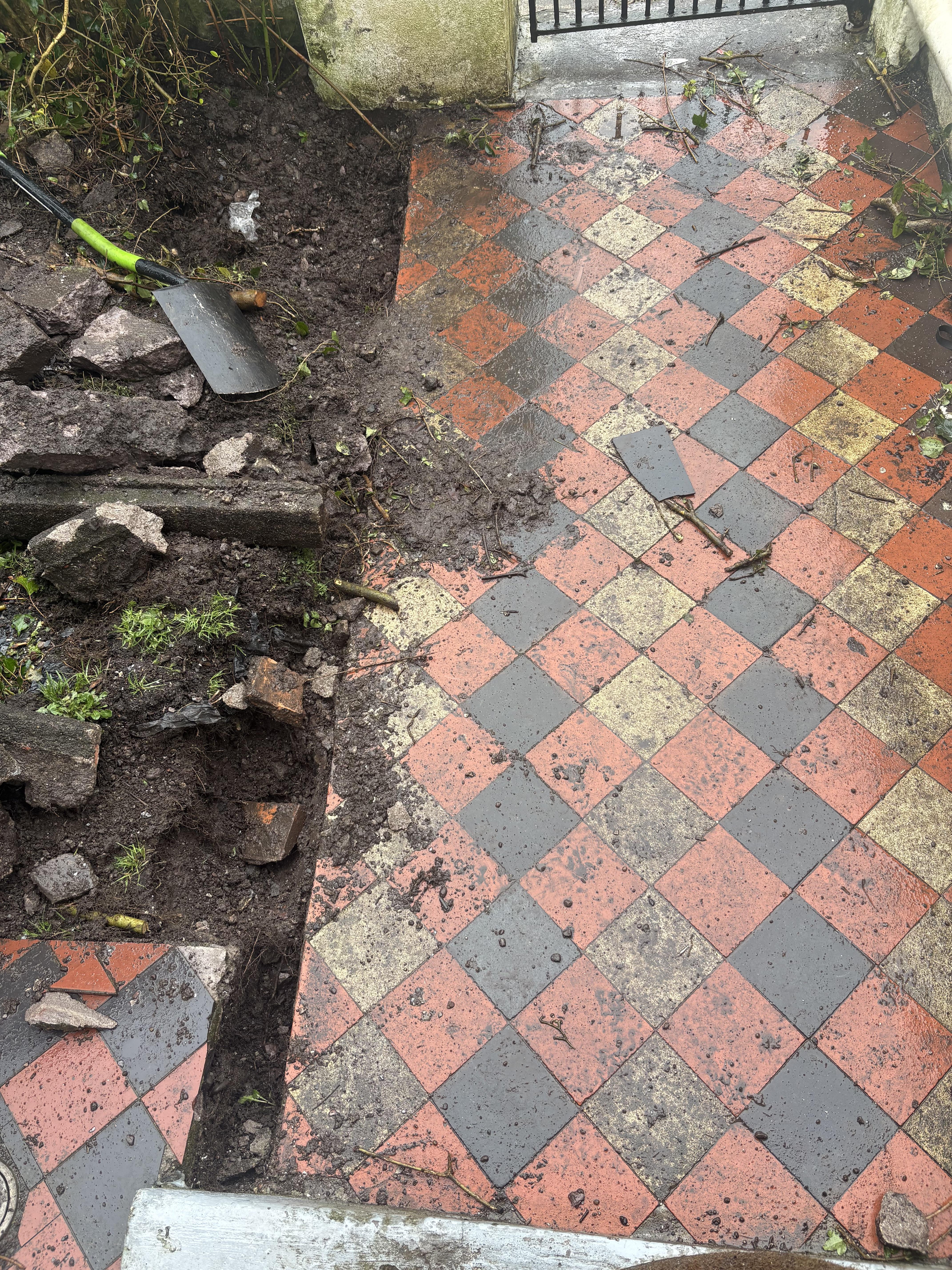 Ich renoviere den Vorgarten meiner neuen viktorianischen Terrasse. Ich habe die schreckliche Betonumrandung ausgegraben und eine Terrakotta-Seilumrandung gekauft, die zu den Fliesen passt.
