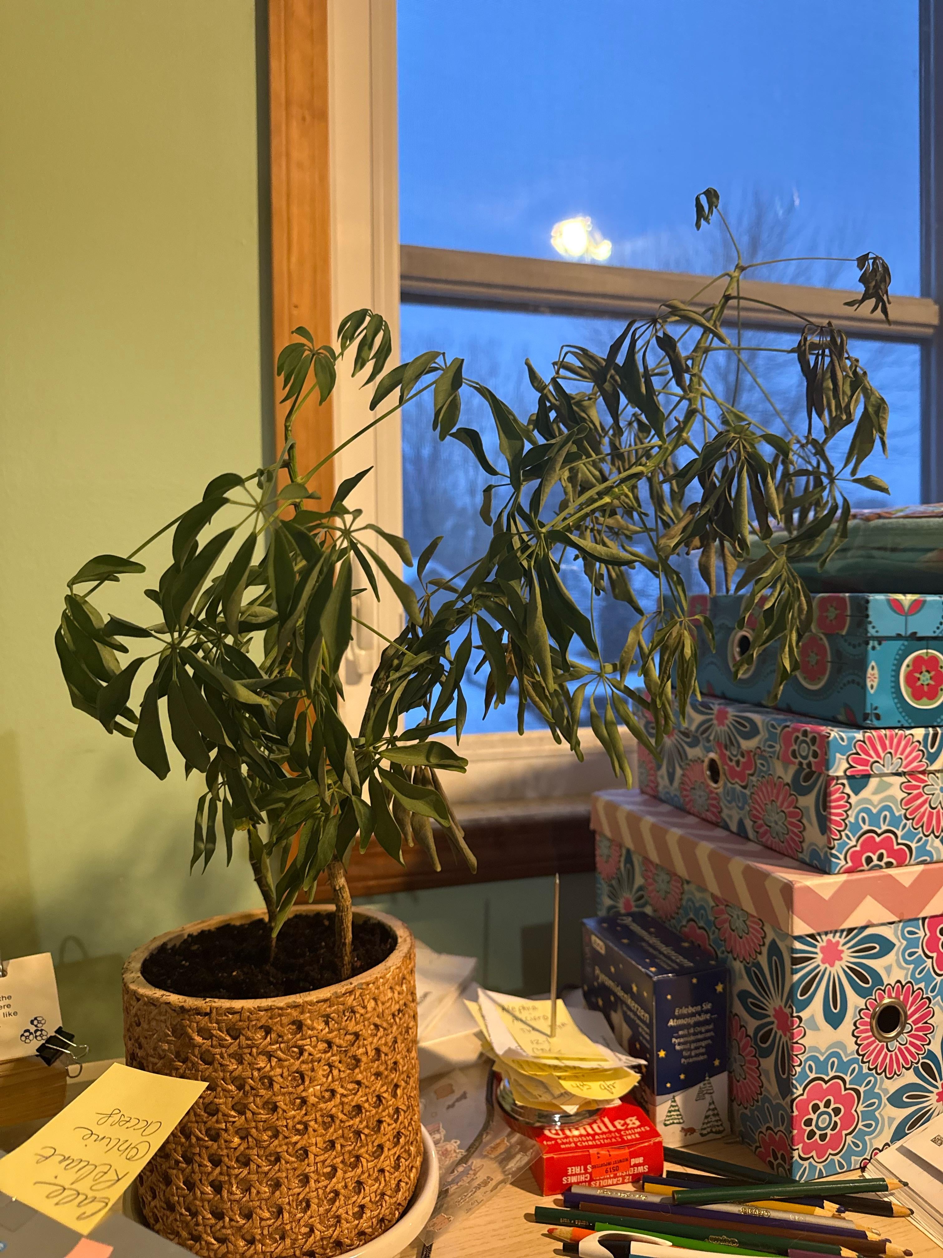 Ich habe diese Pflanze vor etwa einer Woche von einem Community-Mitglied bekommen. Es sah gesund aus. Am Freitag zeigte es Anzeichen von Austrocknung, also habe ich es gegossen. Der Boden war hydrophob, daher musste ich ihn belüften, um alles feucht zu machen. Seitdem ist sie rückläufig. Muss ich umtopfen? Soll ich warten?