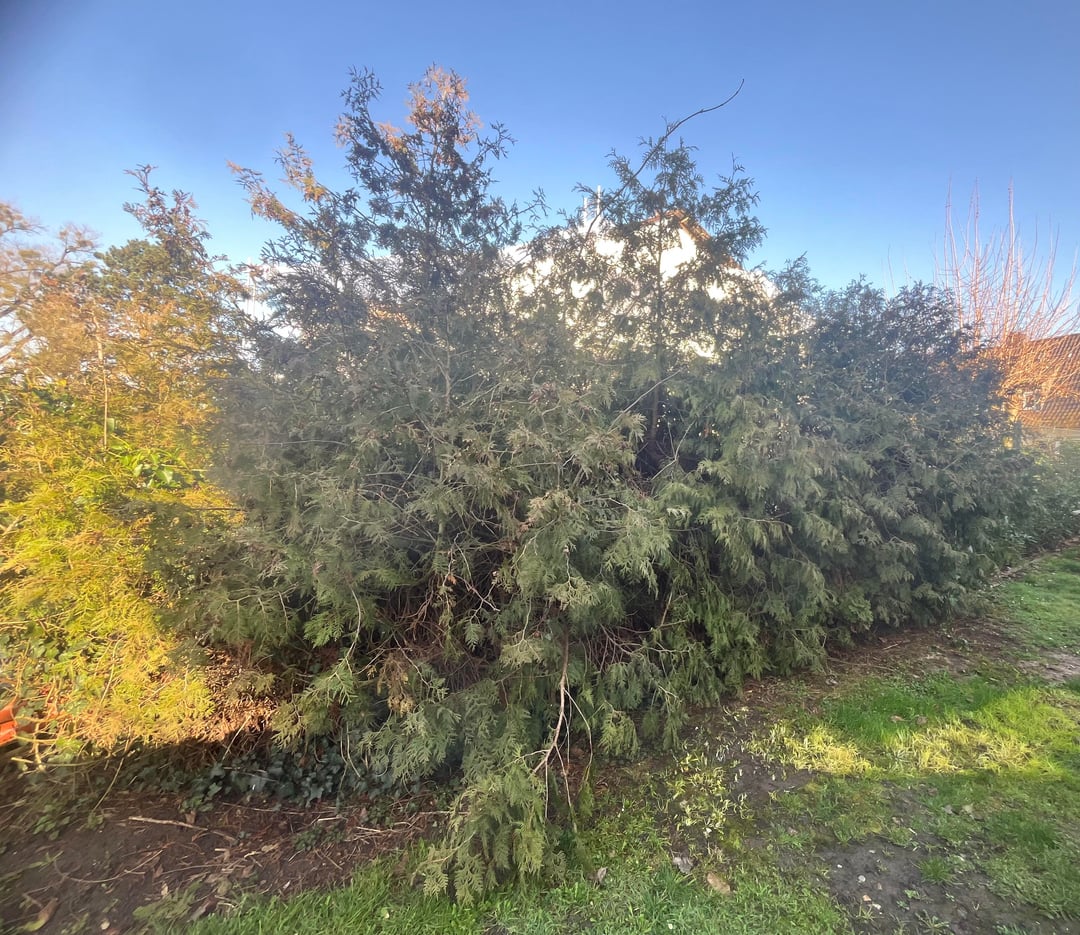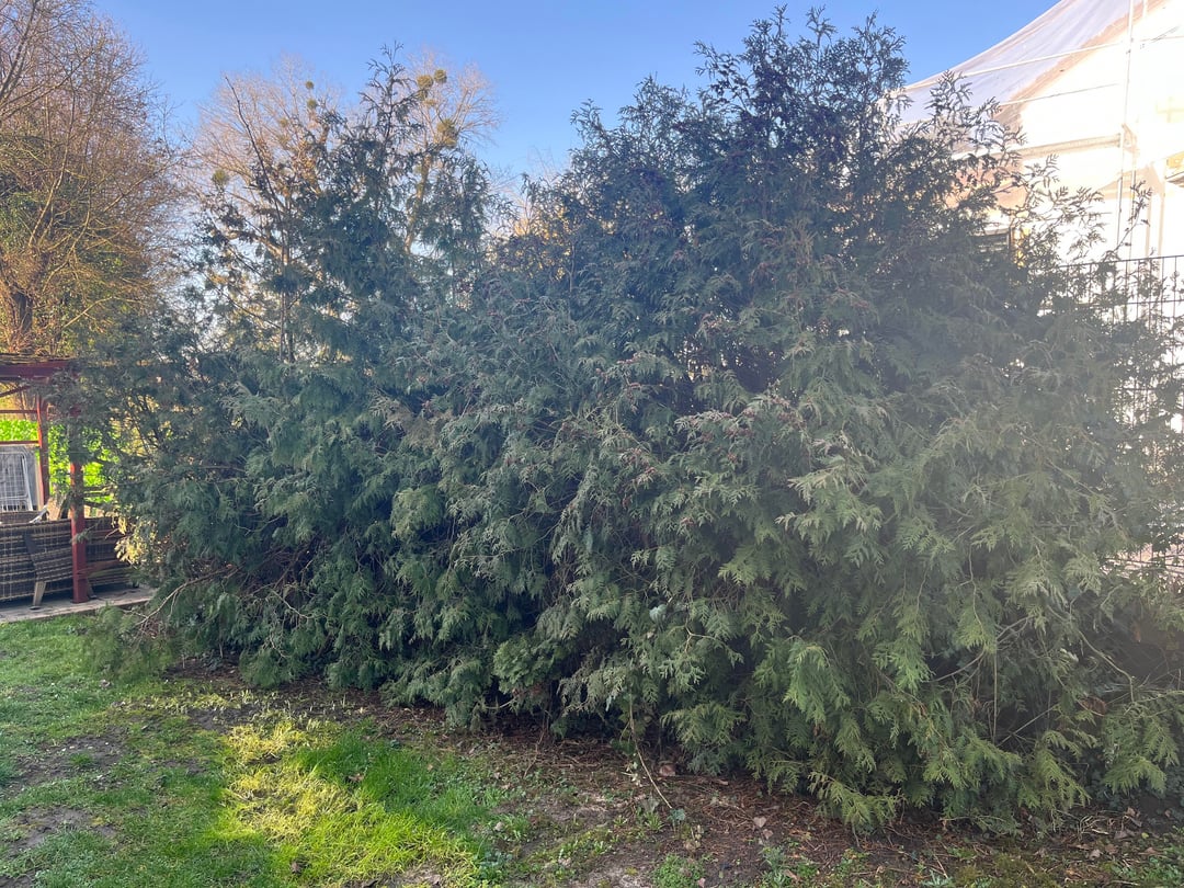 Ich habe hier ein Stück Thuje im Garten, was leider über die Jahre etwas zu groß geworden ist, und auch etwas blass und vertrocknet aussieht.