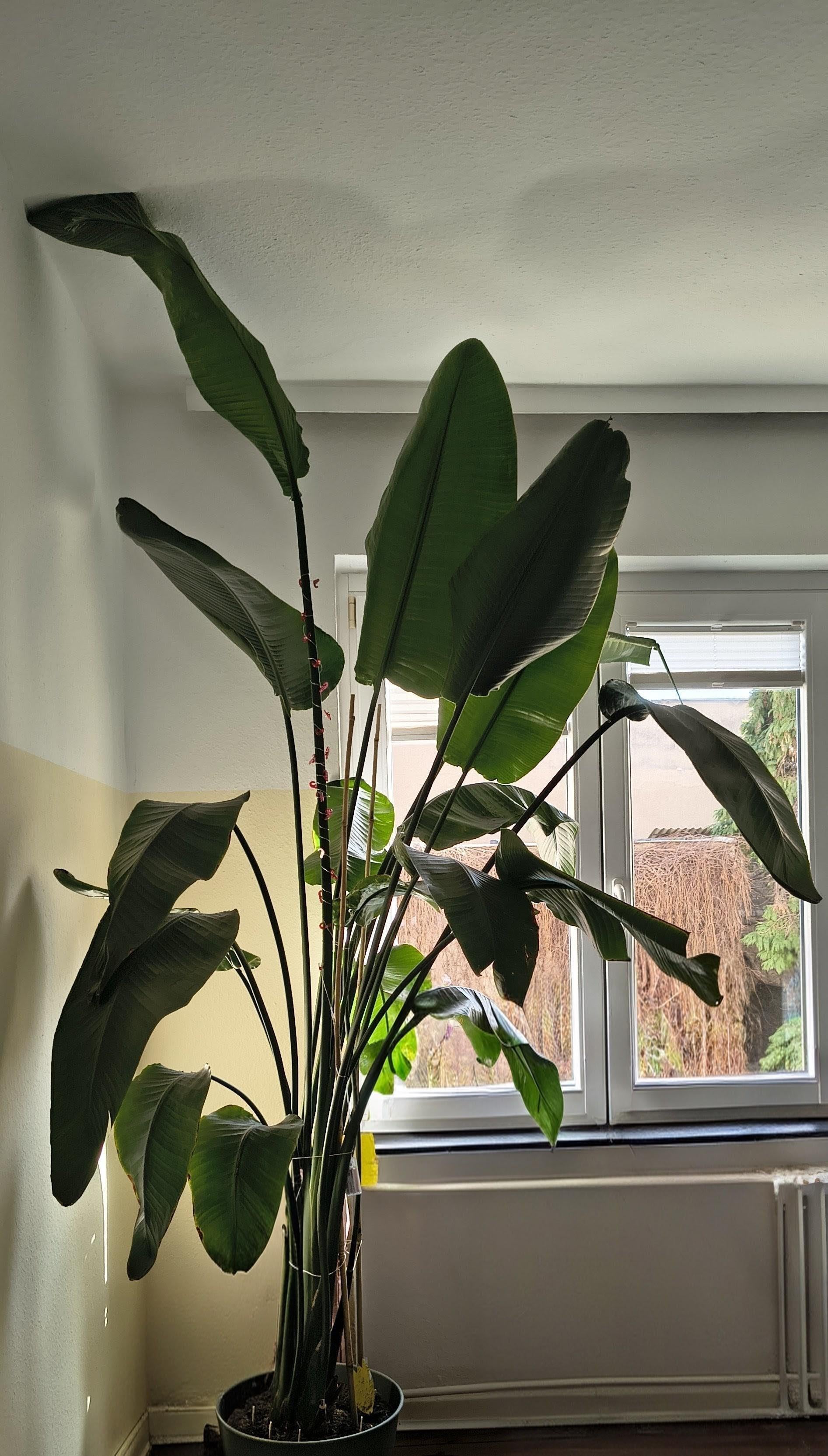 Hallo zusammen, meine liebe Strelitzie wächst so gut, trotz starkem Trauermückenbefall, Heizungsluft und kaum Wasser. Aktuell sind wieder zwei neue Blätter im Anmarsch und das erste Blatt berührt schon die Decke.