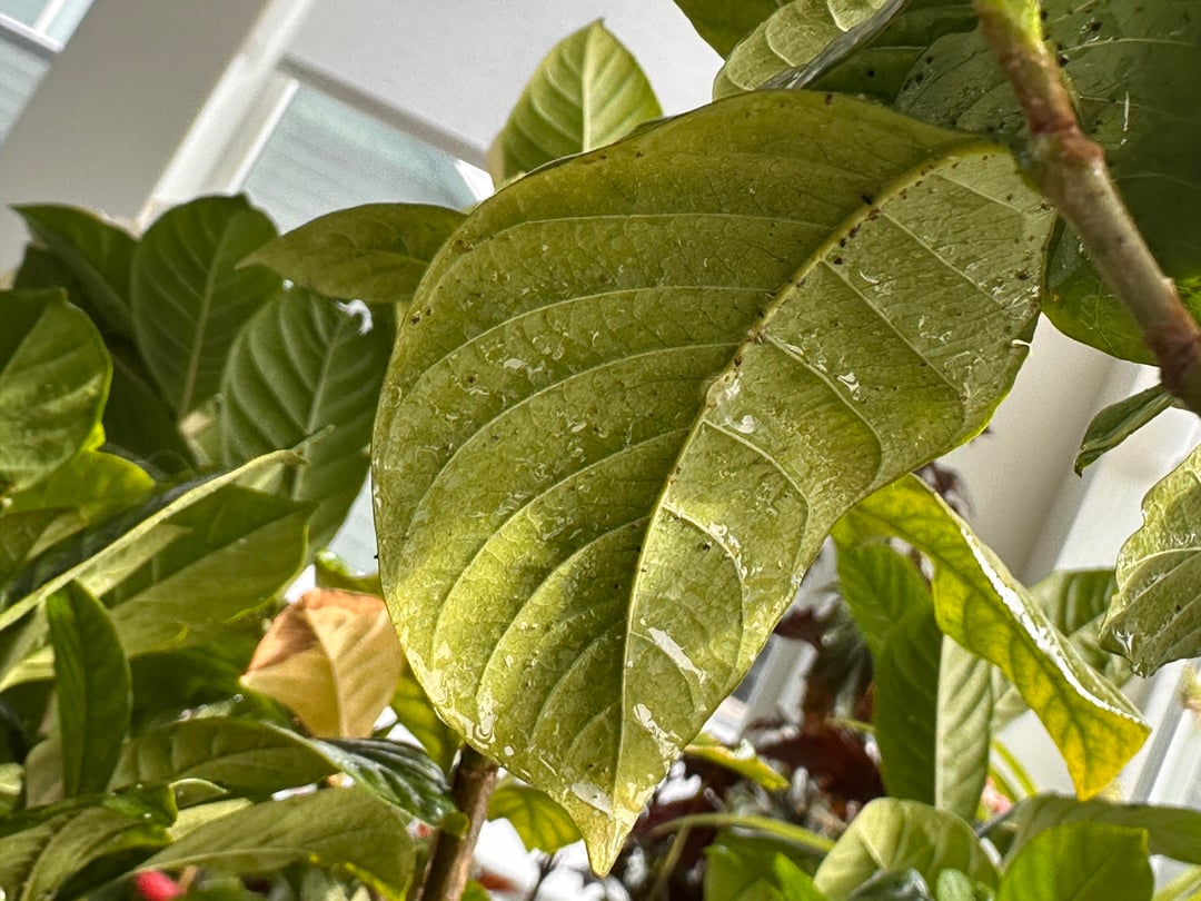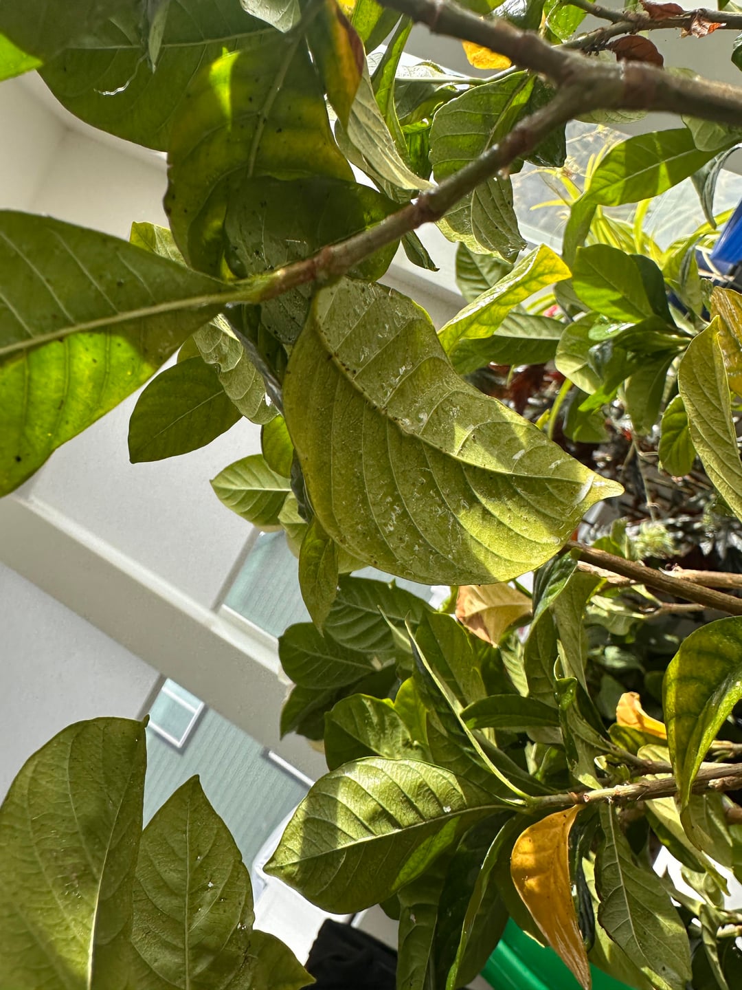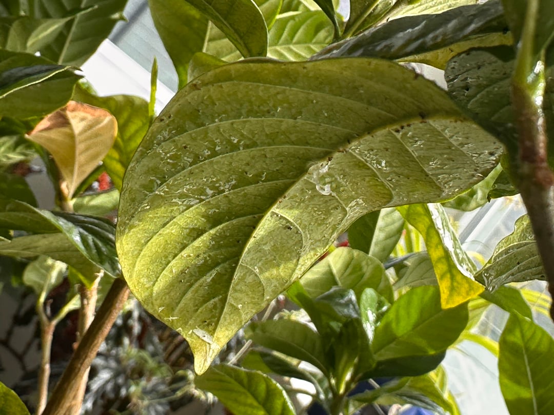Was hat es neben dem Befall mit weißen Fliegen mit diesem durchsichtigen, röhrenförmigen, hakenähnlichen Ding auf sich, das in der Mitte dieses Blattes hängt? Ich kann nirgendwo Informationen dazu finden. Ich habe meine Gardenie gegen Blattläuse und Weiße Fliegen behandelt, aber heute Morgen ist mir aufgefallen, dass an einem der Blätter diese seltsame, geleeartige Röhre hängt. Meine Pflanze ist ansonsten gesund und in voller Blüte.