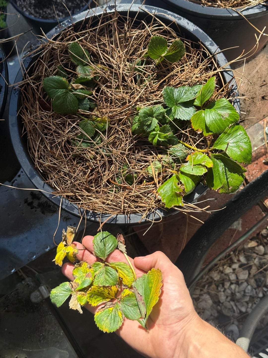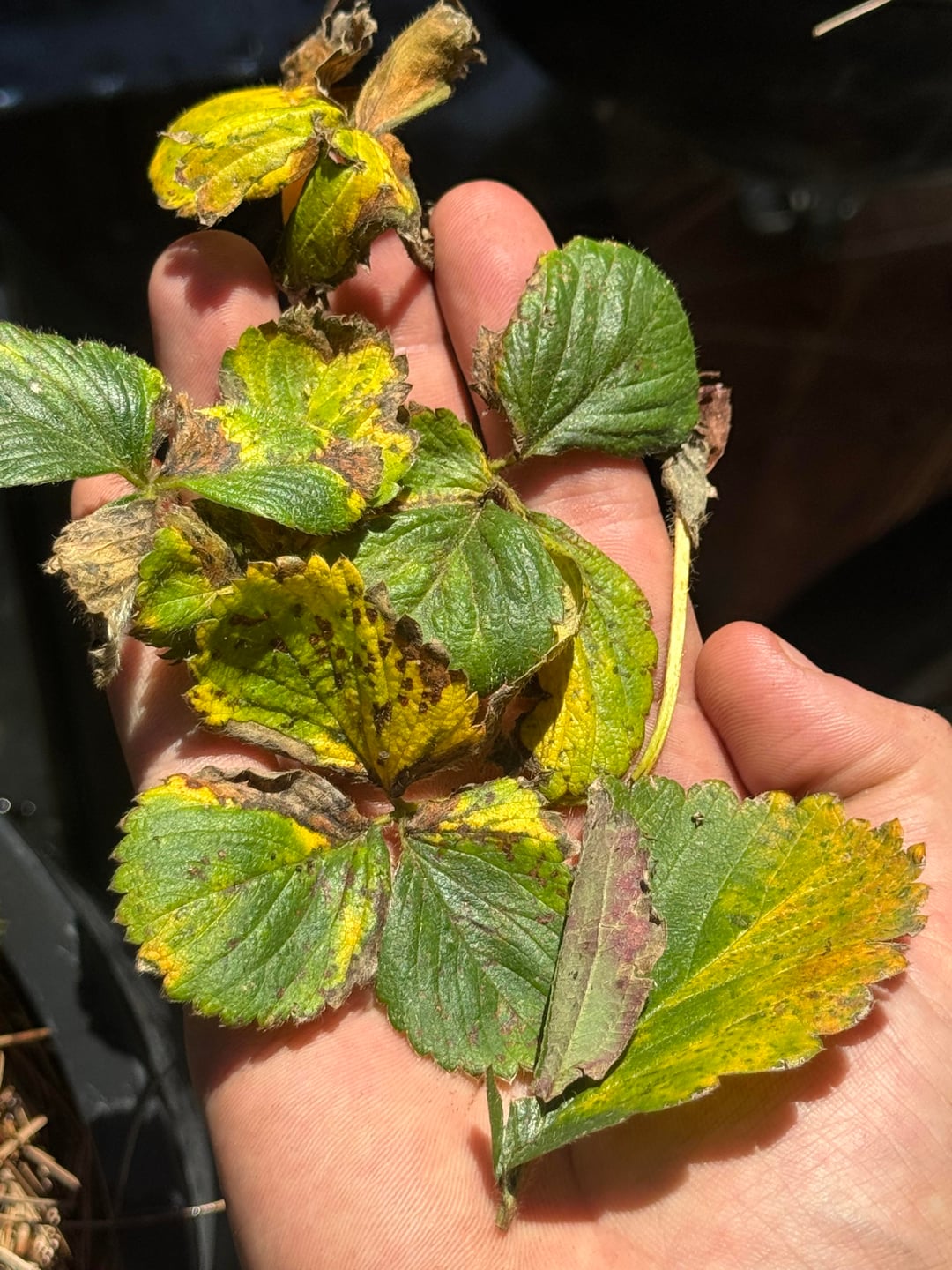 Ich befinde mich in der südkalifornischen Zone 10a. Ich züchte mehrere Mammutbaum-Erdbeerpflanzen, die ich im Frühjahr 2025 begonnen habe. Seit dem Herbst verliere ich den Großteil meiner Blätter durch diese Gelbfleckenkrankheit. Was verursacht das? Und was kann ich tun, um das Problem zu beheben?