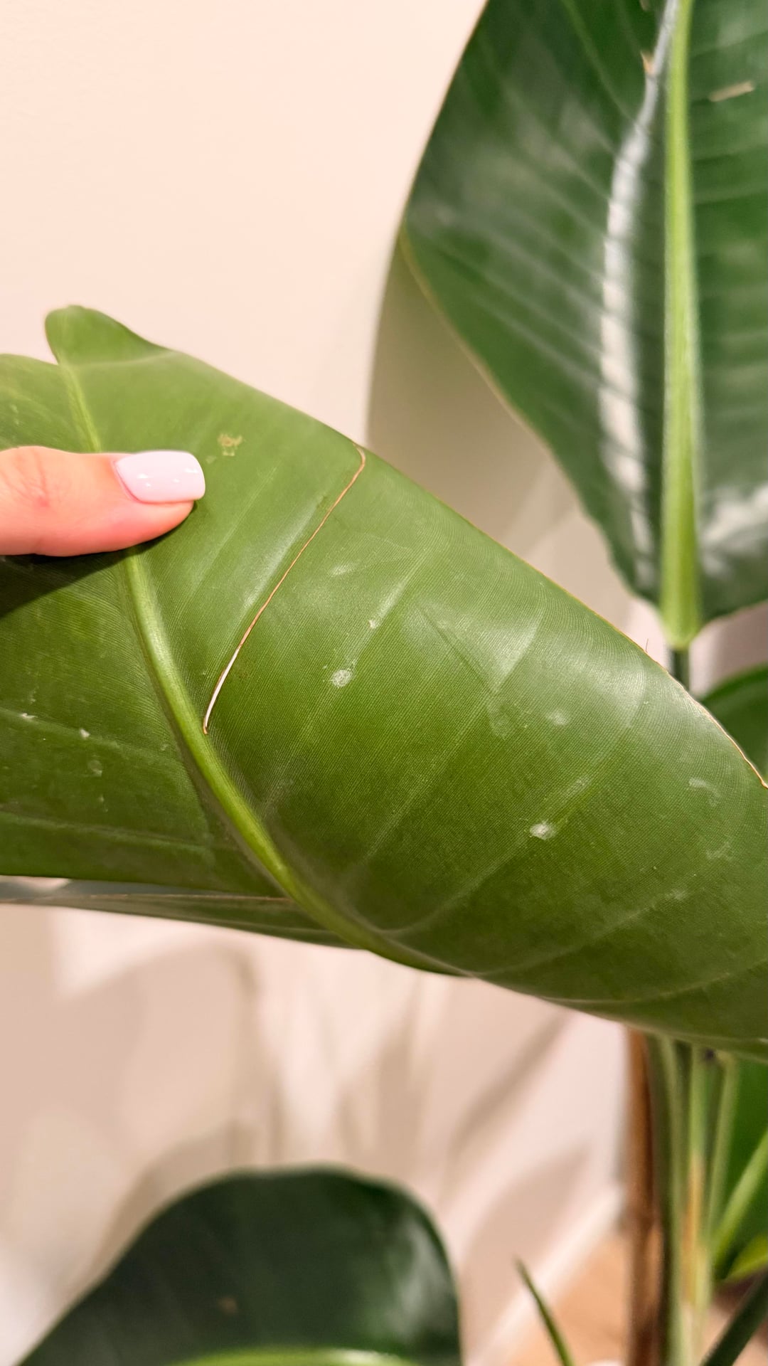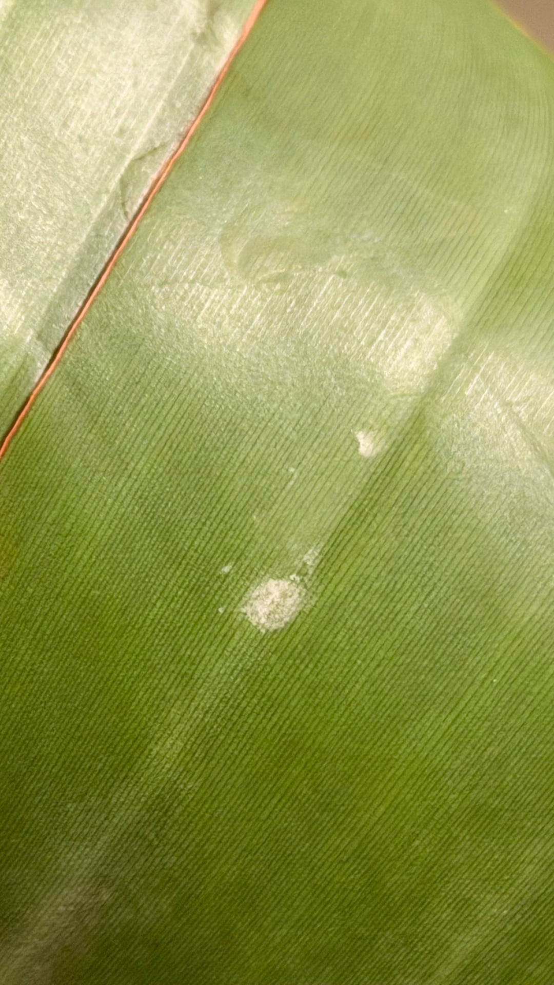 Hallo! Ich habe einige weiße Flecken auf der Unterseite meines Paradiesvogelblatts gefunden und frage mich, ob es sich wahrscheinlich nur um harte Wasserflecken handelt oder ob das ein Grund zur Sorge ist?