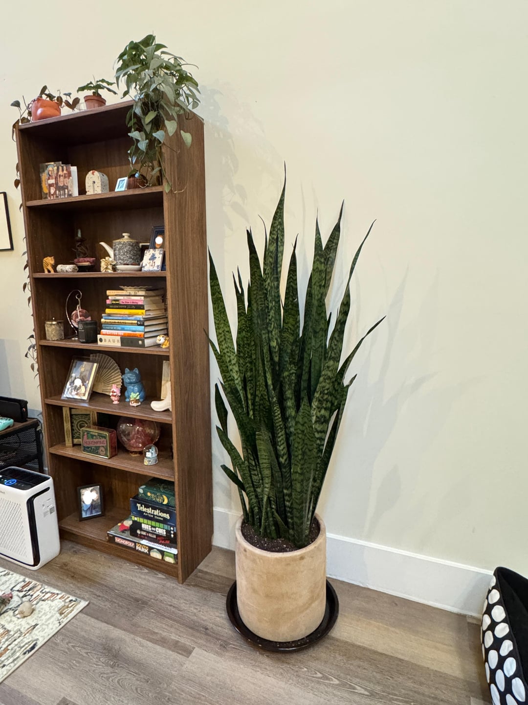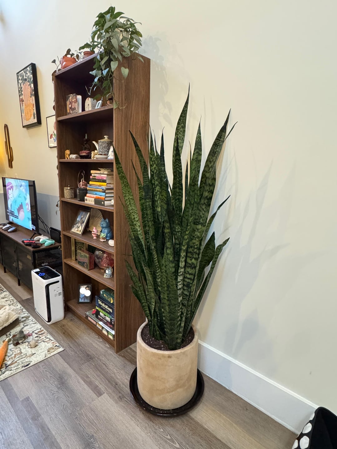 Mein Partner und ich haben diese wunderschöne Schlangenpflanze letztes Wochenende in unserem örtlichen Gartencenter abgeholt. Wir haben sie in einen 14-Zoll-Terrakottatopf umtopfen lassen und derzeit sitzt sie in unserem Küchen-/Wohnzimmerbereich, wo sie viel helles indirektes Licht von unseren Wohnzimmerfenstern und Küchenoberlichtern bekommt. Die Luftfeuchtigkeit im Haus beträgt im Winter etwa 30–35 % und im Sommer etwa 45 %. Wir haben 20 Fuß hohe Decken, also viel Luftzirkulation. Die Leute im Gartencenter haben empfohlen, sie alle 2–4 Wochen zu gießen, was ich für Schlangen normal kenne Pflanzen, aber angesichts ihrer Größe möchte ich sicher sein, dass ich nicht zu viel oder zu wenig einschätze. Ich habe zwar einen Feuchtigkeitsmesser, aber er ist nicht lang genug, um den Boden dieses Topfes zu erreichen. Gibt es also Empfehlungen, was ich tun oder verwenden kann, um sicherzustellen, dass sie nur bei Bedarf bewässert wird?