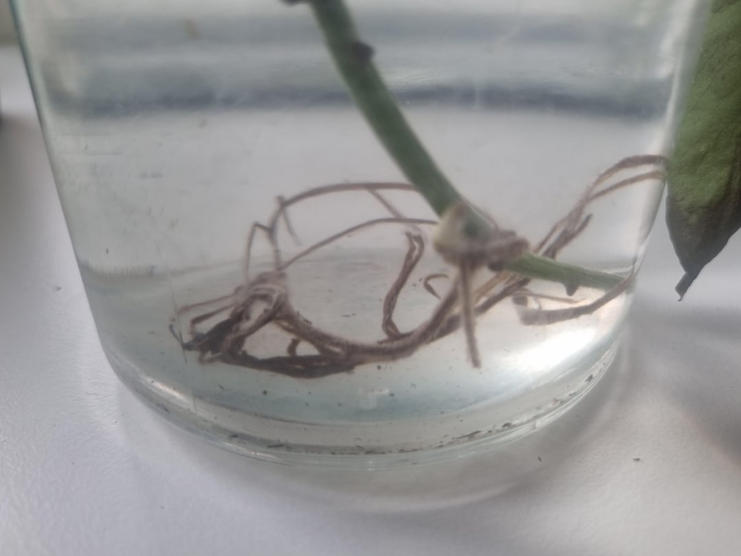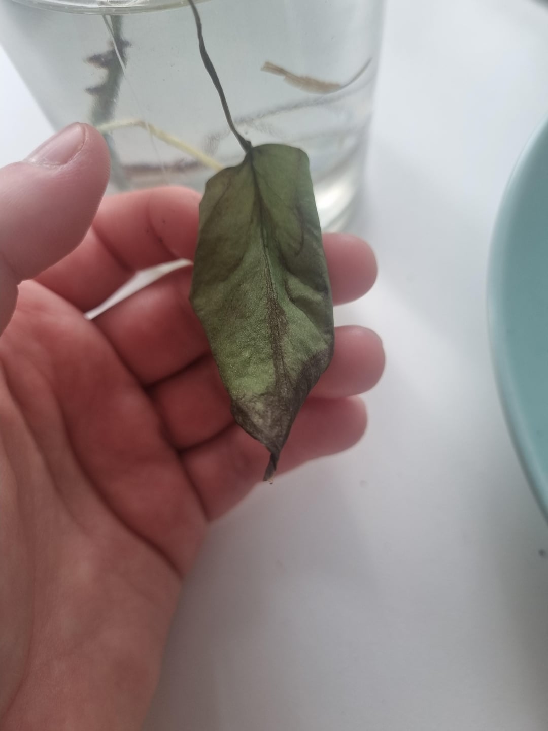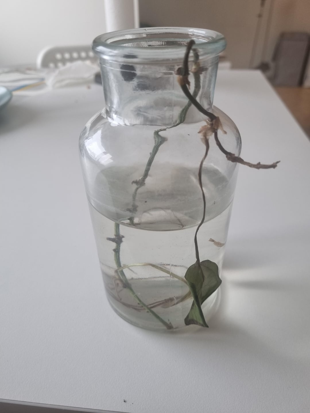 Ich weiß nicht, wie lange es schon dort ist, aber ich vermute, dass das Wasser seit einiger Zeit wahrscheinlich nicht gewechselt wurde, seit Wochen, wenn nicht Monaten. Das Blatt scheint immer noch Wasser zu bekommen und einige Teile des Stängels scheinen zu retten zu sein, obwohl die Wurzeln nicht besonders gut aussehen.
