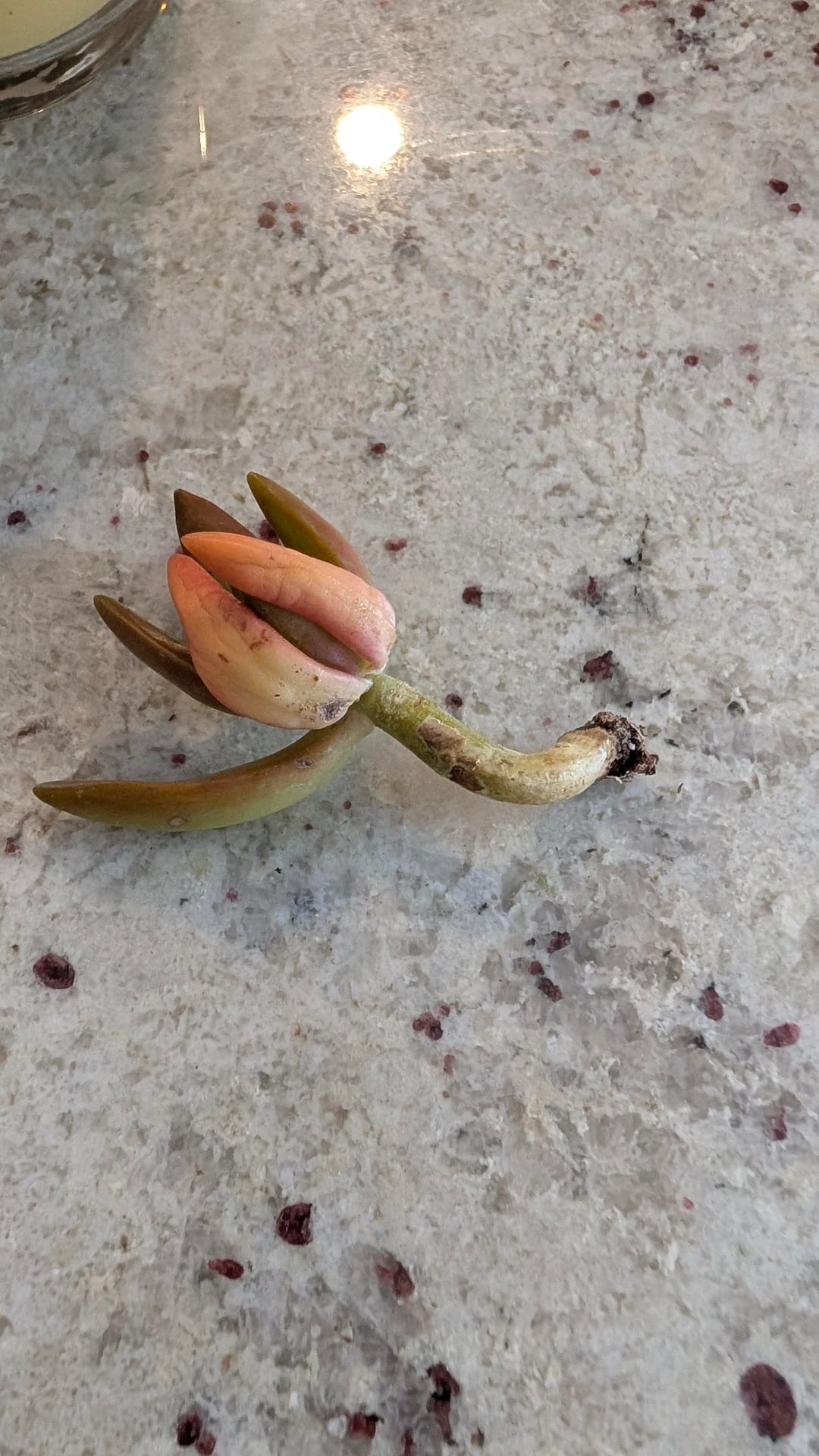 Ich fand diesen traurigen kleinen Kerl verlassen auf dem Boden meines örtlichen Lowes und bekam die Erlaubnis, ihn nach Hause zu bringen. Sein aktueller Stamm sieht für mich etwas seltsam aus und ich bin mir nicht sicher, ob das vorhandene Stück an den Wurzelenden noch lebensfähig ist oder nicht. Sollte ich (A) ihn in etwas Erde in einem winzigen Terrakotta-Topf stecken (B) ihn am Stiel hacken, ihn schwielig werden lassen und ihn dann in etwas Erde stecken (C) versuchen, alle Blätter einzeln abzustützen (D) etwas anderes/nicht wirklich wichtig