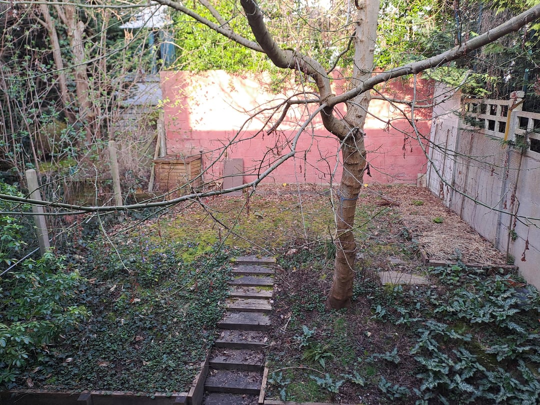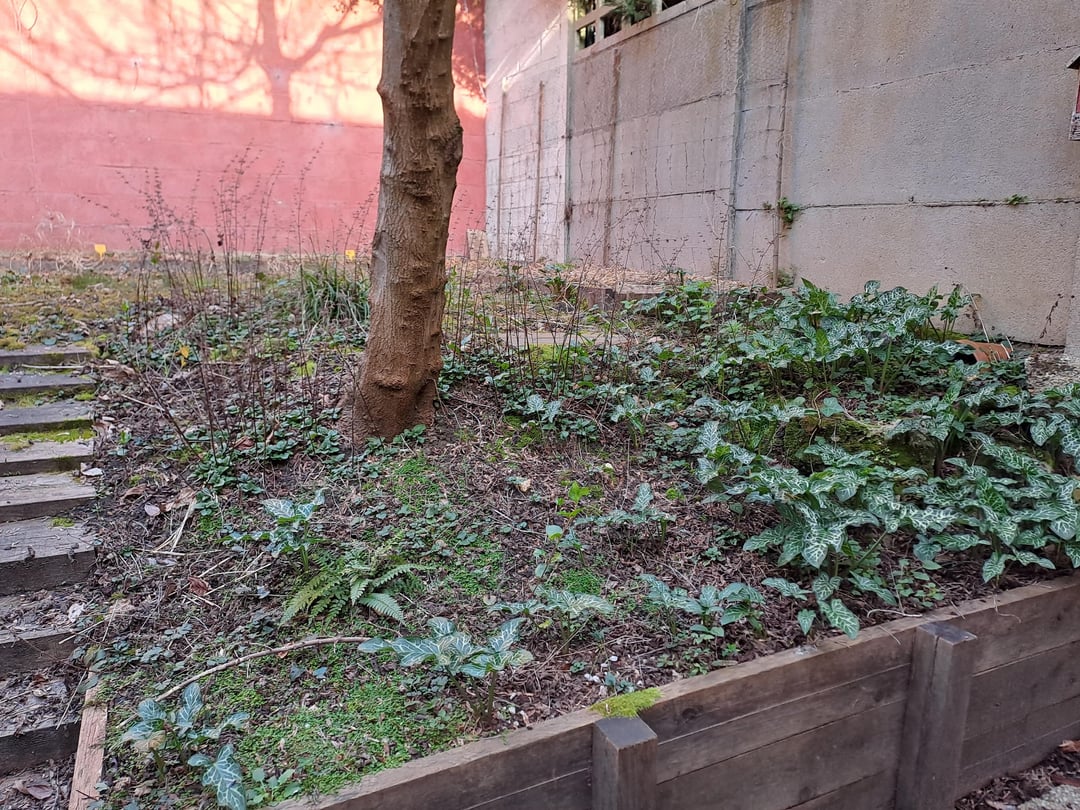 Die Lage des Gartens ist ziemlich komplex, er profitiert von einer Südausrichtung, aber versteckt durch das Gebäude, die Bäume der Nachbarn usw., entsteht am Ende ein eher schattiger/halbschattiger Garten. Ziemlich lehmiger Boden ist kompakt.