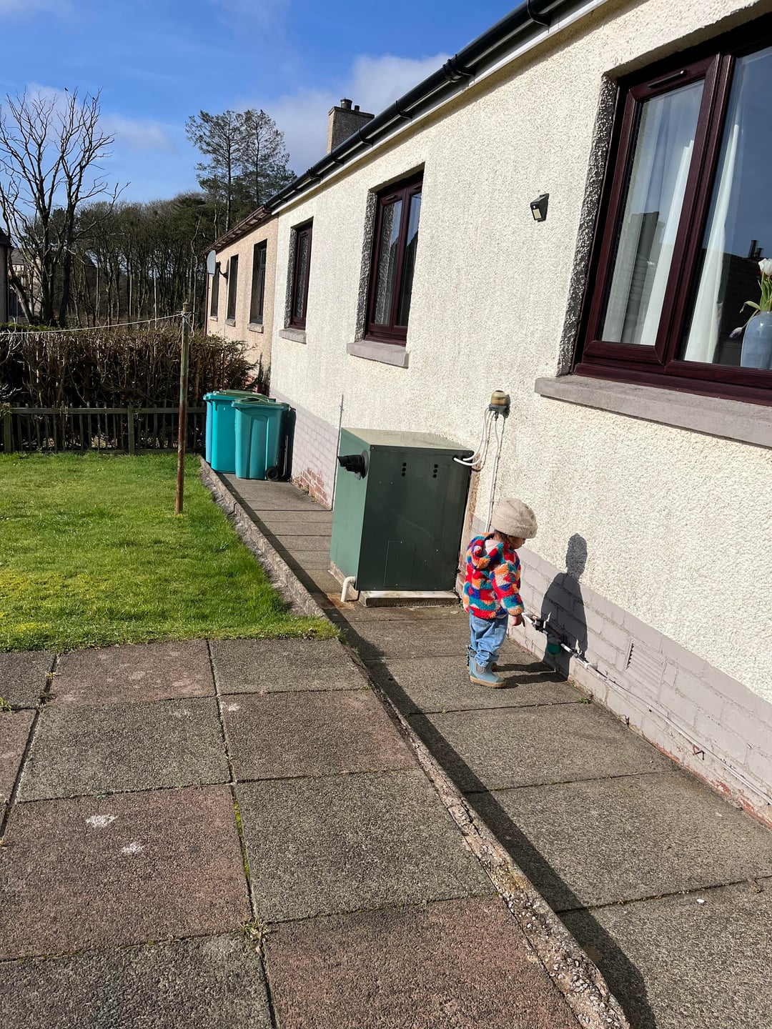 Entlang der Rückseite des Hauses verläuft ein abschüssiger Betonweg (siehe Abbildung) mit dem unansehnlichen Außenkessel. Ich bin mir nicht ganz sicher, was ich da machen soll, vielleicht ein paar Topfkräuter?