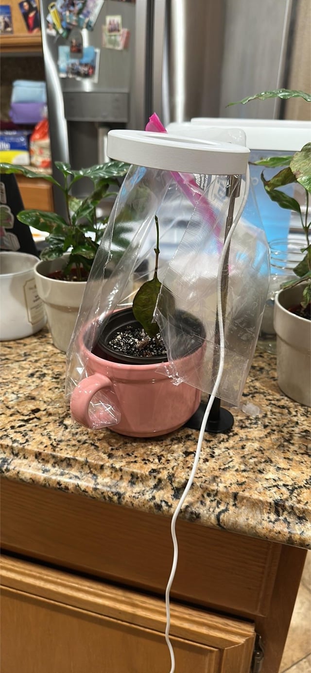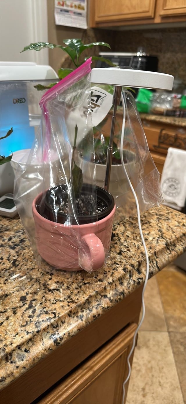 Sie ist ein Kaffee, sie ist in einem offenen Druckverschlussbeutel, der aufgeschnitten ist und sie nur an drei Seiten umgibt, sie aber überhaupt nicht berührt. Ich benutze die Lampe als Ständer, aber sie ist überhaupt nicht eingeschaltet