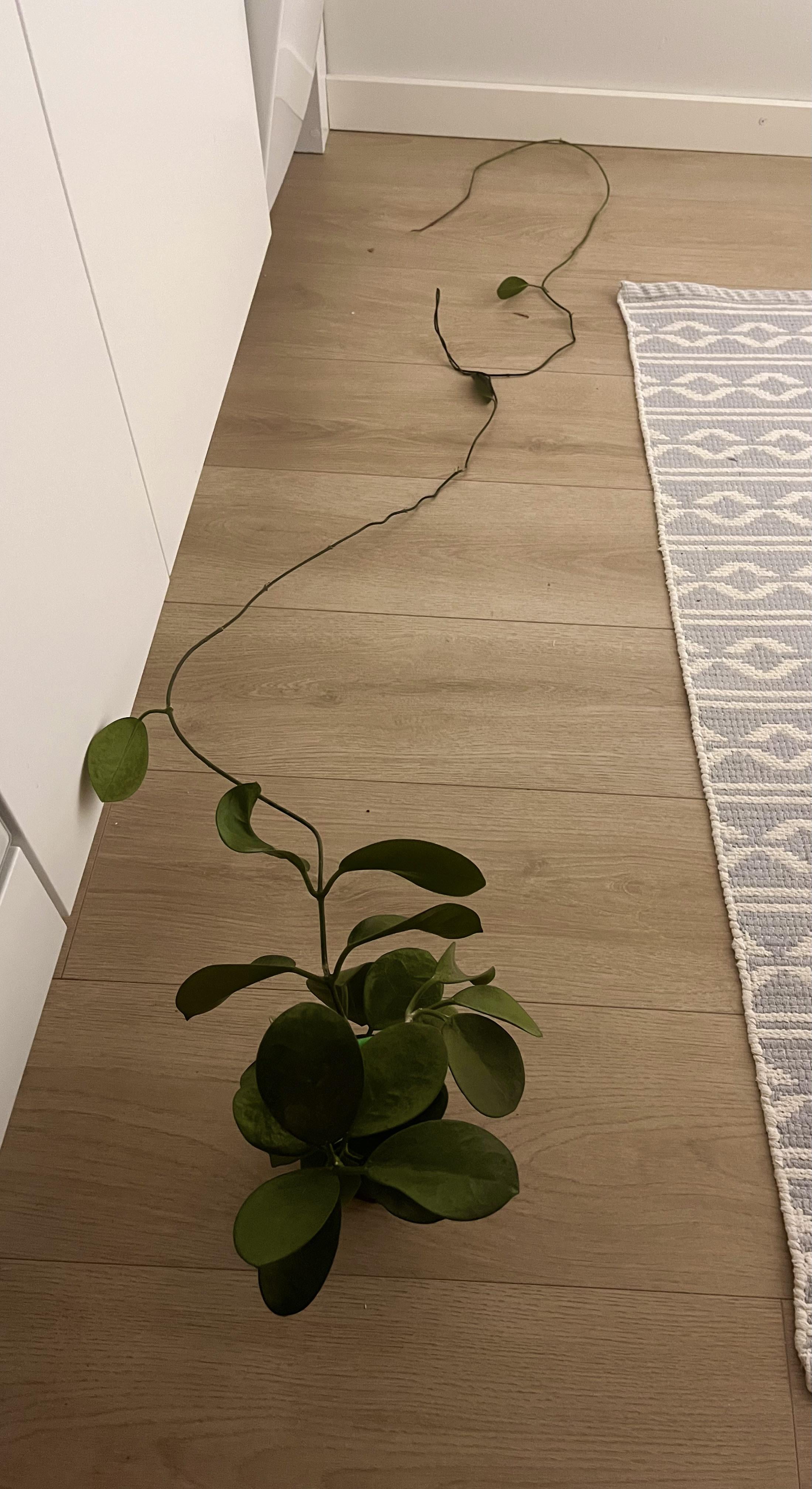 Ich wollte, dass sich das Hoya auf das Wachstum von Blättern konzentriert, nachdem es ein halbes Jahr lang getan hat, was auch immer das ist. Die Peitsche wuchs um mein hängendes Pflanzenregal herum und reichte bis zur Gardinenstange über dem Fenster. Sie ist ein Spinner und ich liebe sie.
