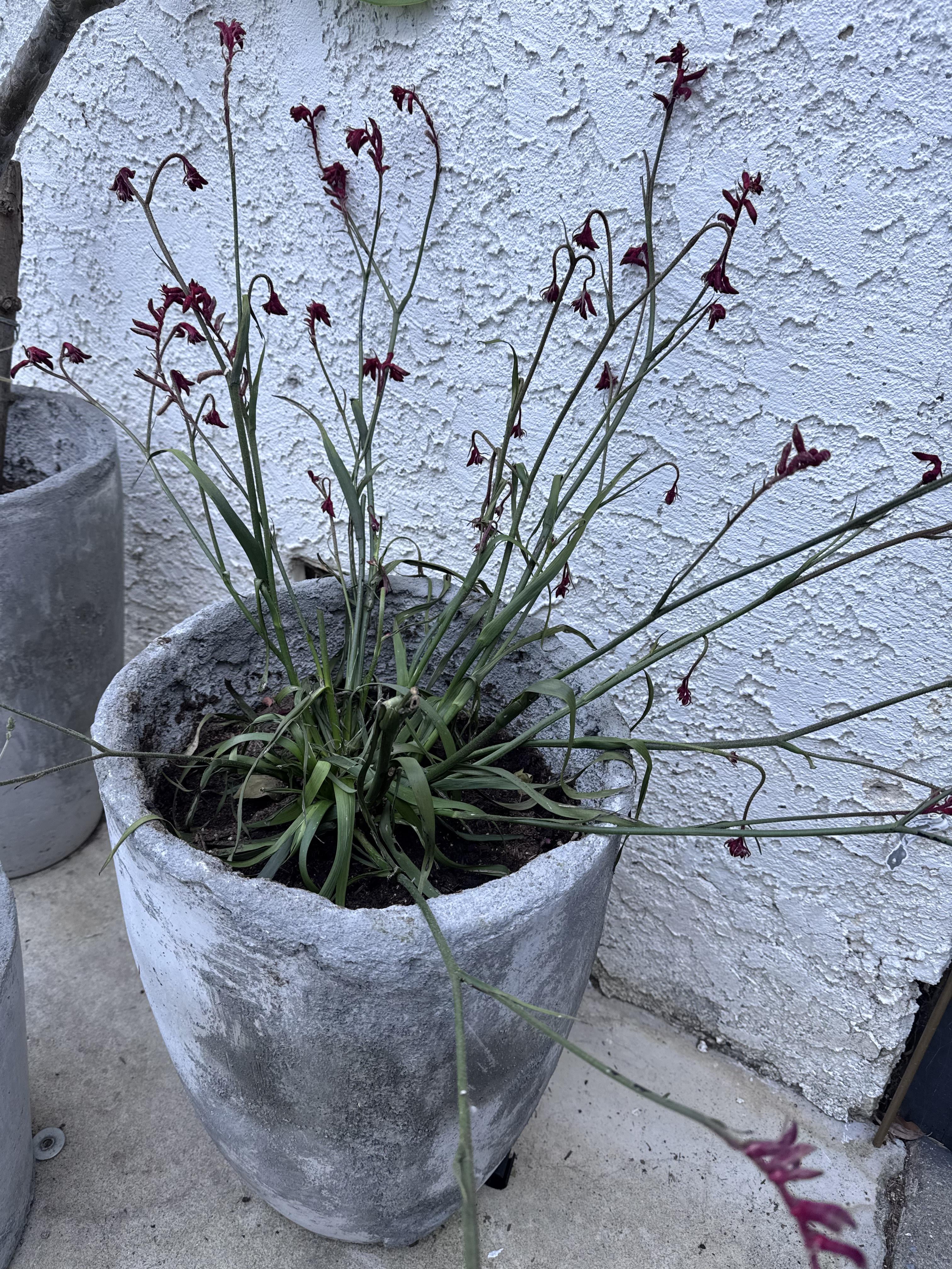 Ich habe diese Kangaroo Paw-Pflanze vor ein paar Tagen am Samstag gekauft und sie noch am selben Tag in dieses größere Pflanzgefäß aus Zement umgetopft. Nach dem Umtopfen schien es schön und üppig zu sein. Ich bin als Referenz in Südkalifornien.