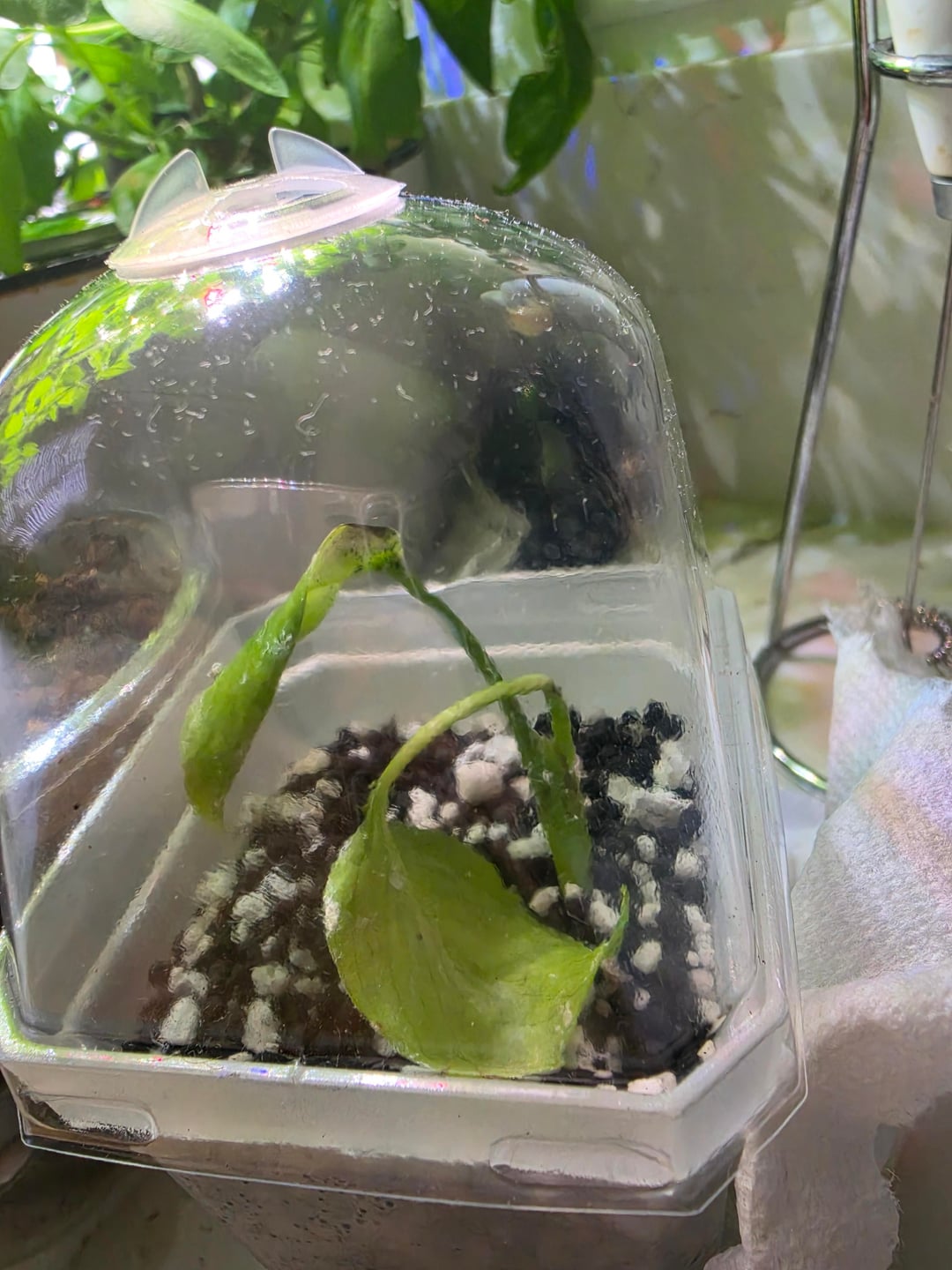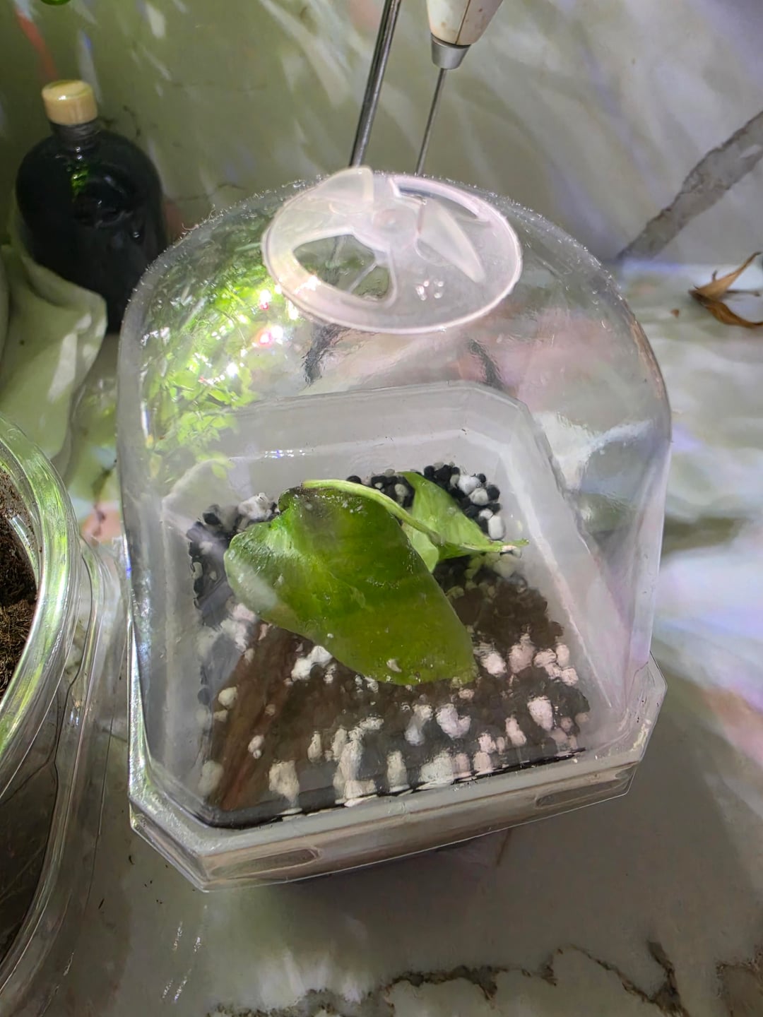 Neuling für seltene Indoor-Pflanzen hier: Ich habe diese Monstera-Bulbasaur-Gewebekultur von einer Tagung bekommen und bin mir nicht sicher, ob der schwarze Teil auf dem oberen Blatt Schimmel ist oder nicht. Es stand etwa zwei Wochen lang und ist seit der ersten Pflanzung deutlich munterer geworden. Ich habe das Gefühl, dass das zweite Blatt gebrochen ist. Wenn es Schimmel ist, bedeutet das, dass es tot ist, oder gibt es eine Möglichkeit, es wiederzubeleben? Außerdem dachte ich, das weiße Zeug sei Staub vom Perlit, aber mein Freund fragt sich auch, ob das Schimmel ist. Jede Hilfe wäre großartig! Danke!
