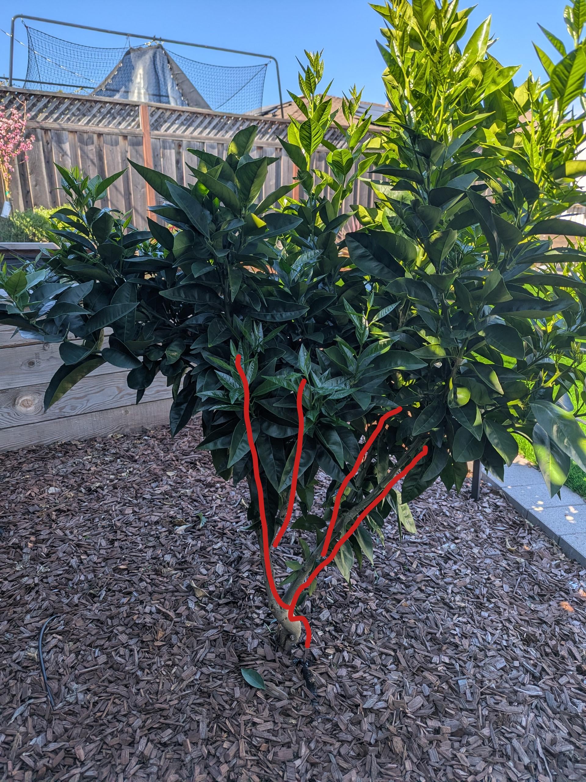 Hallo zusammen! Ich habe einen Blutorangenbaum und da es Frühling ist, habe ich vor, ihn zu beschneiden. Ich mache mir Sorgen, dass ich es vielleicht nicht richtig geformt habe, und es ist jetzt in vier Hauptabschnitte aufgeteilt (ich habe sie auf dem Foto mit roten Linien markiert).