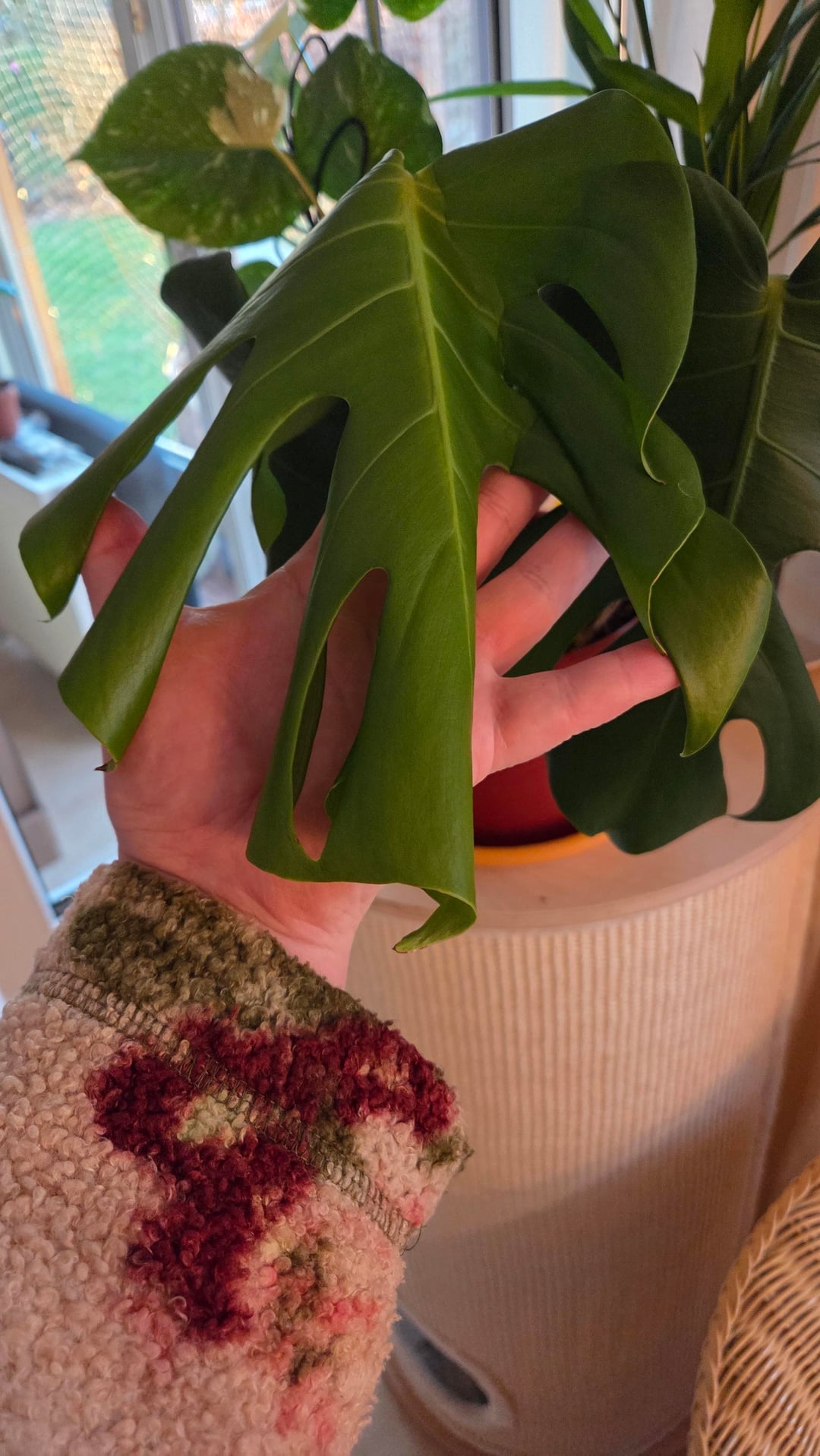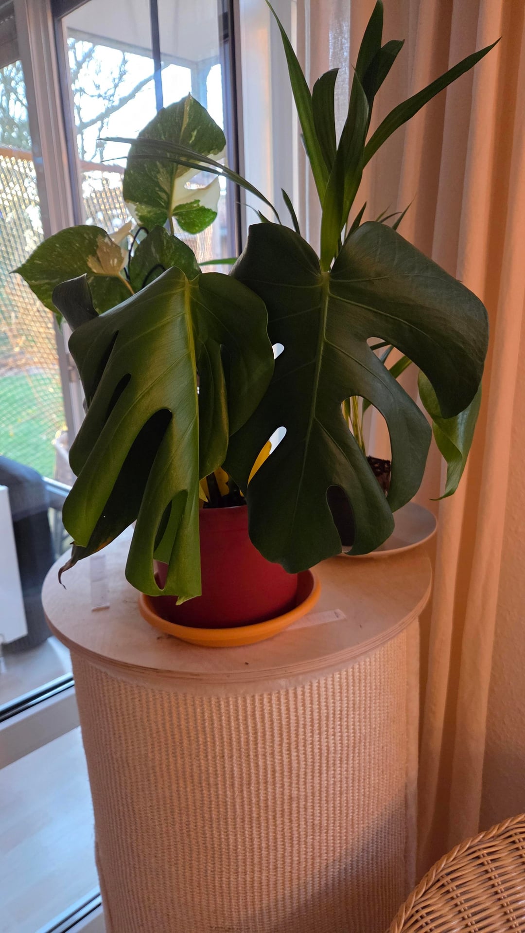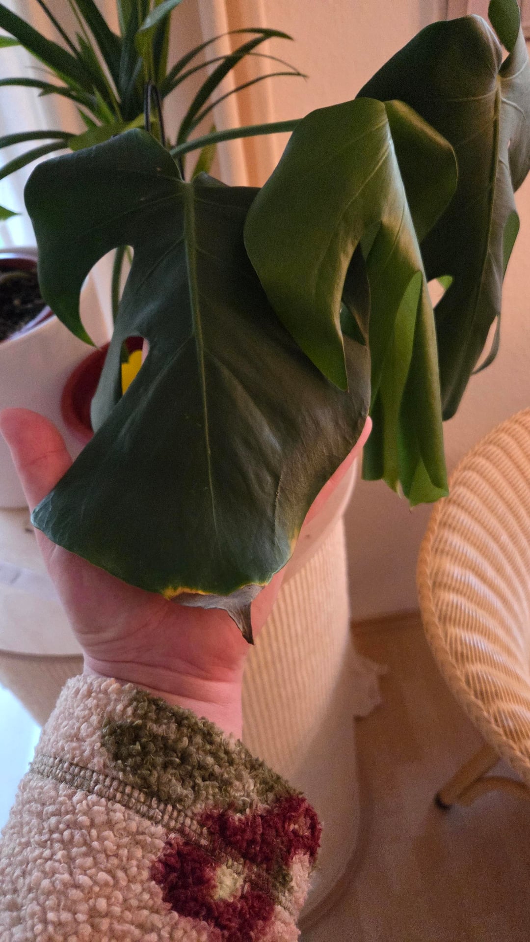 Gegossen wird, wenn die ersten 2-3cm trocken sind. Sie steht in einem Mix aus Zimmerpflanzenerde und Substrat. Unten im Topf ist eine Schicht Blähton. Ich beneble sie regelmäßig mit Wasser, da ich dachte, dass die Luftfeuchtigkeit zu gering ist.