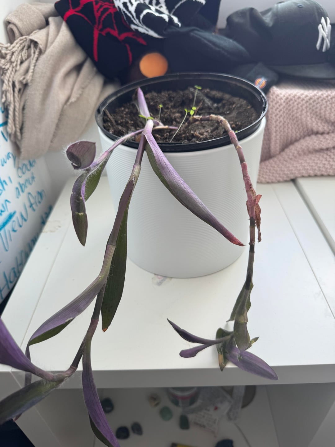 Hab diese Mexikanische Dreimasterblume (Tradescantia pallida) Ableger geschenkt bekommen, was bedeutet diese wollartige Erde 😥 Von: Prize-Duty-2095