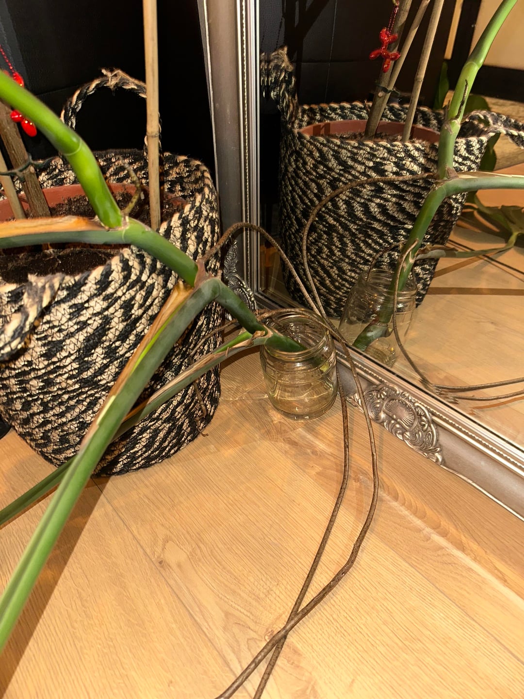 Ich würde vielleicht ein etwas größeres Gefäß nehmen und die unterste Luftwurzel auf so 10-20cm kürzen damit die komplett mit ins Wasser kann. Nach ein paar Wochen wenn sich da dann ca 10cm lange Wurzeln gebildet haben eintopfen. Ich persönlich nehme ganz normale Zimmerpflanzenerde gemischt mit gut viel Perlit. Unbedingt mit einer Ordentlichen Rankhilfe einpflanzen und an dieser fest binden (Moosstab oder Ähnliches). Da dieser Ableger ziemlich gerade ist sollte das super gehen. Und dann braucht es eigentlich nurnoch möglichst viel Licht.