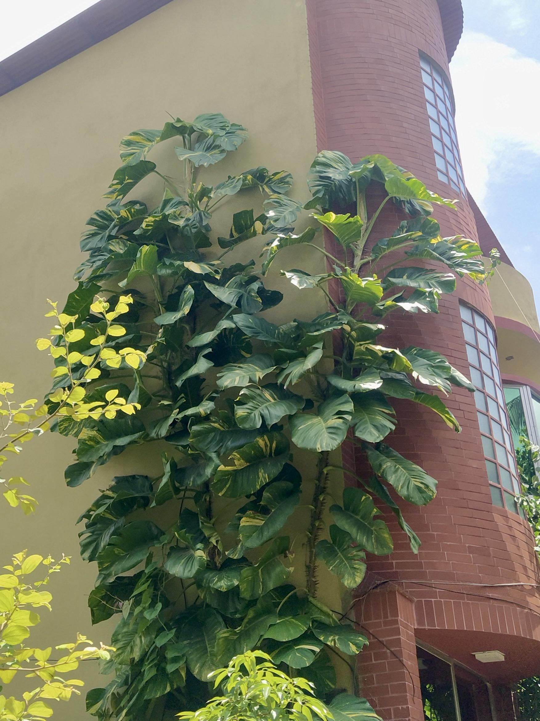Meine Mutter hat viele Pothos als Zimmerpflanze. Sie hat vor einiger Zeit einige Weinreben geschnitten und sie in die Seite unseres Hauses geworfen. Innerhalb von zwei Jahren verwandelte sich dieser Pothos in dieses wunderschöne Monster! 😍 Die Wurzeln sind so groß und breit. Allerdings wird uns empfohlen, es abzuholzen, da es die Mauern zerstören könnte. Aber schauen Sie sich diese Schönheit an.