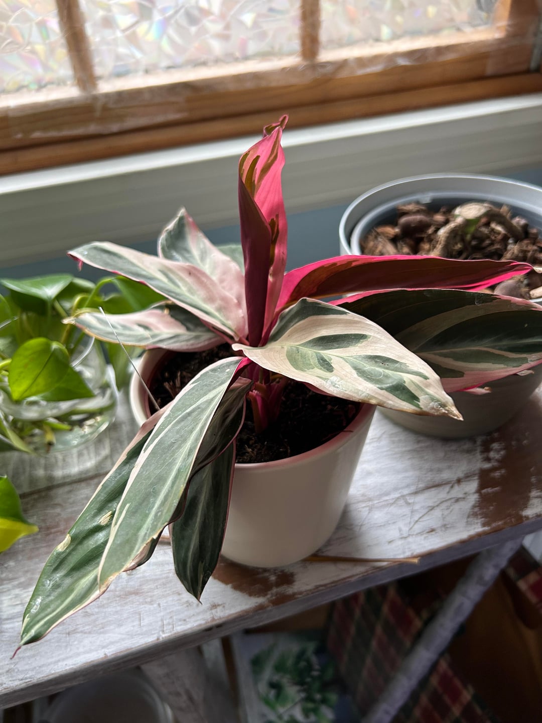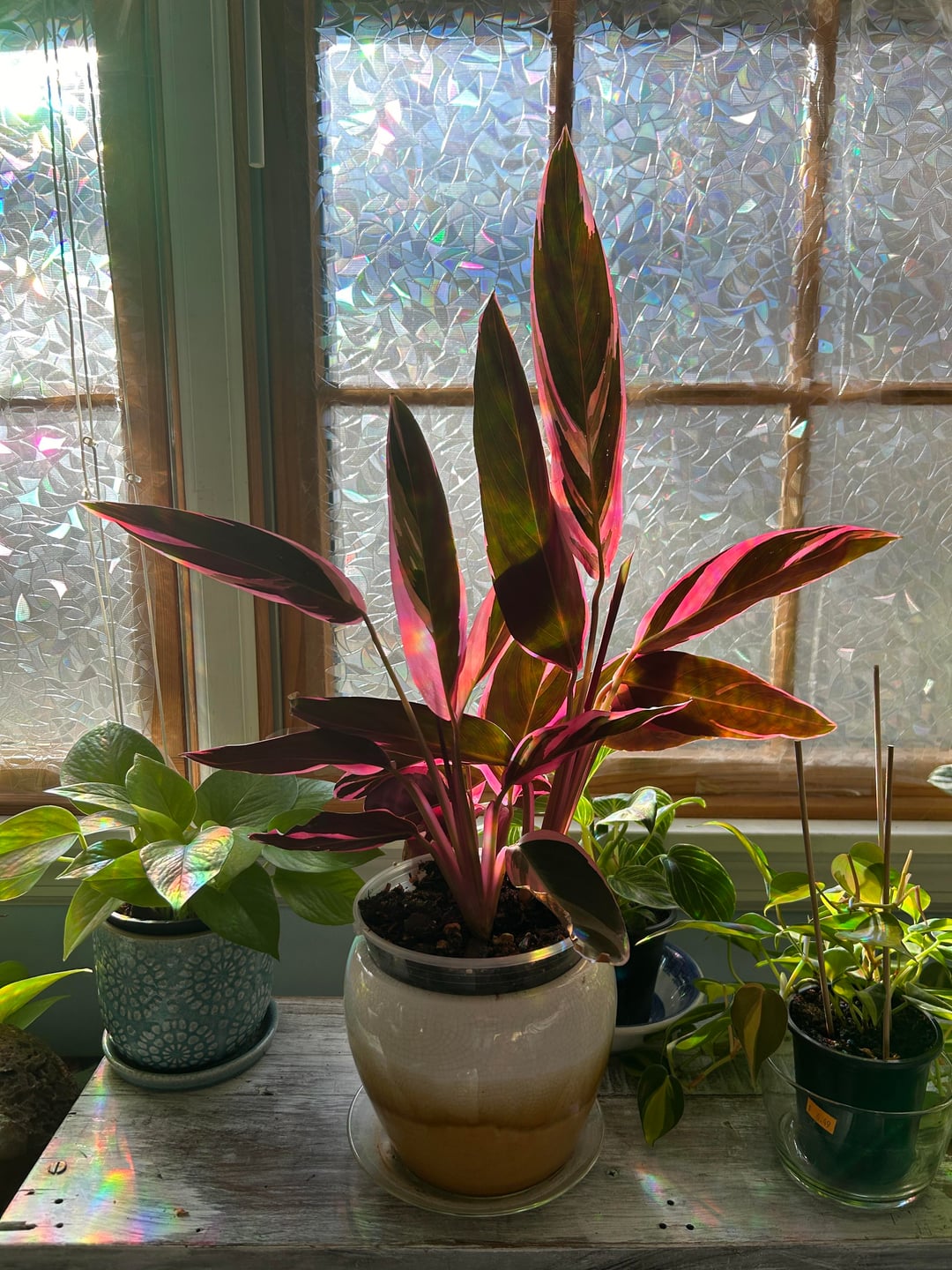 Sie hat hier und da ein paar Blätter verloren, aber insgesamt scheint sie ziemlich glücklich zu sein! Früher tanzten die Blätter viel mehr herum, aber jetzt bleiben sie zum Fenster gerichtet. Eine meiner Lieblingspflanzen – meine Mutter hat sie in einem Lebensmittelgeschäft gefunden und für mich gekauft. Ich wusste vor diesem Tag nichts über Stromanthe! Wunderschöne Pflanze. Ich kann es kaum erwarten zu sehen, wie sie weiter wächst