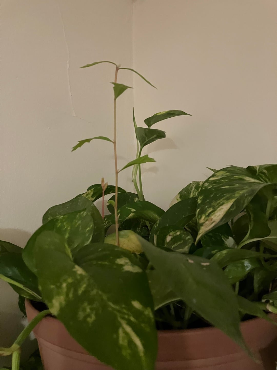Ich habe diesen Pothos (ich bin mir nicht sicher, welche Sorte; ich habe ihn von einem Freund bekommen, der ihn im Freien hielt) seit Dezember. Es ist WIRKLICH gut gewachsen, seitdem hat es seine Größe fast verdoppelt, aber jetzt ist es März und ich habe zufällig einen neuen Trieb mit einem rosafarbenen Stiel und Blättern, die völlig anders aussehen, herauskommen lassen. Ich bin ein Pflanzen-Idiot und war schockiert über meine Fähigkeit, diesen Pothos bisher am Gedeihen zu halten, also bin ich wirklich verblüfft.