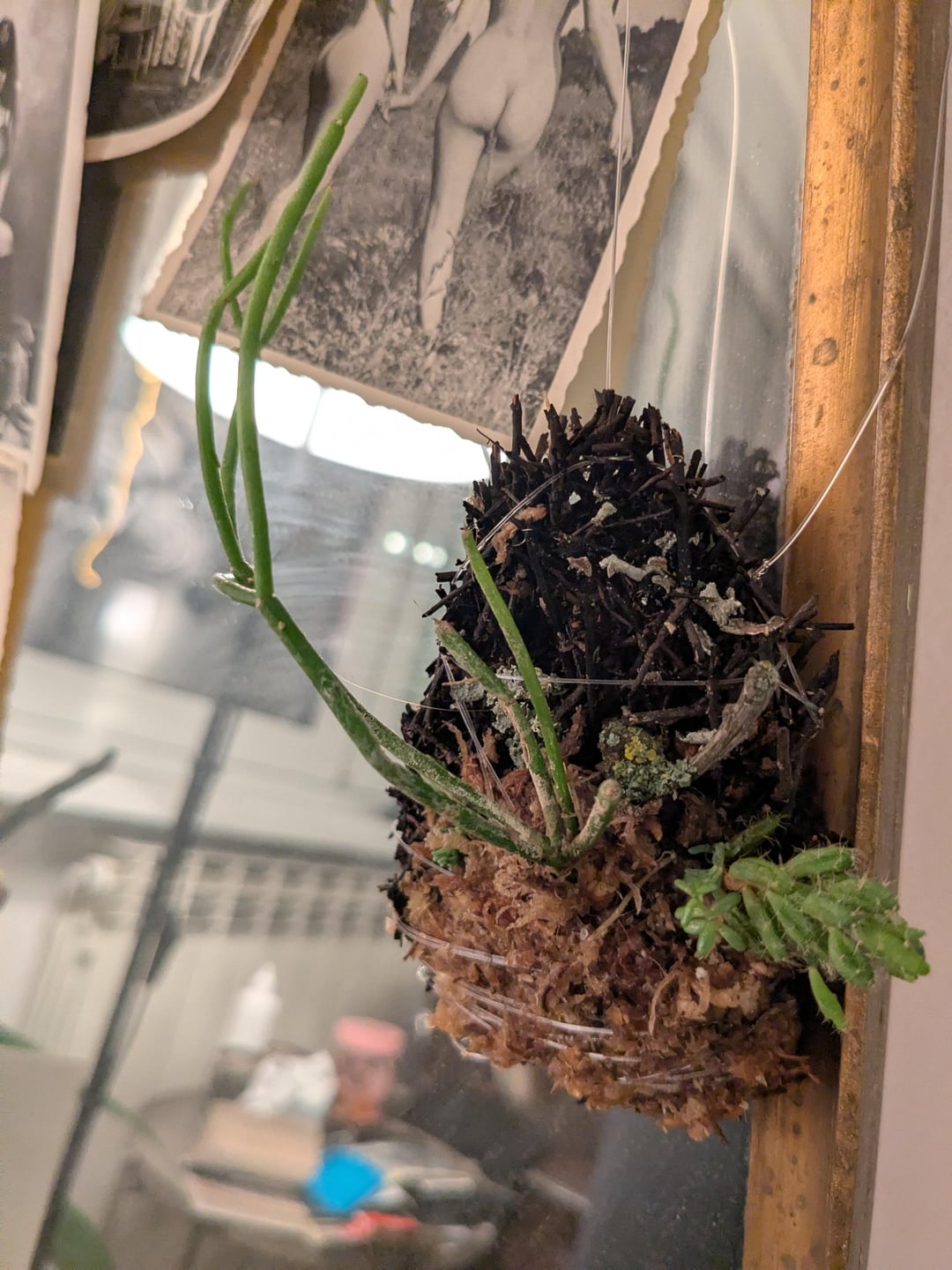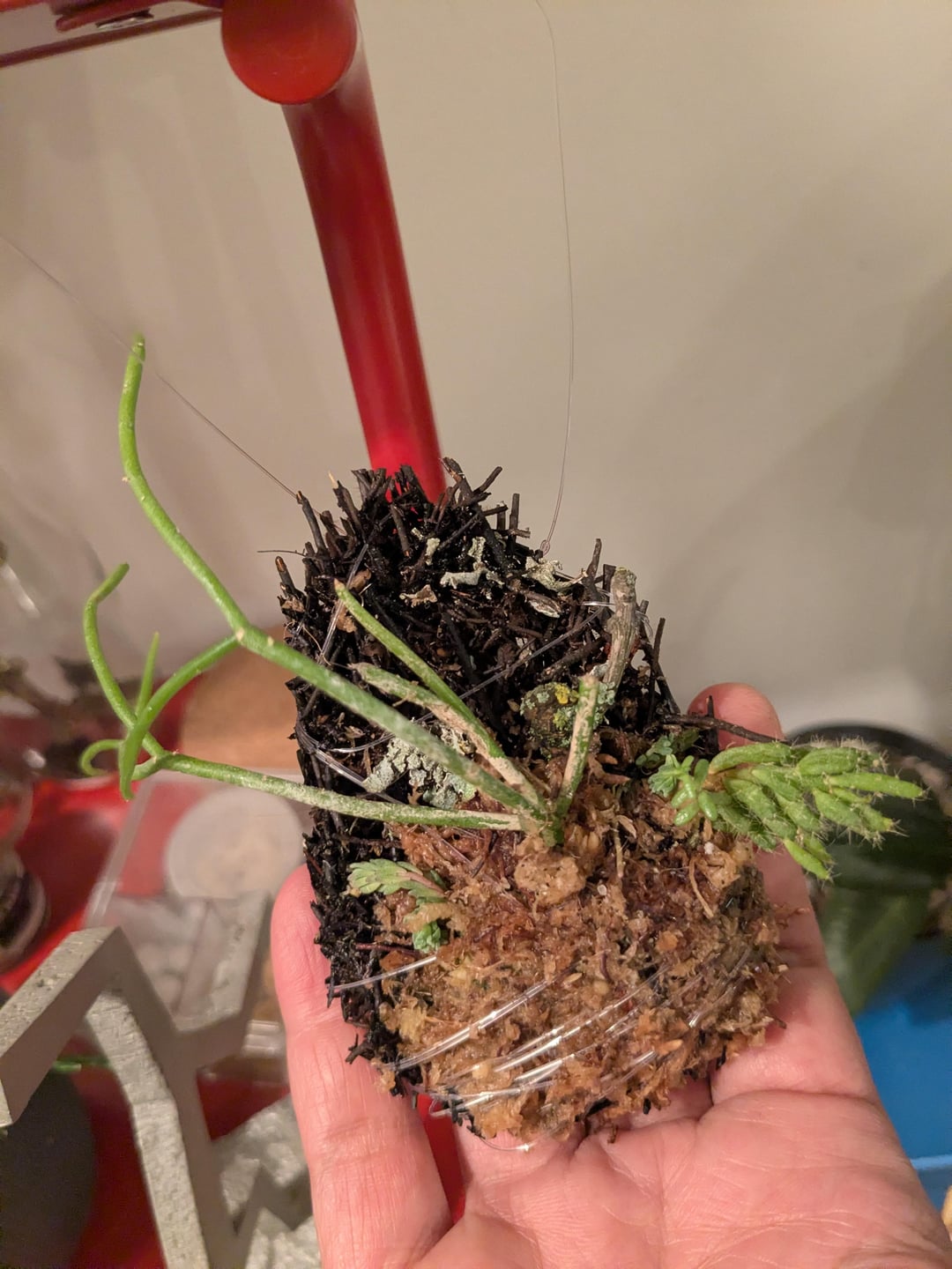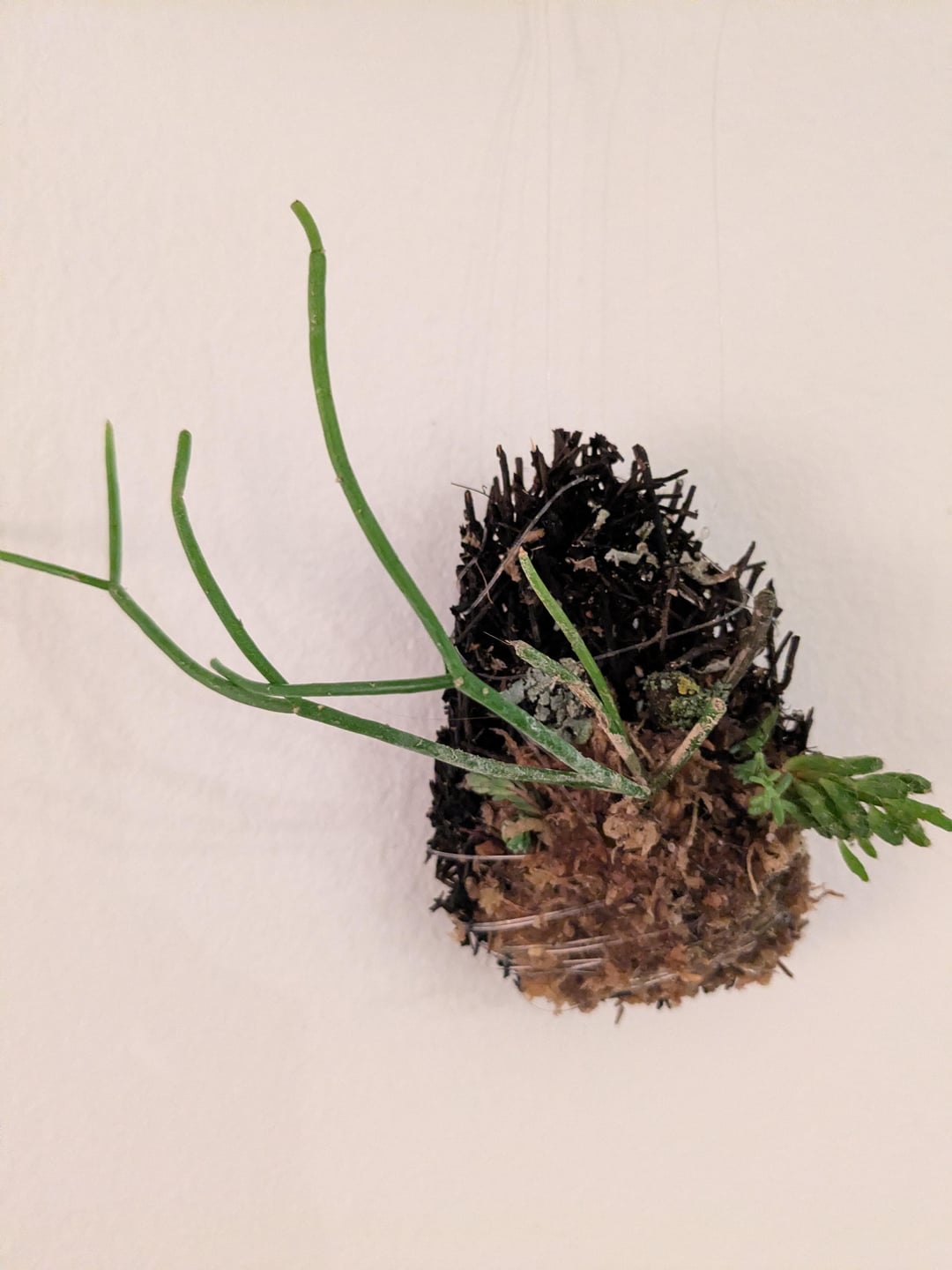 Ich habe vor einiger Zeit einen kleinen Xaxim-Teller (Baumfarn) in meiner Supstrata-Box gefunden, als ich versuchte, Miniorchideen zu züchten (hat nicht gut geklappt) und beschlossen habe, so etwas wie ein Kokedama/Tamandama auszuprobieren, aber mit einer Xaxim-Basis und Spaghnummoos. Verwendete Pflanzen: zwei Arten von Rhipsalis, zwei Arten von Sedums und ein kleiner Zweig mit Flechten. Mal sehen, wie es klappt!