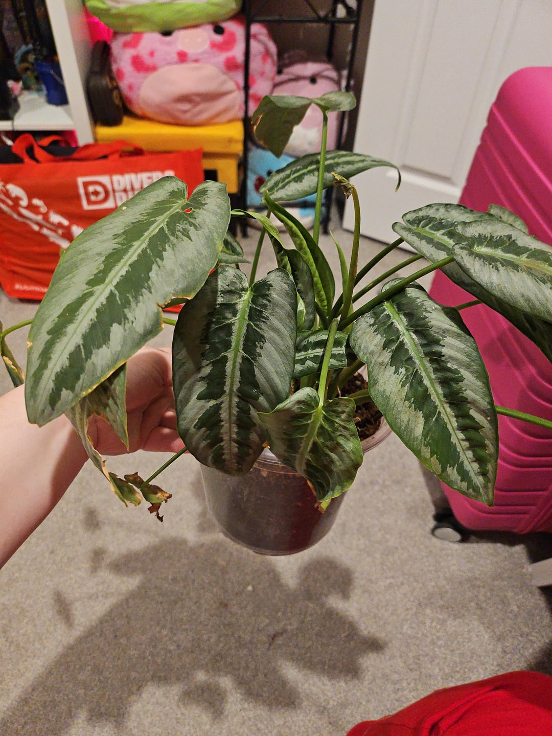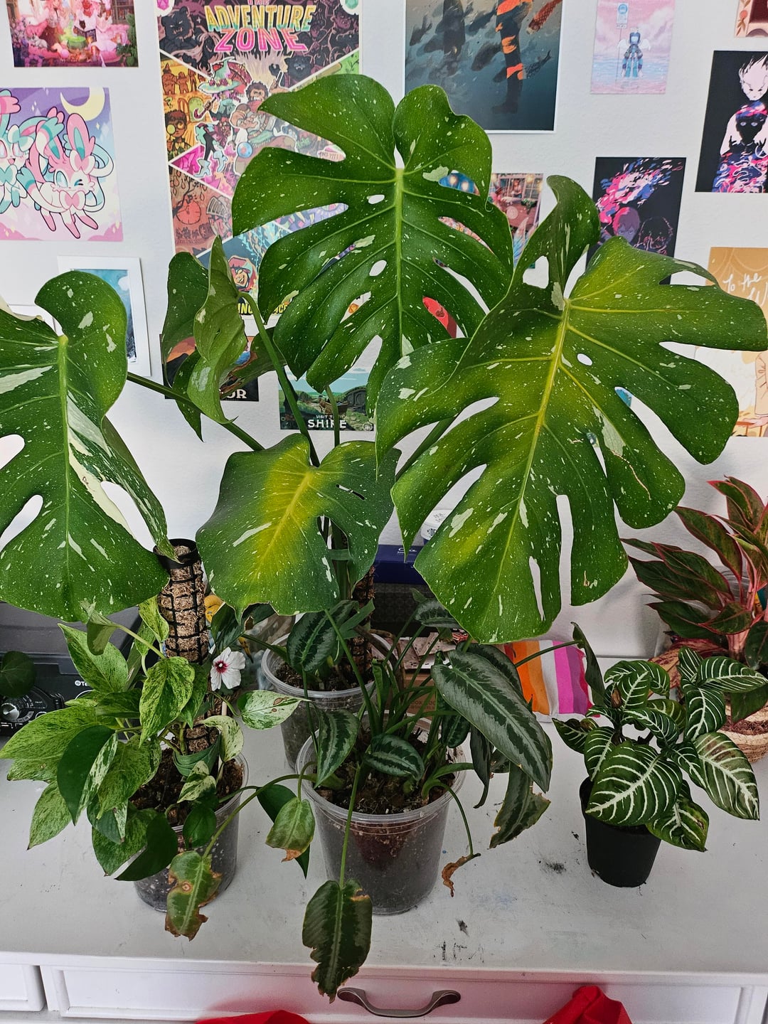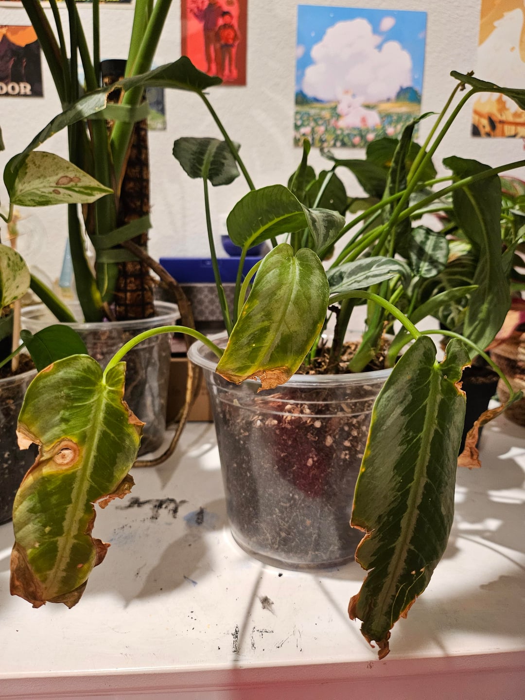 Der Stiefvater meines Freundes verschenkte einige seiner Pflanzen, die einen Sonnenbrand hatten. Ich nahm ein paar und stellte fest, dass sie wahrscheinlich eine speziellere Pflege benötigen, als ich es gewohnt bin. Ich weiß, dass es sich bei der linken um einen Pothos handelt, und bei der großen um ein thailändisches Sternbild, und bei der kleinen auf der linken Seite bin ich mir ziemlich sicher, dass es sich um eine Zebrapflanze handelt. Meine Pflanzenerkennungs-App kann mir überhaupt nichts über den mittleren Kerl sagen und sagt mir, dass es sich bei dem auf der vierten Folie um Pothos handelt, aber ich glaube nicht, dass das so ist?