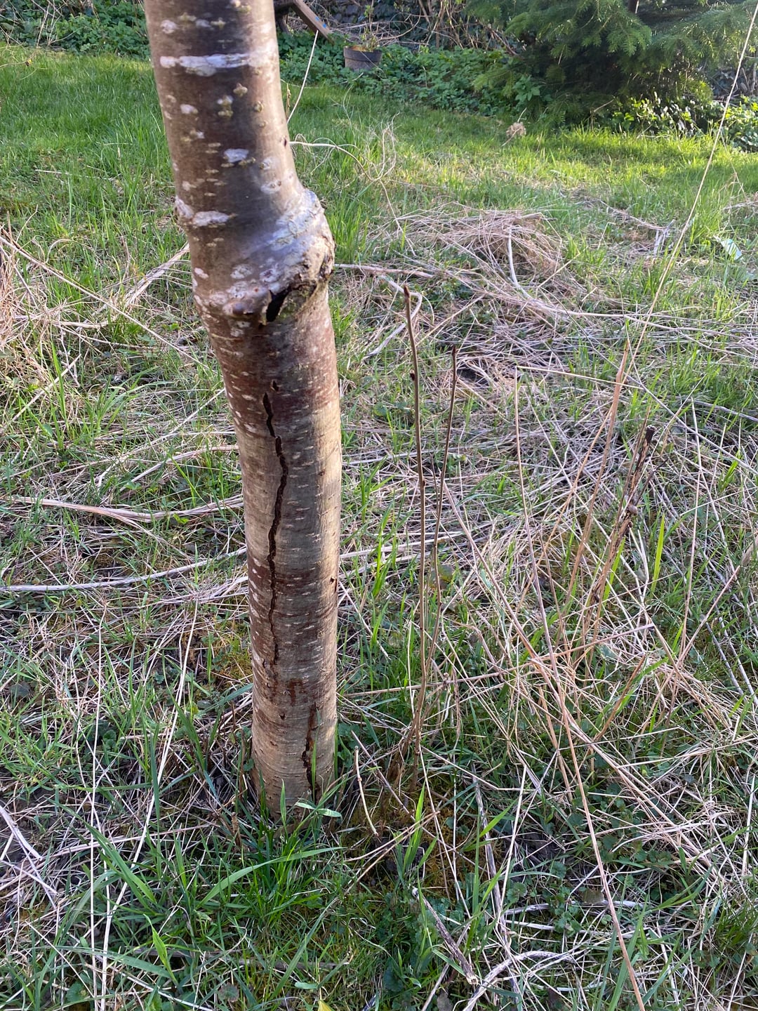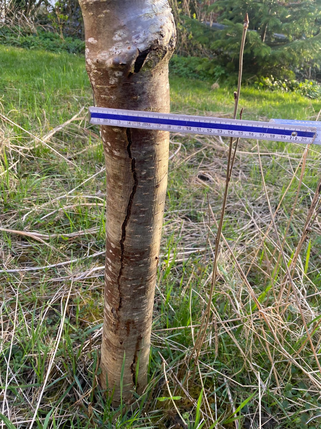 Die Eberesche Sorbus aucuparia ist nun 8 Jahre alt und wächst seither sehr gut und schnell. Seit letzten Herbst ist jedoch die Rinde unterhalb der Veredelungsstelle aufgerissen. Sogar eine faule, weiche Stelle hat sich gebildet. Standort ist mäßig bis stark sonnig.