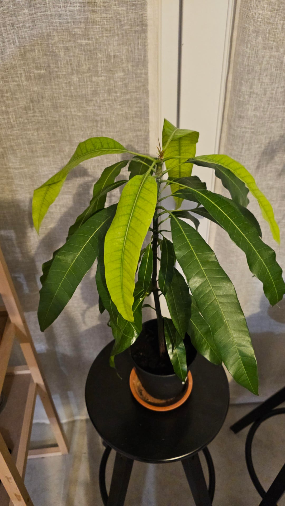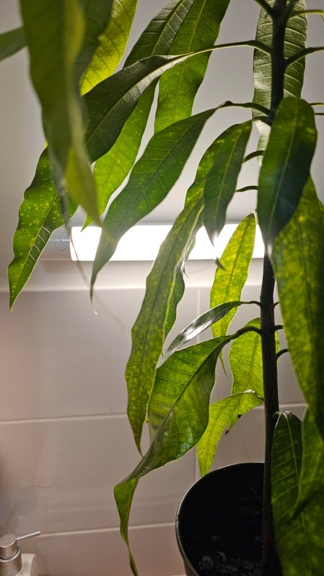 Ich züchte drinnen einen Mangobaum im Topf und habe einige besorgniserregende Symptome festgestellt, zu denen ich gerne Ihre Meinung hören würde.