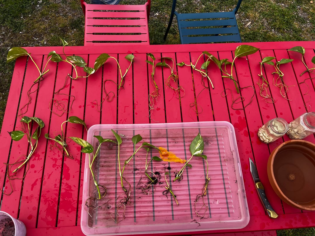 Ich fange an, meine Pothos-Stecklinge in die Erde zu stecken, weil sie wunderschöne Wurzeln gebildet haben.