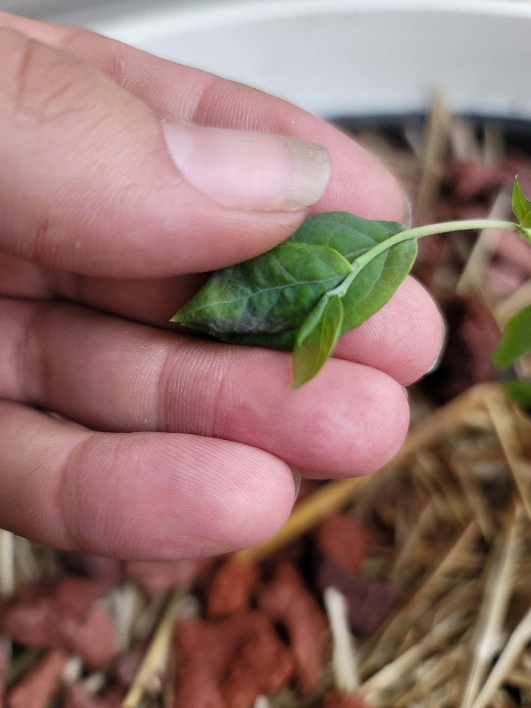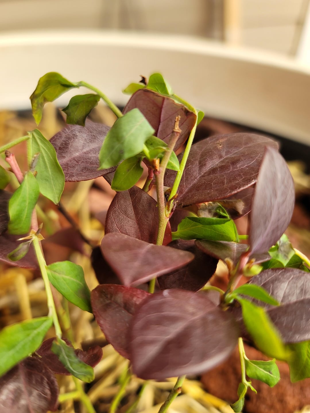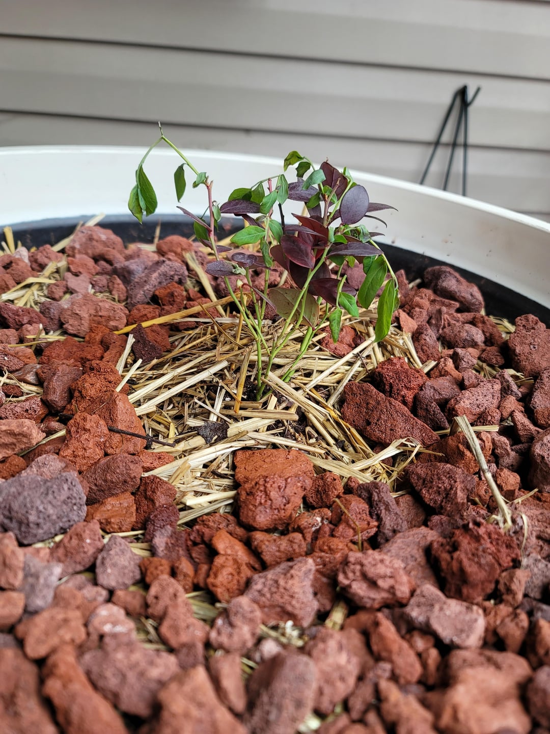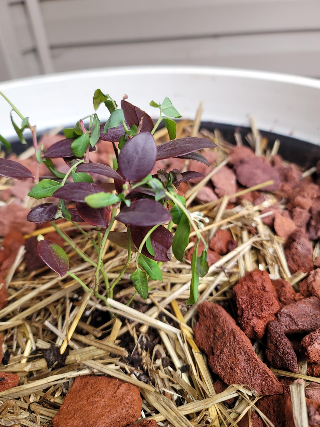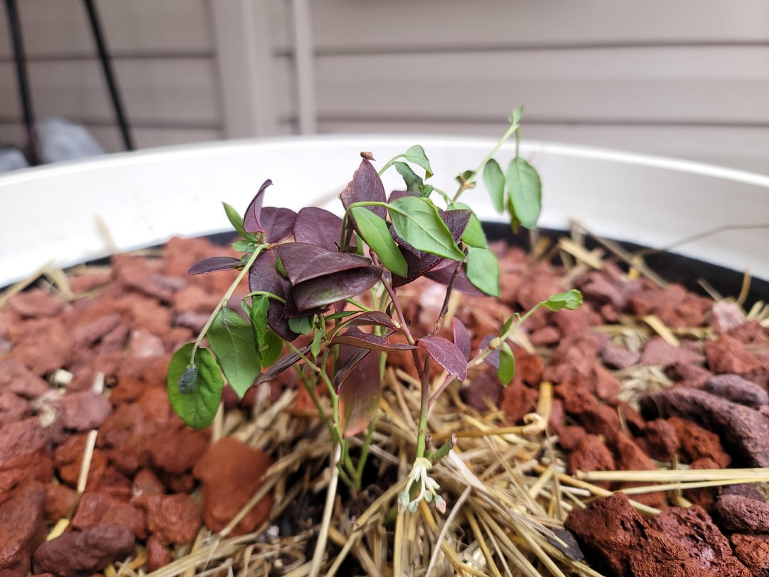 Vor ungefähr 5 Tagen bis einer Woche habe ich das gepflanzt "Rosa Glasur" Blaubeere in diesem großen Behälter. Er befand sich in der Kühlbox, um das Wachstum zu verlangsamen, da er offensichtlich die Ruhephase in der Traktorenversorgung, bei der ich ihn besorgt hatte, durchbrochen hatte. Ihm ging es gut (aber ich habe ihn am nächsten Morgen an einem Tag mit heftiger Hitzewelle direkt in die direkte Sonne gesetzt und er ist verwelkt, hoppla), aber ich hatte ihn nur einmal gegossen, weil der Bodenmesser anzeigte, dass er alle fünf Tage völlig nass war und ich nicht wollte, dass er im Wasser saß.