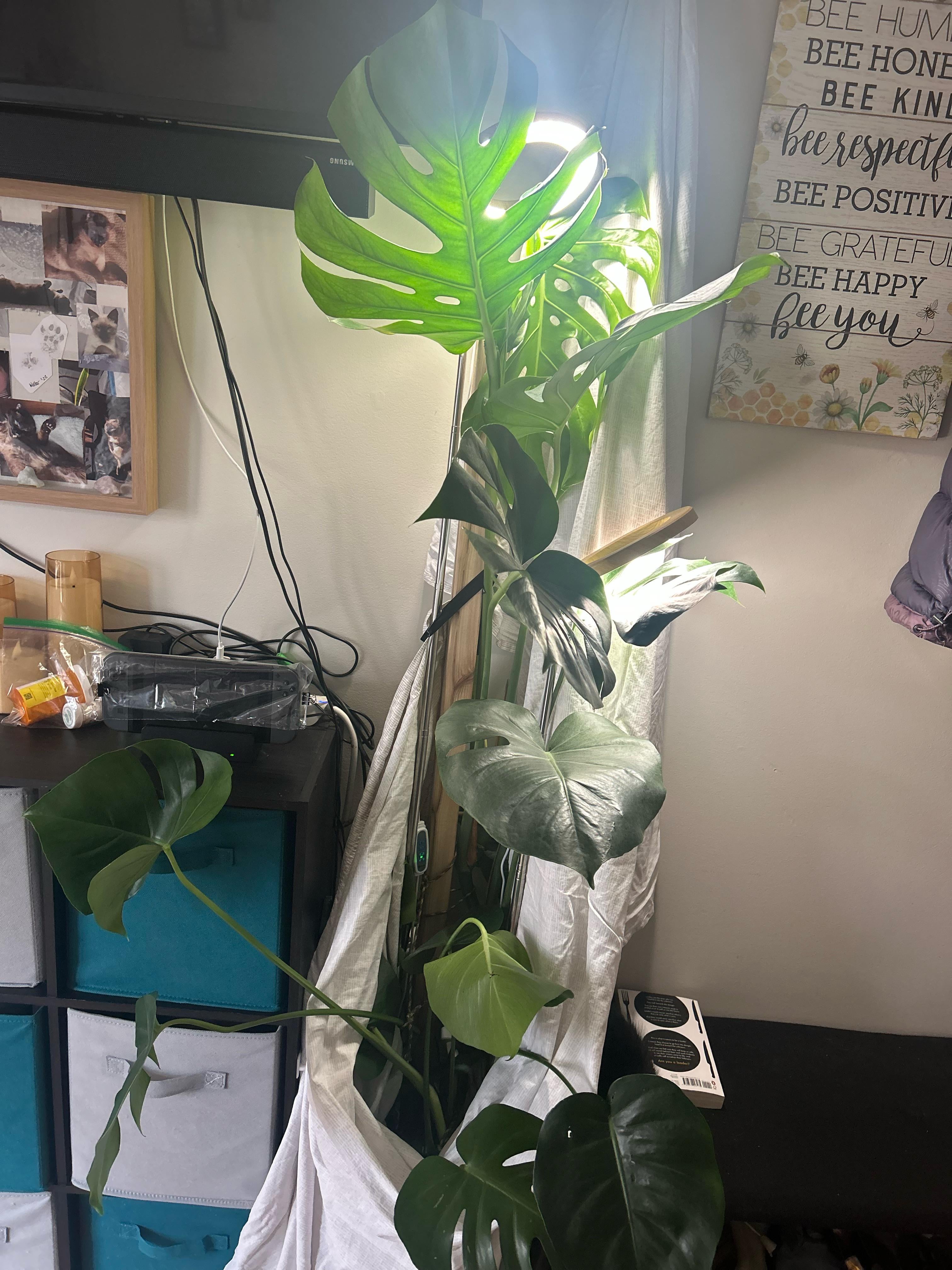 Ich habe gerade ein neues Kätzchen bekommen und sie denkt, die Monstera-Blätter seien Spielzeug (sie frisst sie nicht, sondern springt nur und greift sie an). Auf jeden Fall! Meine Monstera blühte so glücklich und jetzt muss ich sie burritieren, um weiteren Schaden zu verhindern. Sie hat bereits ein Blatt abgerissen und ein neu keimendes Blatt abgetötet.