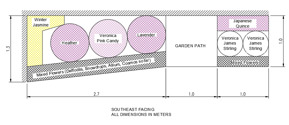 Der Boden ist kalkhaltig und ziemlich schwer, scheint aber gut zu entwässern. Ich habe noch nie stehendes Wasser gesehen. Jasmine und Quitte werden die Wände hochklettern.